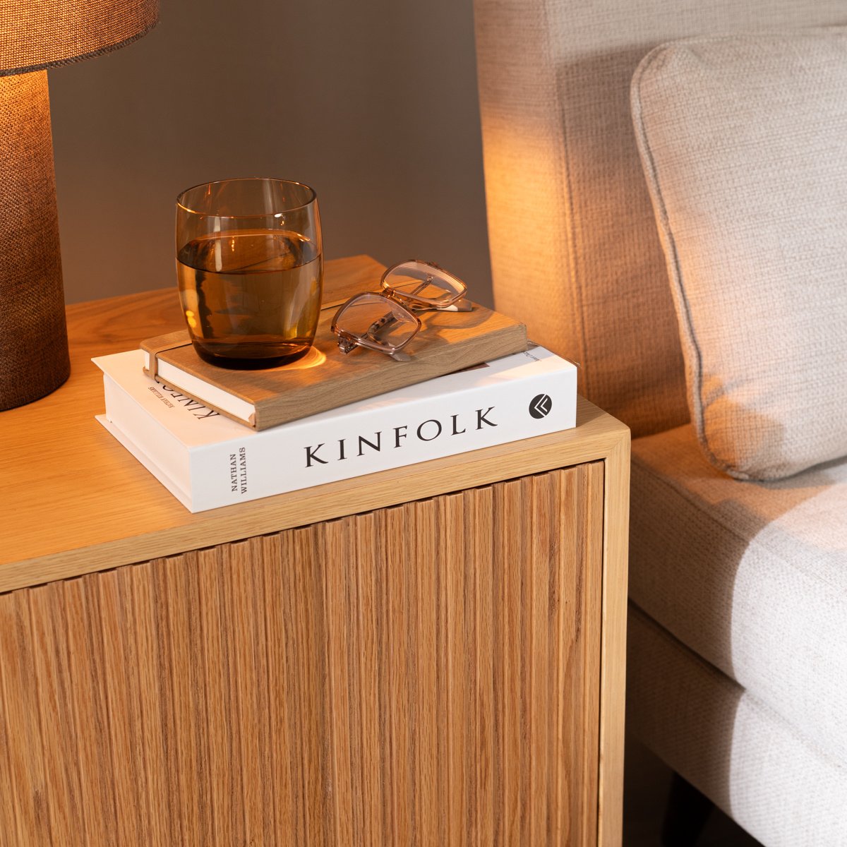 Het nachtkastje is gemaakt van rubberwood, oftewel rubberhout, en bekleed met eikenfineer. Rubberhout is één van de meest ecologische houtsoorten. Rubberbomen worden eerst gebruikt voor de productie van rubber en pas wanneer deze productiecyclus volledig afgelopen is, wordt het hout dat overblijft gebruikt om meubels en andere voorwerpen van te maken. De dunne laag eikenhout waarmee het meubel is afgewerkt, geeft de nachttafel een robuuste uitstraling.