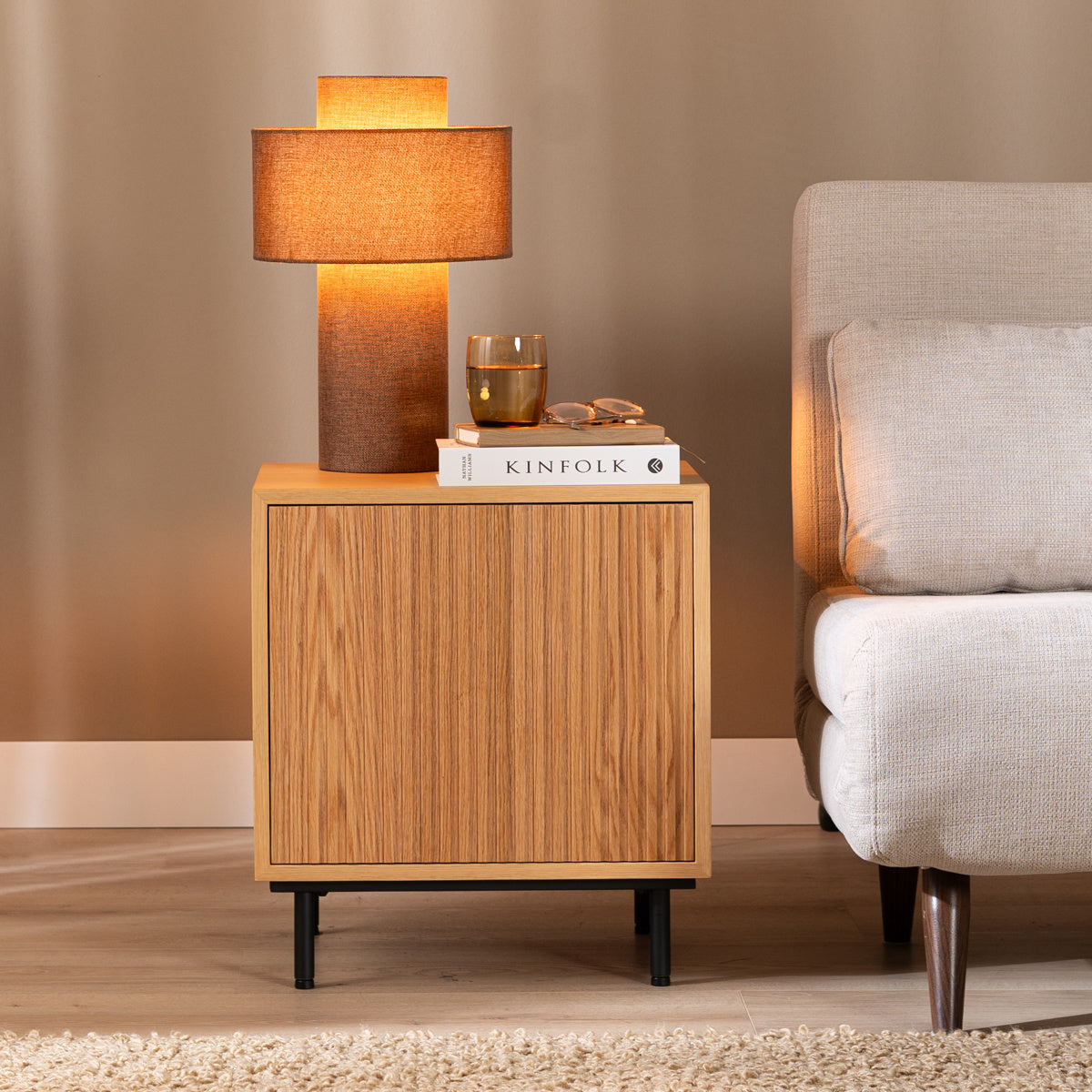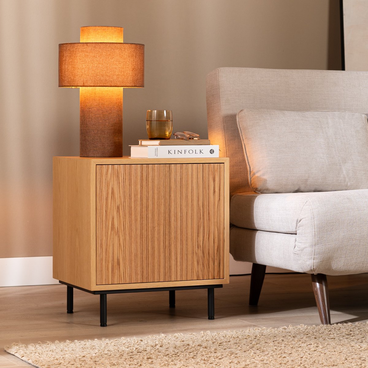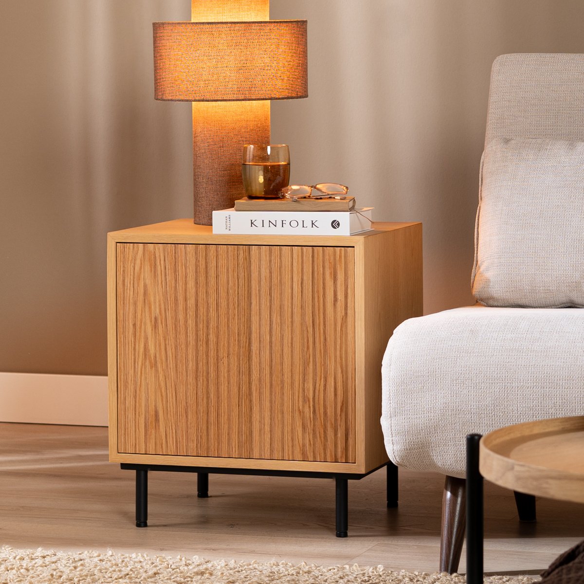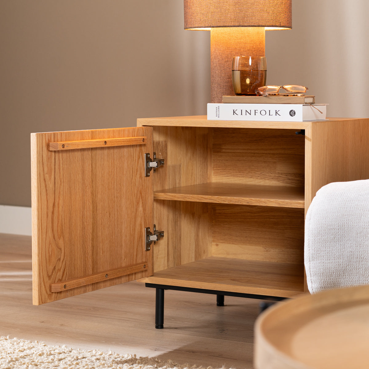 Nachtkastje Shelly is gemaakt van rubberhout met een laag eikenfineer, waardoor het meubel een rustieke uitstraling heeft. Er zit een verstelbare plank in het kastje, waardoor je voldoende opbergruimte hebt voor de spullen die je graag binnen handbereik hebt, maar niet in het zicht wil hebben liggen.