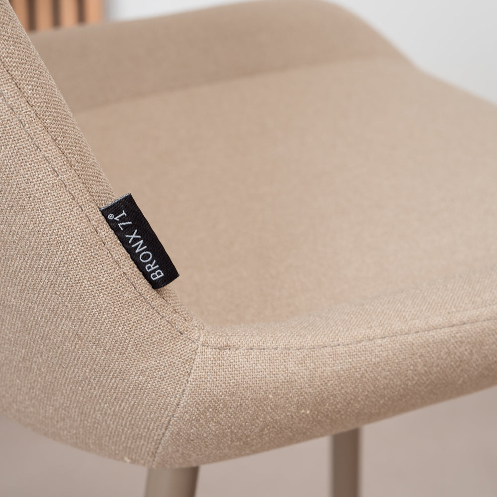 Het unieke aan barkruk Maud is dat het frame is uitgevoerd in een taupe kleur gemaakt van gepoedercoat metaal. Barkruk Maud is te verkrijgen in taupe en beige en ook beschikbaar als eetkamerstoel.