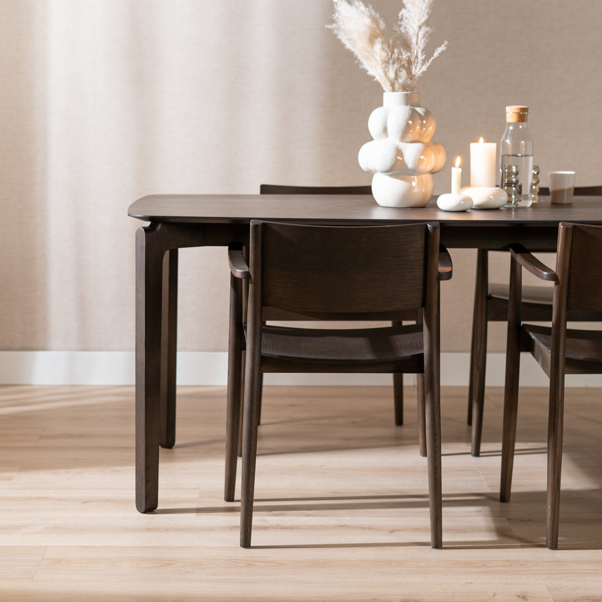 De stoel bevat een laag eikenfineer. Eikenfineer staalt warmte uit en is duurzaam. Eikenfineer is gevoelig voor krassen en deuken dus het is belangrijk om de eetkamerstoel goed te beschermen. Het is ook een goed idee om het meubel uit direct zonlicht te houden omdat dit de kleur van het fineer na verloop van tijd kan vervagen. Daarnaast is eikenfineer wel erg sterk, het buigt niet en trekt niet krom. De zitting en de rugleuning zijn gemaakt van multiplex met een laag fineer en het frame is gemaakt van 100% massief eiken.