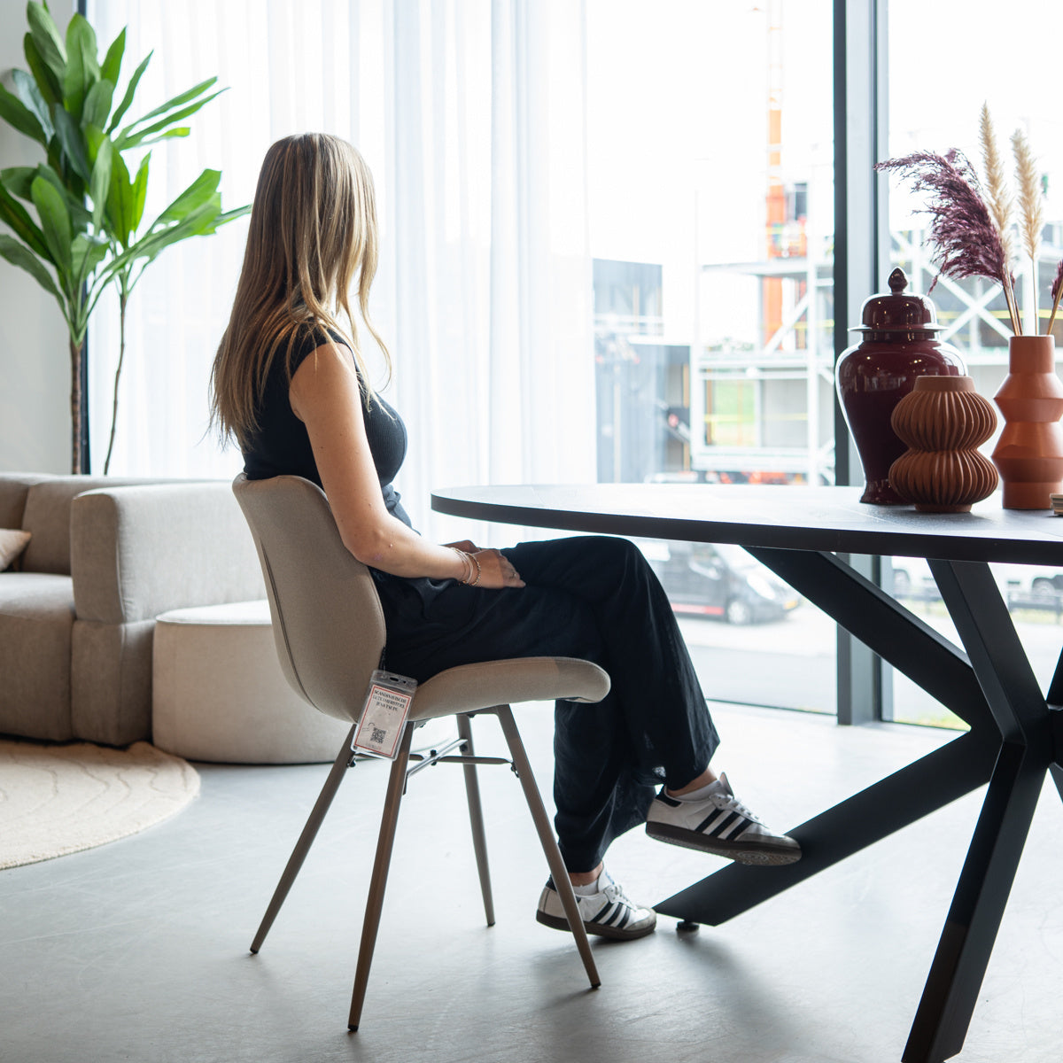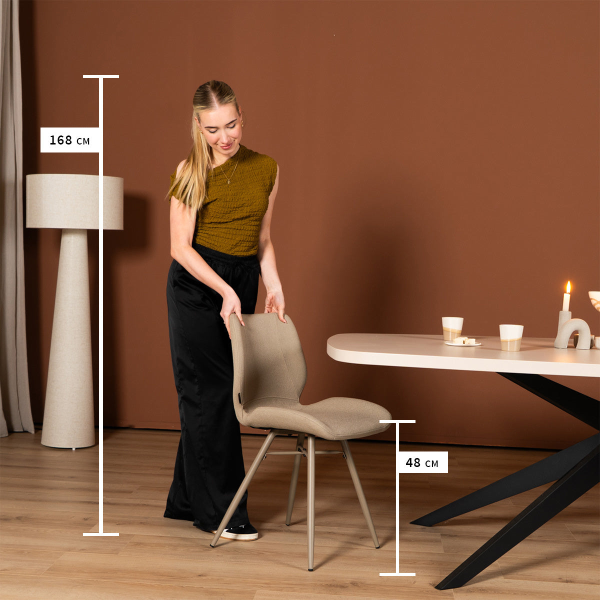 Het unieke aan eetkamerstoel Jena is het taupekleurig onderstel. Deze kleur is aangepast naar de stof en geeft de stoel een minimalistische uitstraling. De stof is gemaakt van 100% gerecyclede plastic flessen. Hieruit is een stevige polyester stof ontstaan welke ook nog eens waterafstotend is. Je hoeft je geen zorgen te maken wanneer je koffie of wijn knoeit. Je neemt de vloeistof gemakkelijk af met een vochtige doek, waarna je ook geen vlekken ziet. Het onderstel is gemaakt van een gepoedercoat metalen frame. De stoel is hierdoor erg stevig. Zo kun je jaren lang genieten van goede kwaliteit.