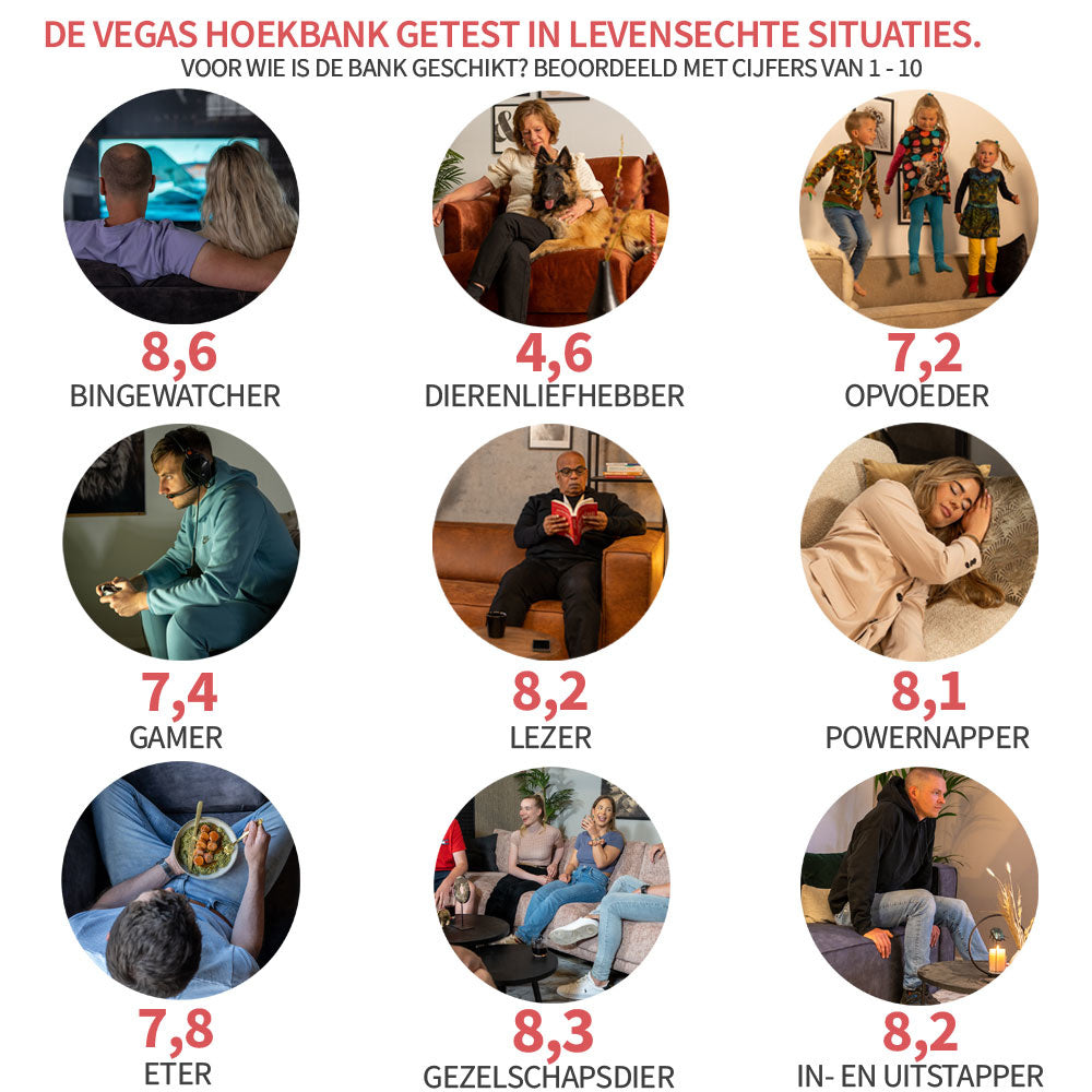 De hoekbank bestaat uit drie delen die je in elkaar kunt haken. Doordat de bank uit drie delen bestaat is de hoek zowel links als rechts te plaatsen. De Vegas bank is verkrijgbaar in verschillende kleuren en materialen.