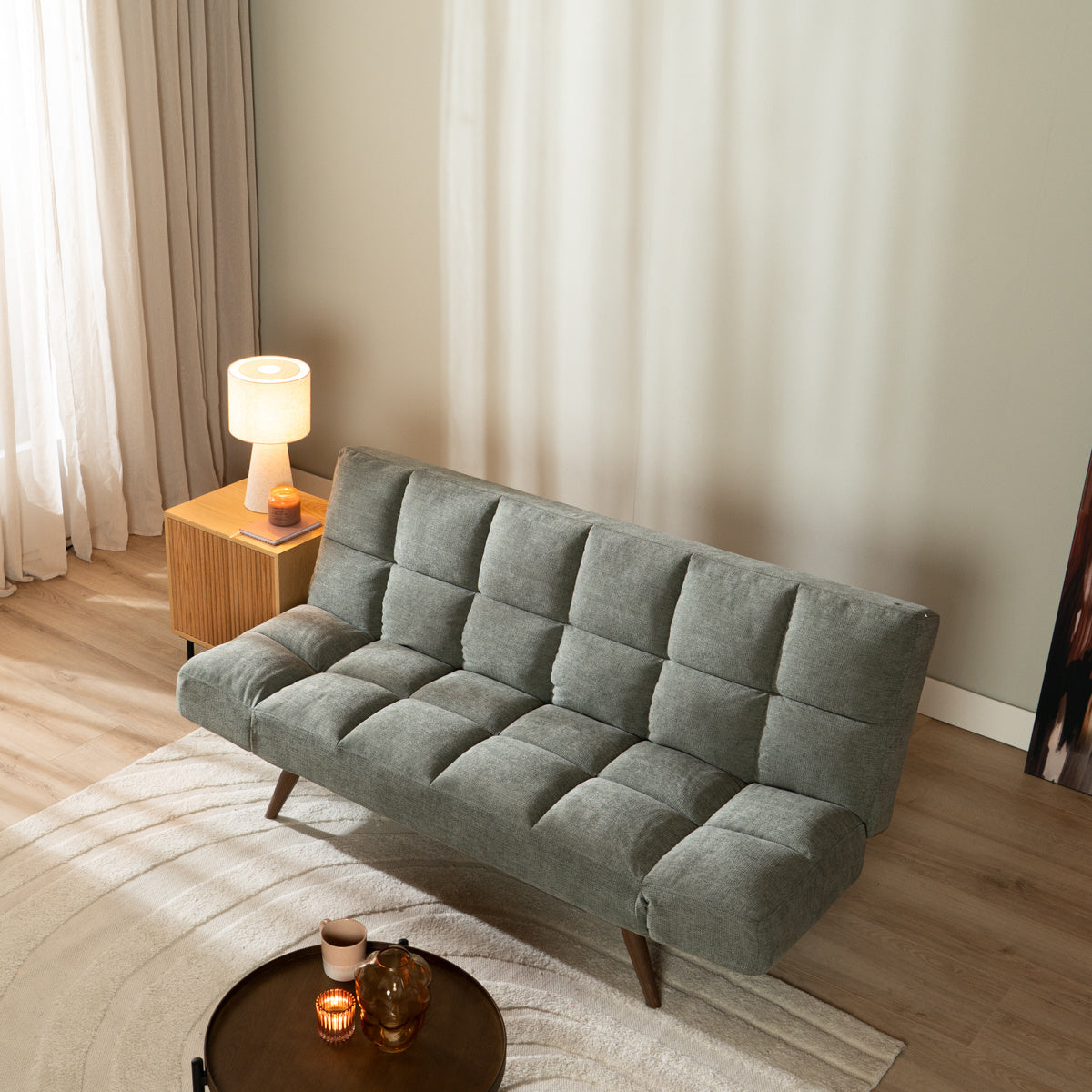 - De poten voor de slaapbank zijn netjes achter een rits weggewerkt.
