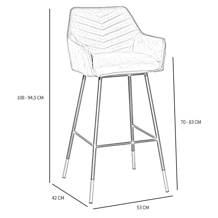 Het onderstel is gemaakt van zwart gepoedercoat metaal waardoor de kruk erg stevig en stabiel staat. De chique gouden pootjes maken dat je de hoogte van de kruk zelf kunt bepalen. De bijgeleverde pootjes zijn gemakkelijk onder het onderstel te draaien. De armleuningen en de dikke zitting maken de barkruk super comfortabel. Zo kun je uren blijven zitten.