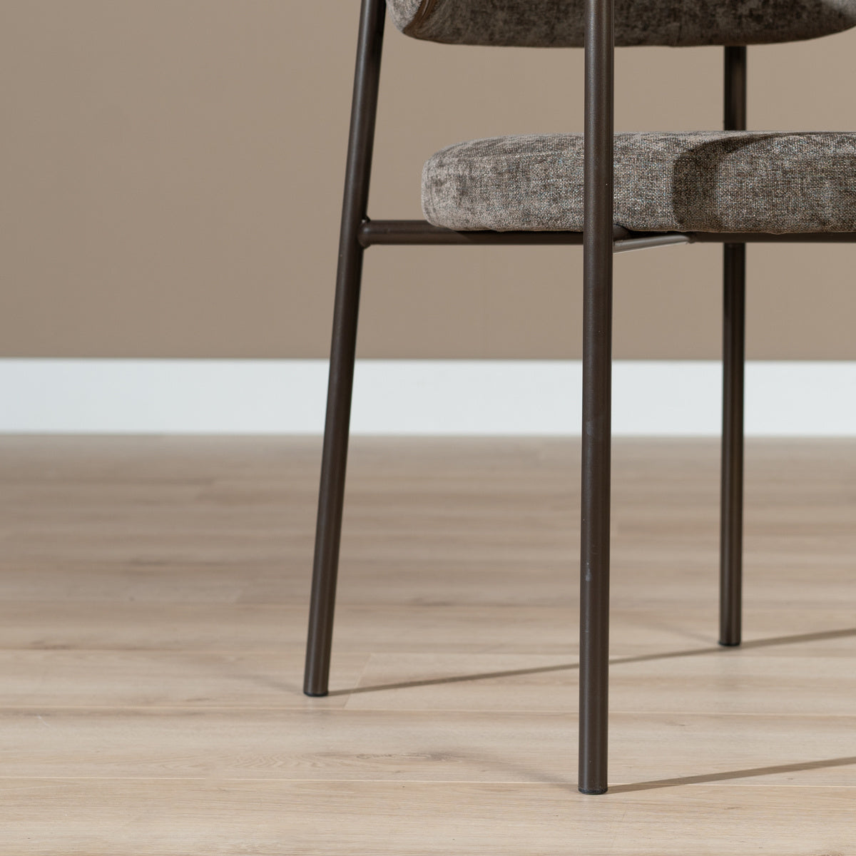 De eetkamerstoel is bekleed met een zachte velvet stof die bestaat uit 89% polyester en 11% viscose. De stof is waterafstotend en dus makkelijk schoon te maken. Het unieke aan de Gio stoel is het design en het frame met een donkerbruine coating, die de stoel een eyecatcher maken.