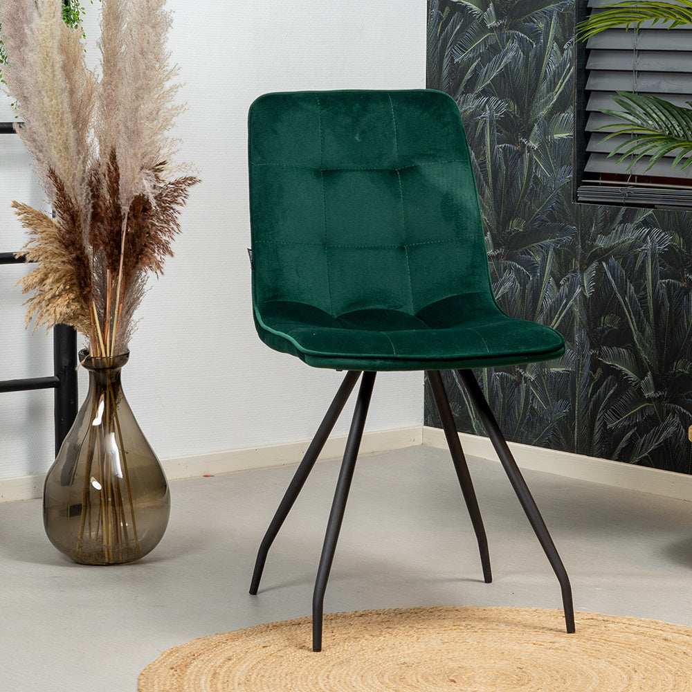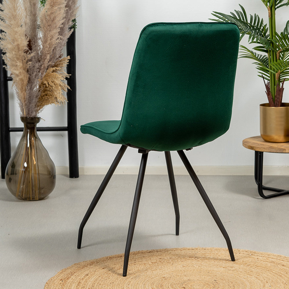 De velvet eetkamerstoel Lisa donkergroen straalt luxe uit en maakt je eetkamer helemaal af! Velvet is een heerlijk zachte stof wat natafelen tot een waar feestje maakt! De Lisa eetkamerstoel is een echte eyecatcher en straalt luxe en comfort uit! Door de combinatie van de velvet zitting en het metalen frame is de eetkamerstoel Lisa perfect te combineren in verschillende interieurstijlen.