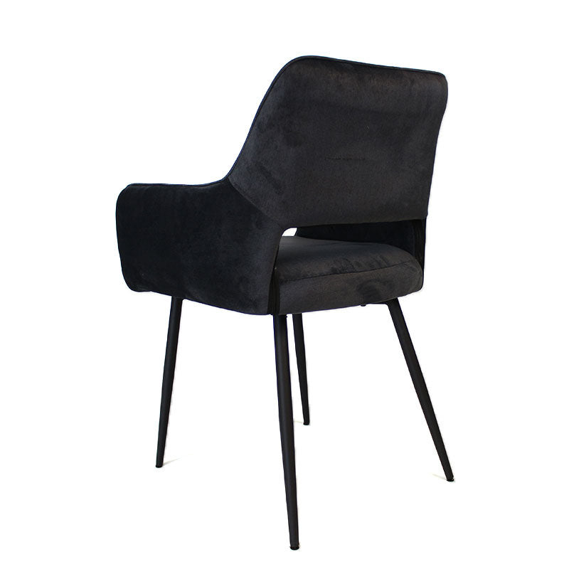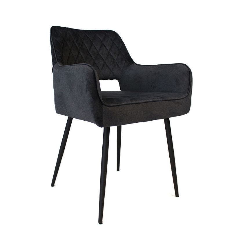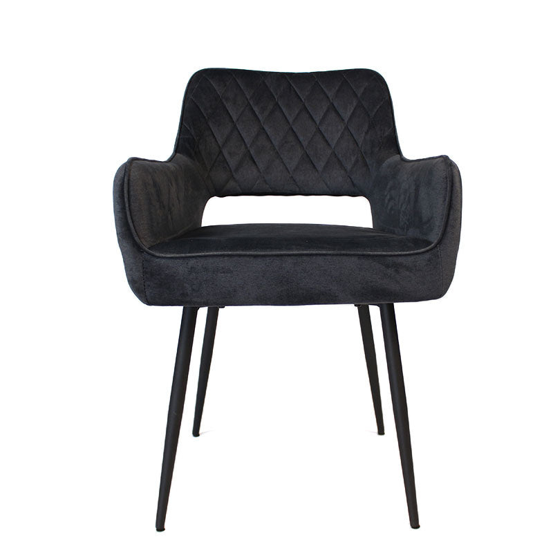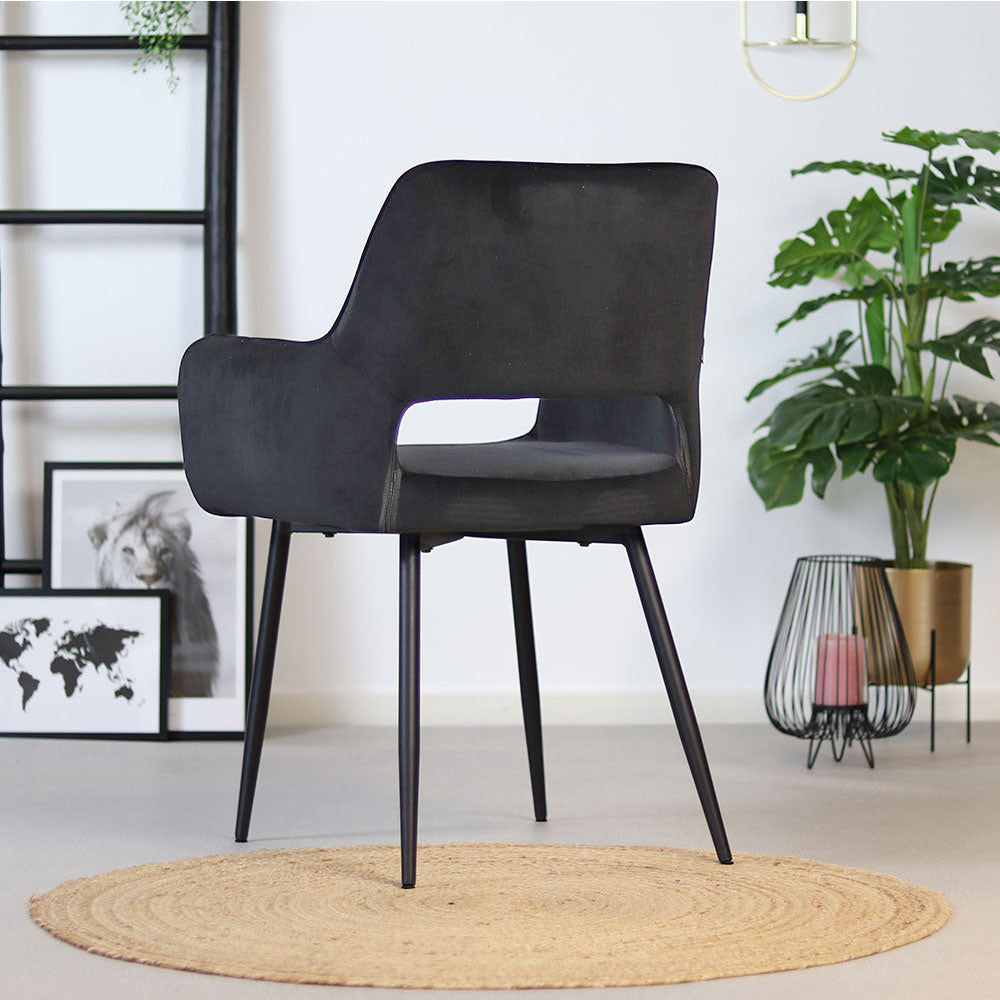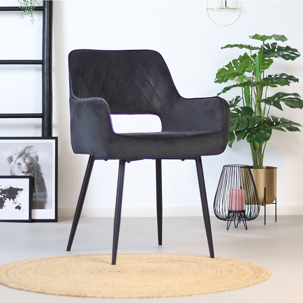 De Mika eetkamerstoel velvet heeft een mooie zitting met modern ruitpatroon. De eetkamerstoel Mika heeft armleuning met een uitsparing in de rugleuning. Dit geeft een modern, speels effect aan de stoel. Daarnaast is de velvet stof waterbestendig, wat de stoel perfect maakt voor ieder interieur. Het frame van de eetkamerstoel is gemaakt van zwart metaal wat van binnen naar buiten loopt.