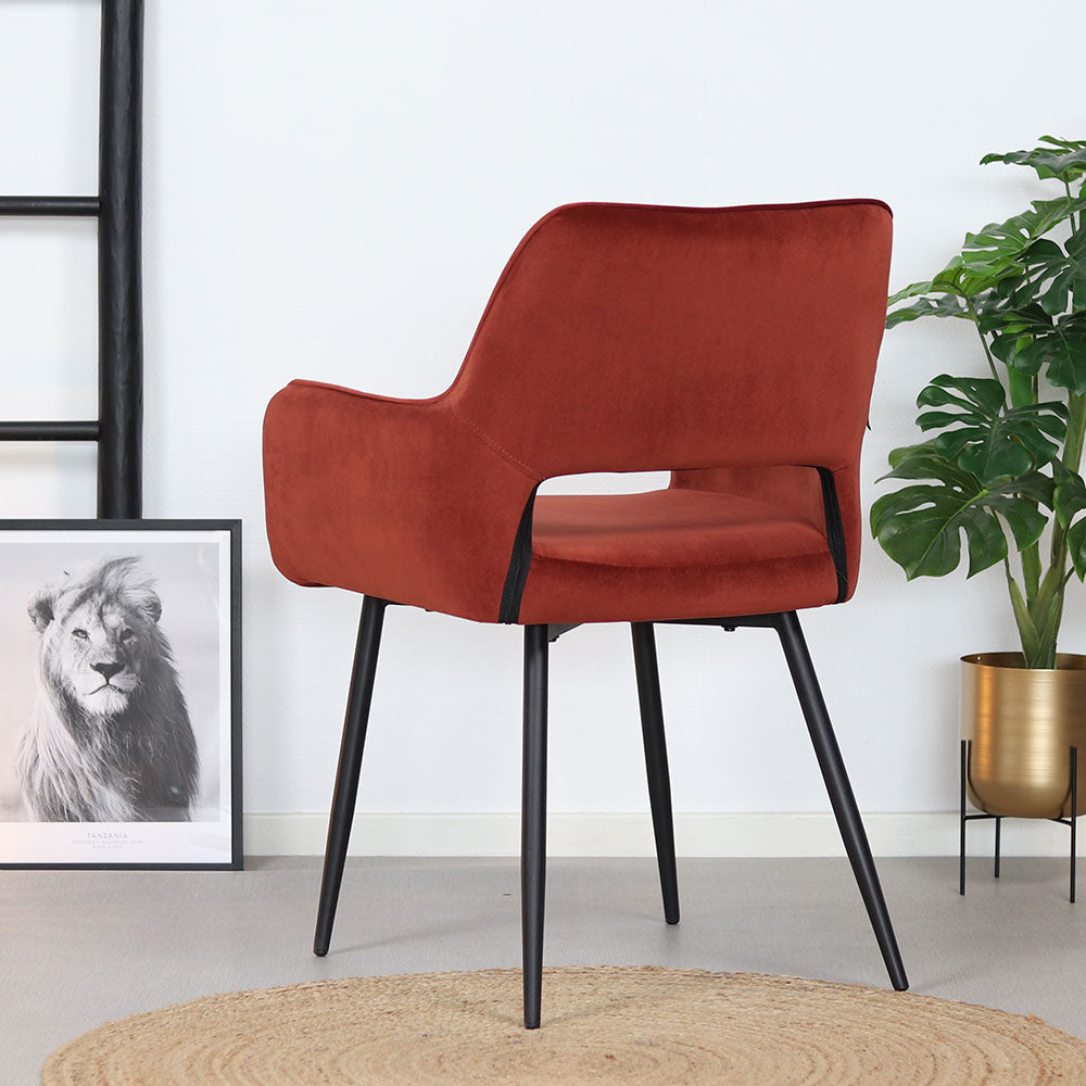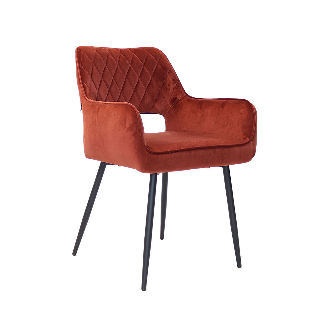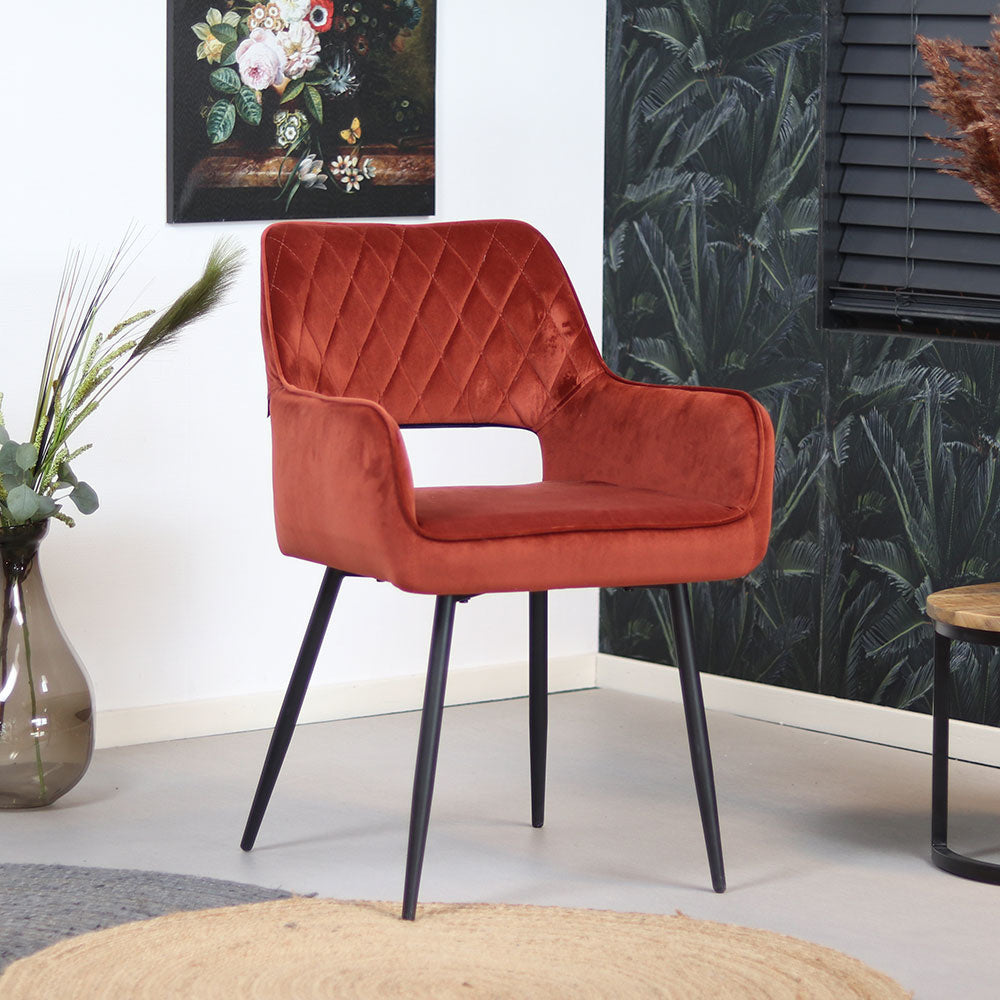 De Mika eetkamerstoel velvet heeft een mooie zitting met modern ruitpatroon. De eetkamerstoel Mika heeft armleuning met een uitsparing in de rugleuning. Dit geeft een modern, speels effect aan de stoel. De luxe stof van de eetkamerstoel heeft een martindale score van 70.000, wat betekent dat de stof heel slijtvast is! Daarnaast is de velvet stof waterbestendig, wat de stoel perfect maakt voor ieder interieur. Het frame van de eetkamerstoel is gemaakt van zwart metaal wat van binnen naar buiten loopt. De eetkamerstoel Mika is verkrijgbaar in de kleuren zwart, donkergroen, donkerblauw, okergeel en koper.