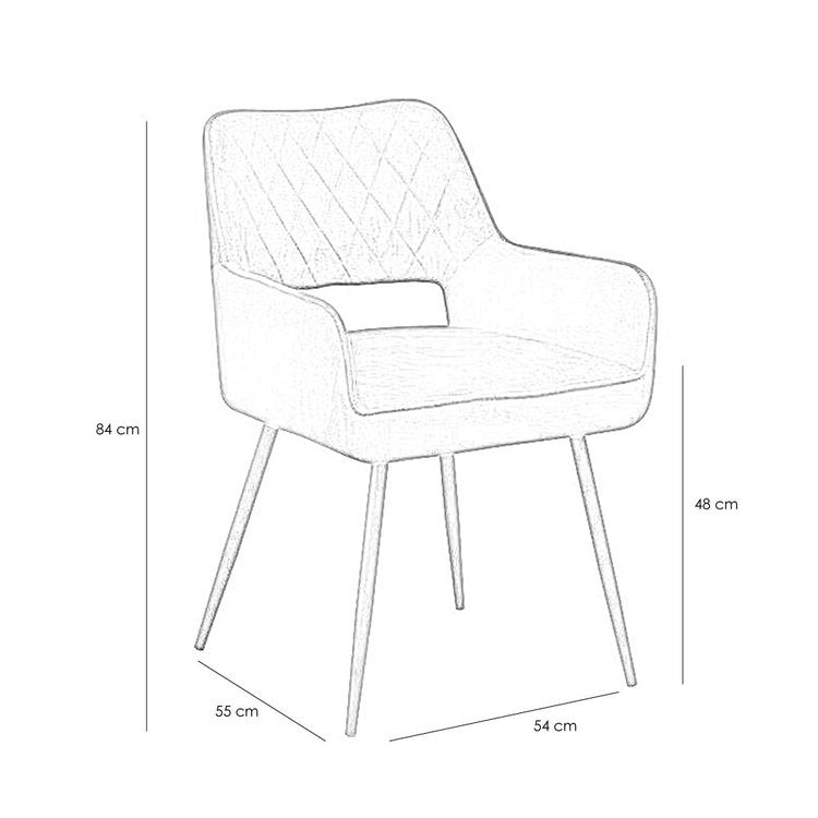 De Mika eetkamerstoel velvet heeft een mooie zitting met modern ruitpatroon. De eetkamerstoel Mika heeft armleuning met een uitsparing in de rugleuning. Dit geeft een modern, speels effect aan de stoel. De luxe stof van de eetkamerstoel heeft een martindale score van 70.000, wat betekent dat de stof heel slijtvast is! Daarnaast is de velvet stof waterbestendig, wat de stoel perfect maakt voor ieder interieur. Het frame van de eetkamerstoel is gemaakt van zwart metaal wat van binnen naar buiten loopt.