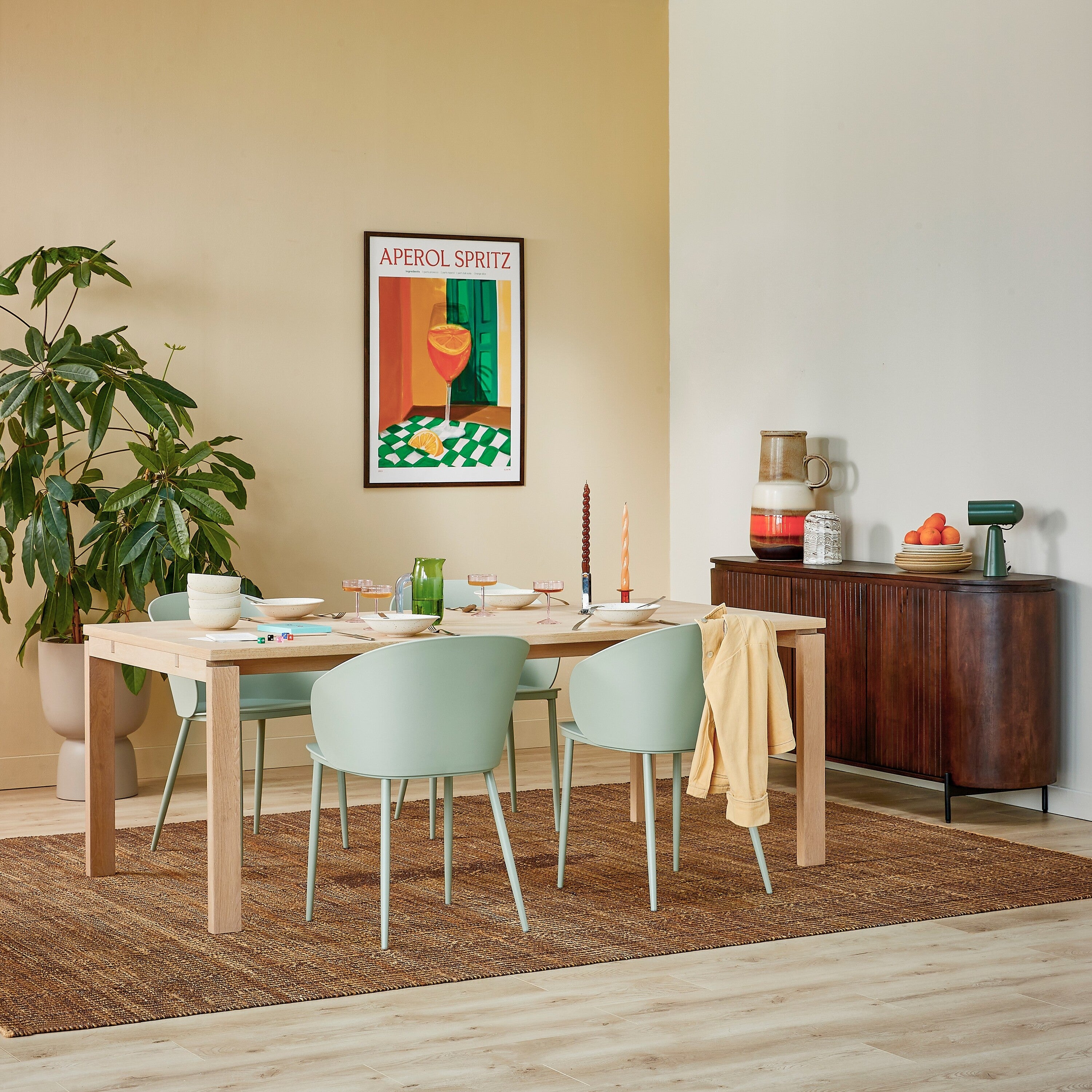 - Met een MDF tafelblad en eikenhouten poten