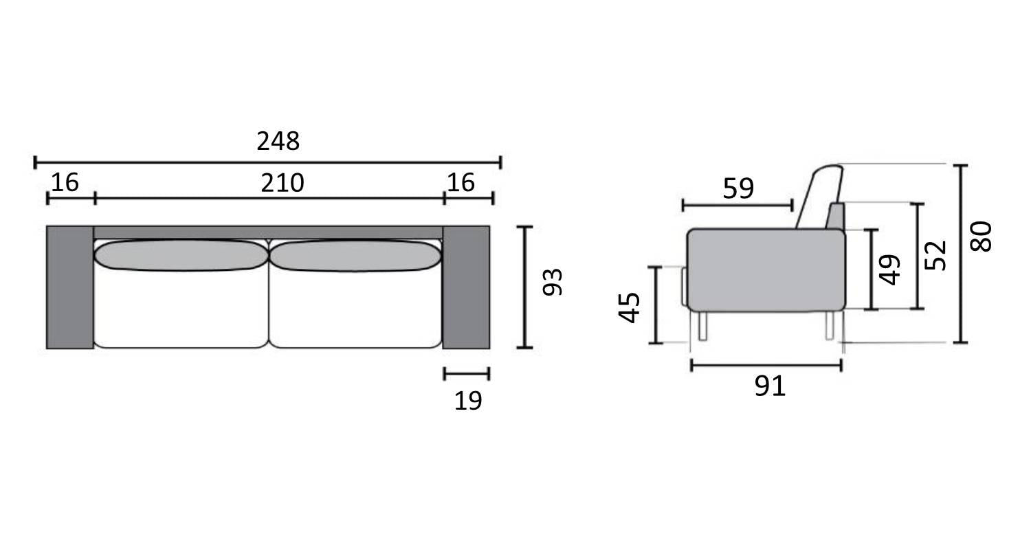 - Strakke 3-zitsbank van H 80 x B 248 x D 93 cm