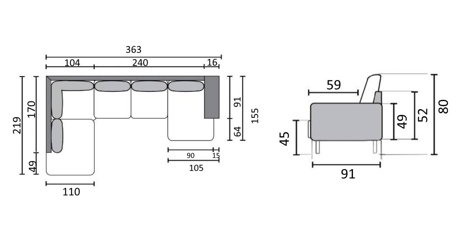 - Strakke U-bank van H 80 x B 363 x D 219 cm