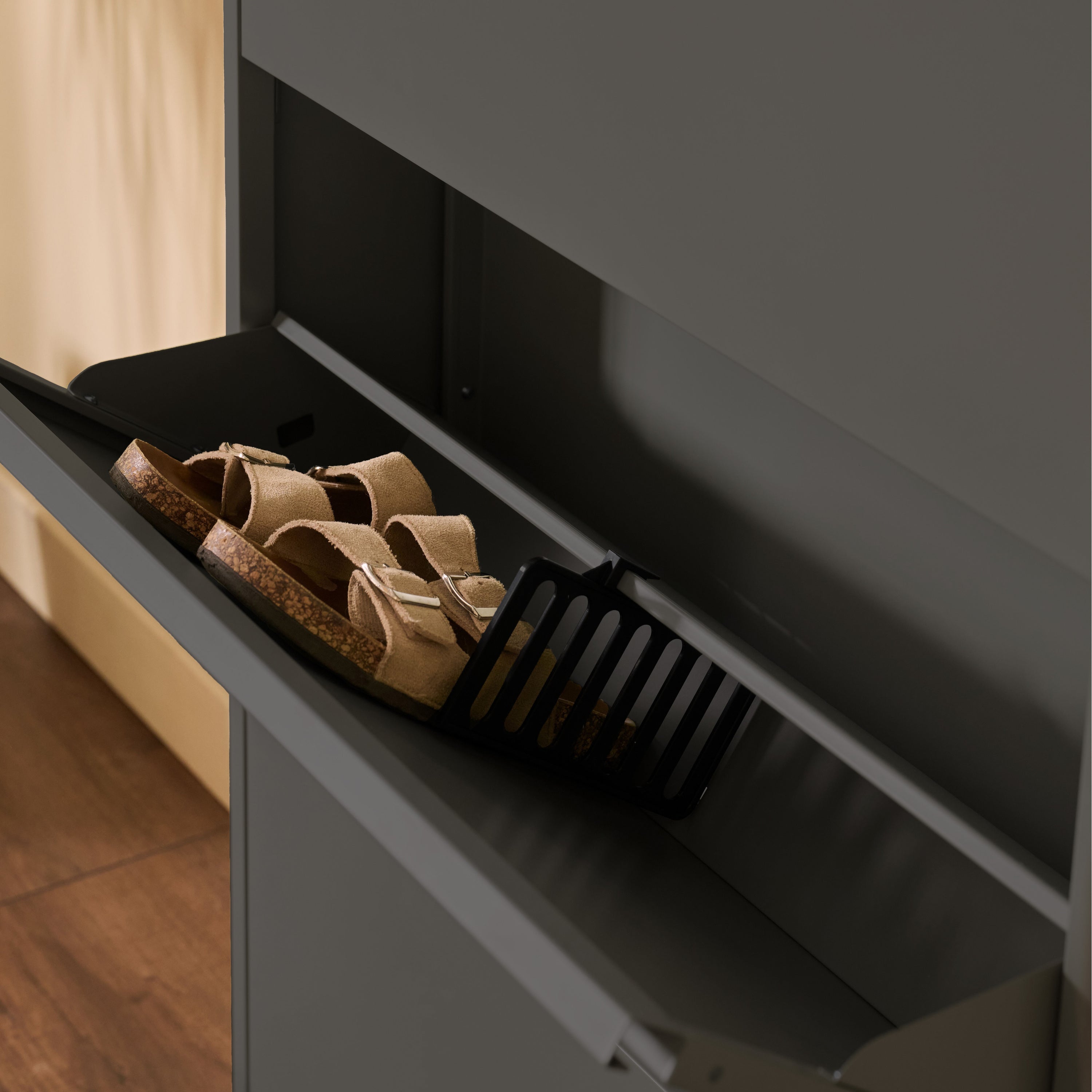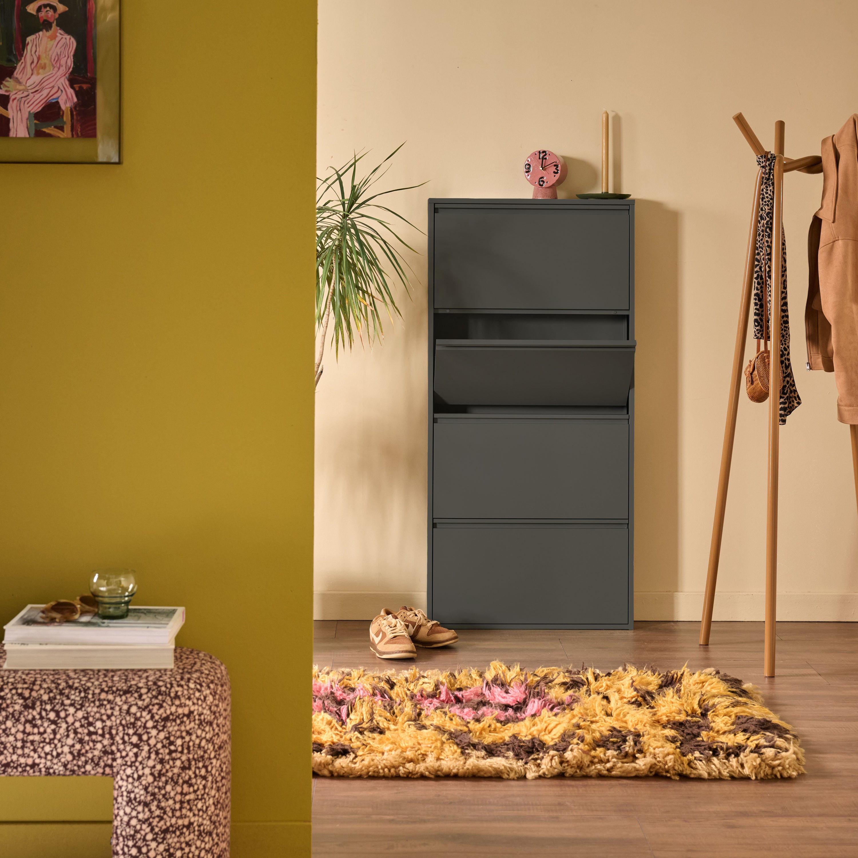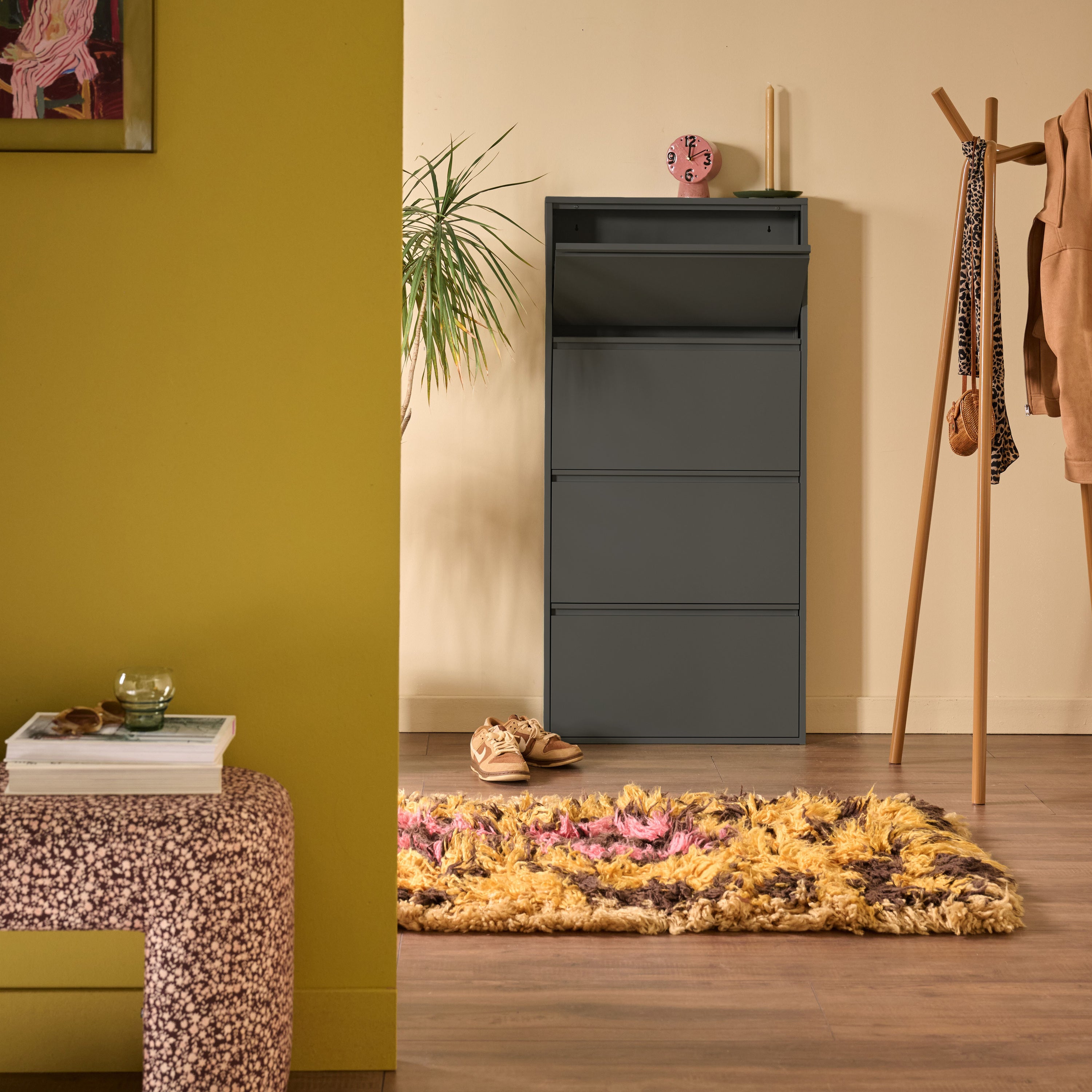 Schoenenchaos? Klip it! De by fonQ Klip schoenenkast is strak, slim en super stijlvol. Met z’n matte jasje, klapvakken en slanke look berg je alles netjes op. Ideaal voor in de gang, hal of waar je schoenen ook graag rondslingeren.