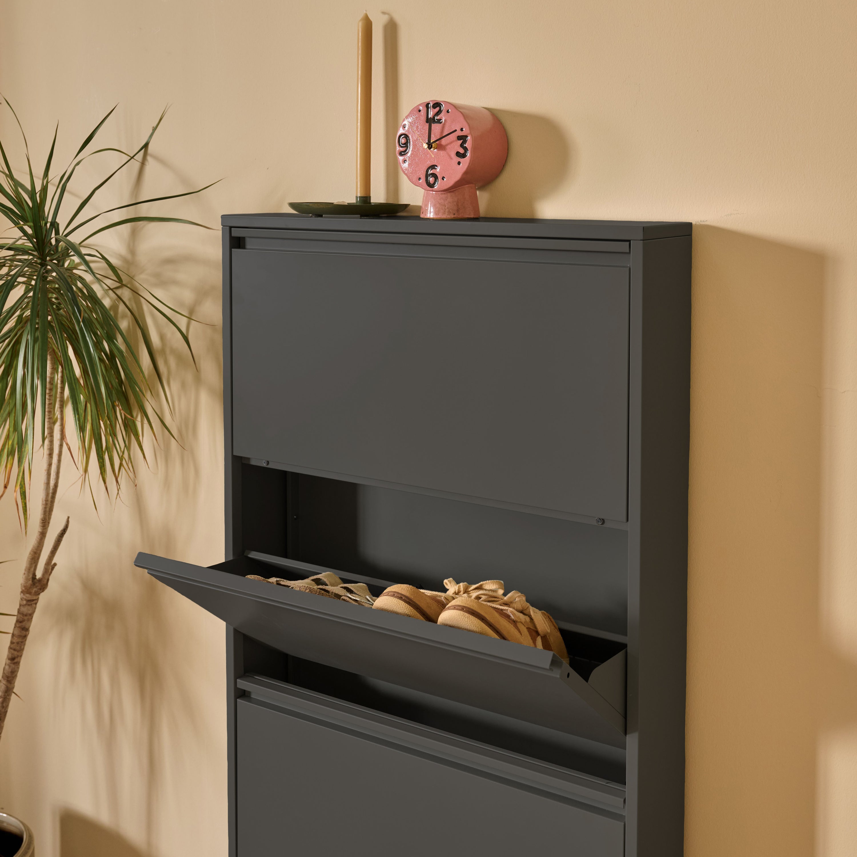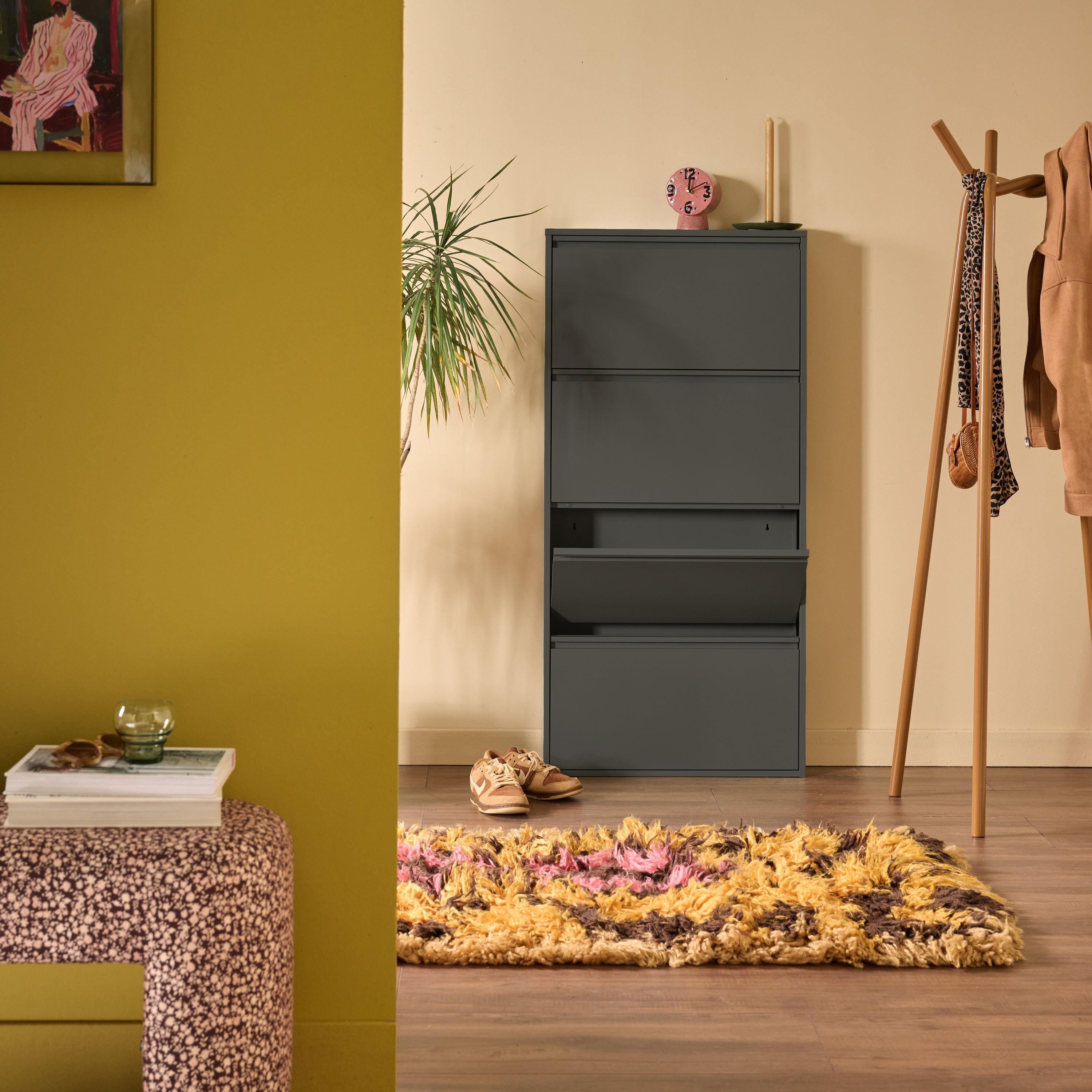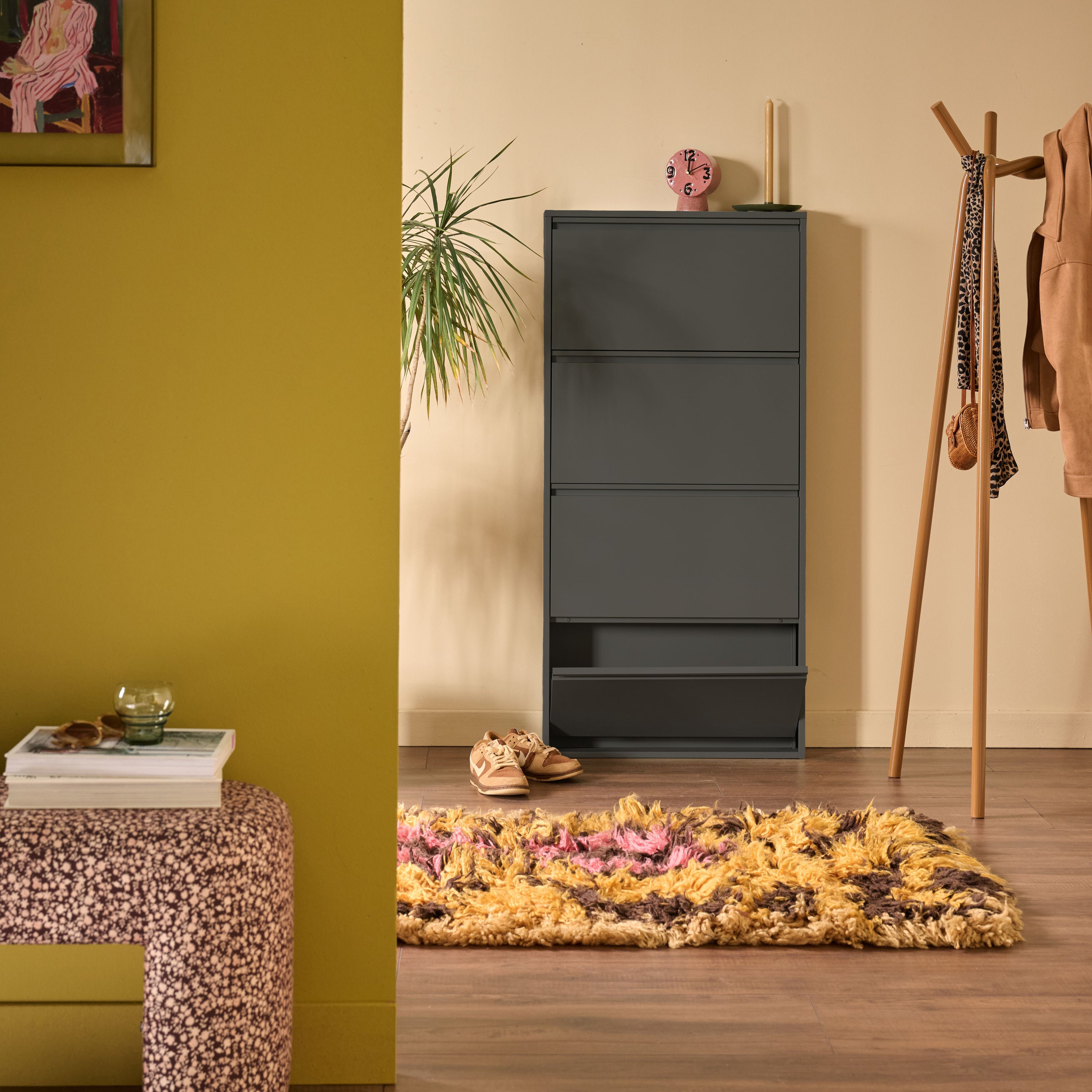 Schoenenchaos? Klip it! De by fonQ Klip schoenenkast is strak, slim en super stijlvol. Met z’n matte jasje, klapvakken en slanke look berg je alles netjes op. Ideaal voor in de gang, hal of waar je schoenen ook graag rondslingeren.