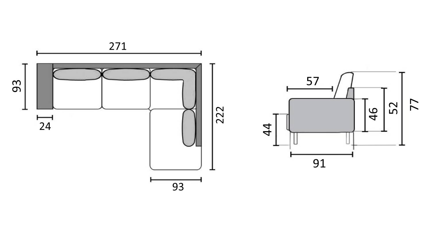 - Strakke hoekbank van H 77 x B 271 x D 222 cm