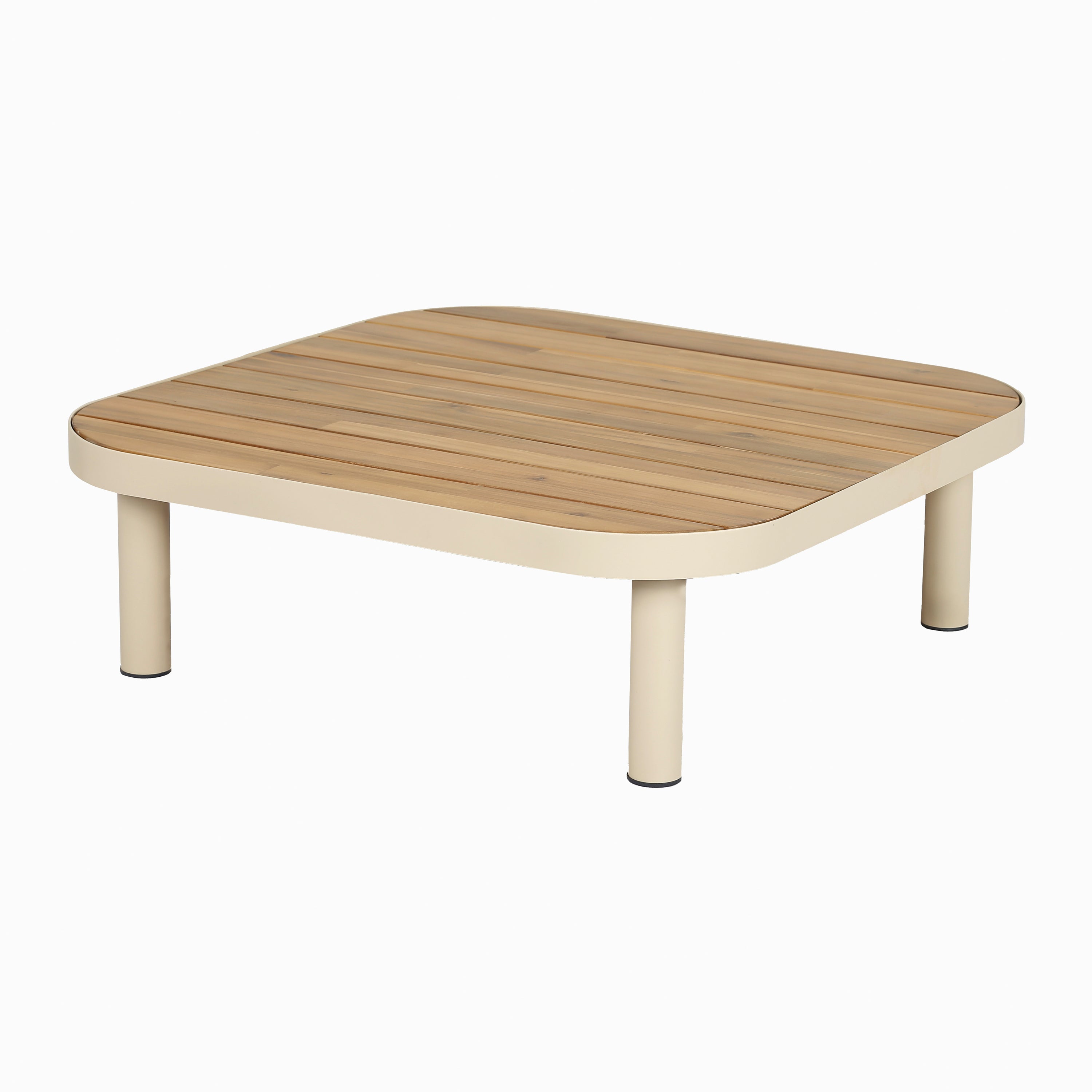 - De loungeset is van acaciahout en het onderstel van gepoedercoat staal