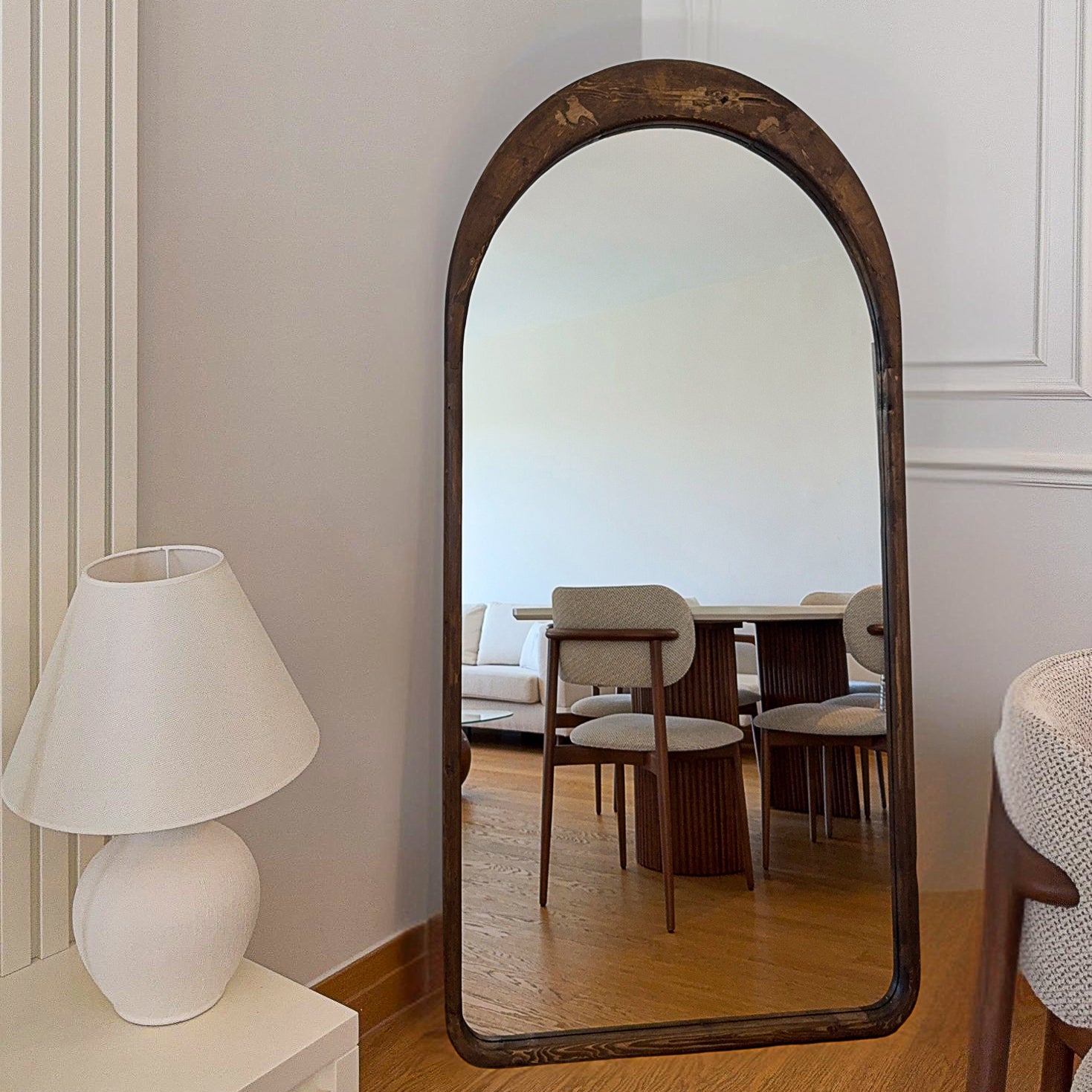 - De boogvorm voelt als een zachte omlijsting voor je muur