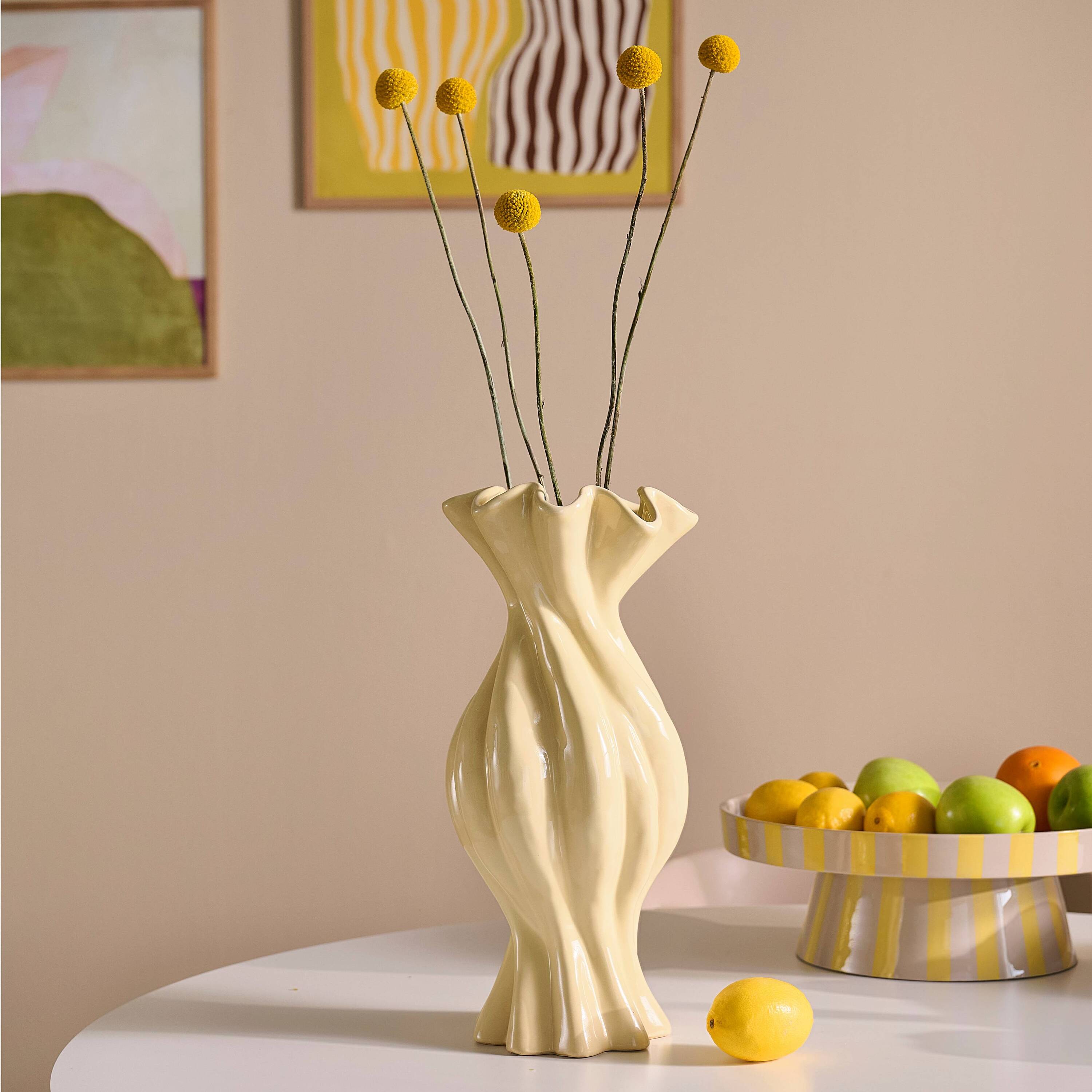 - Gedraaid keramiek met een glossy finish in zachte tint