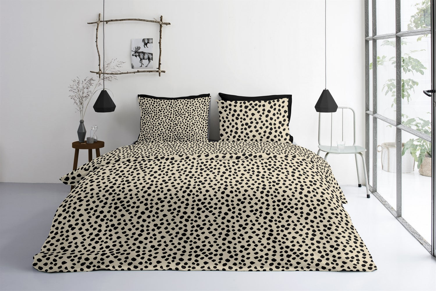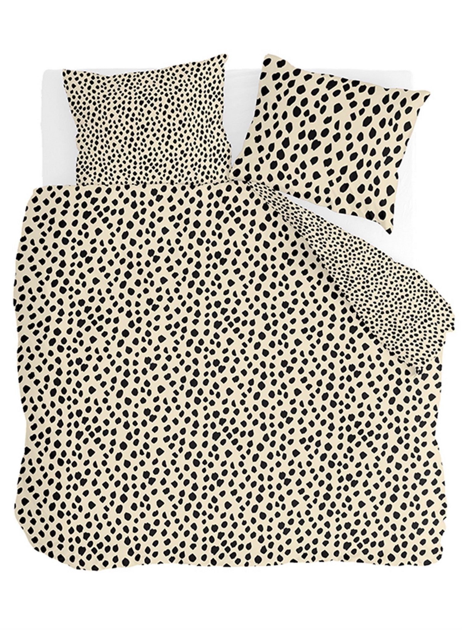 Ga helemaal los en tover je slaapkamer om tot een ware jungle met dekbedovertrek Go Wild. Een zwarte panterprint op een vanillekleurige ondergrond. Leuk detail: je kunt afwisselen tussen de fijne of de grove print bovenop. Gemaakt van 100% katoen, een natuurlijk materiaal dat ademt en vocht absorbeert.