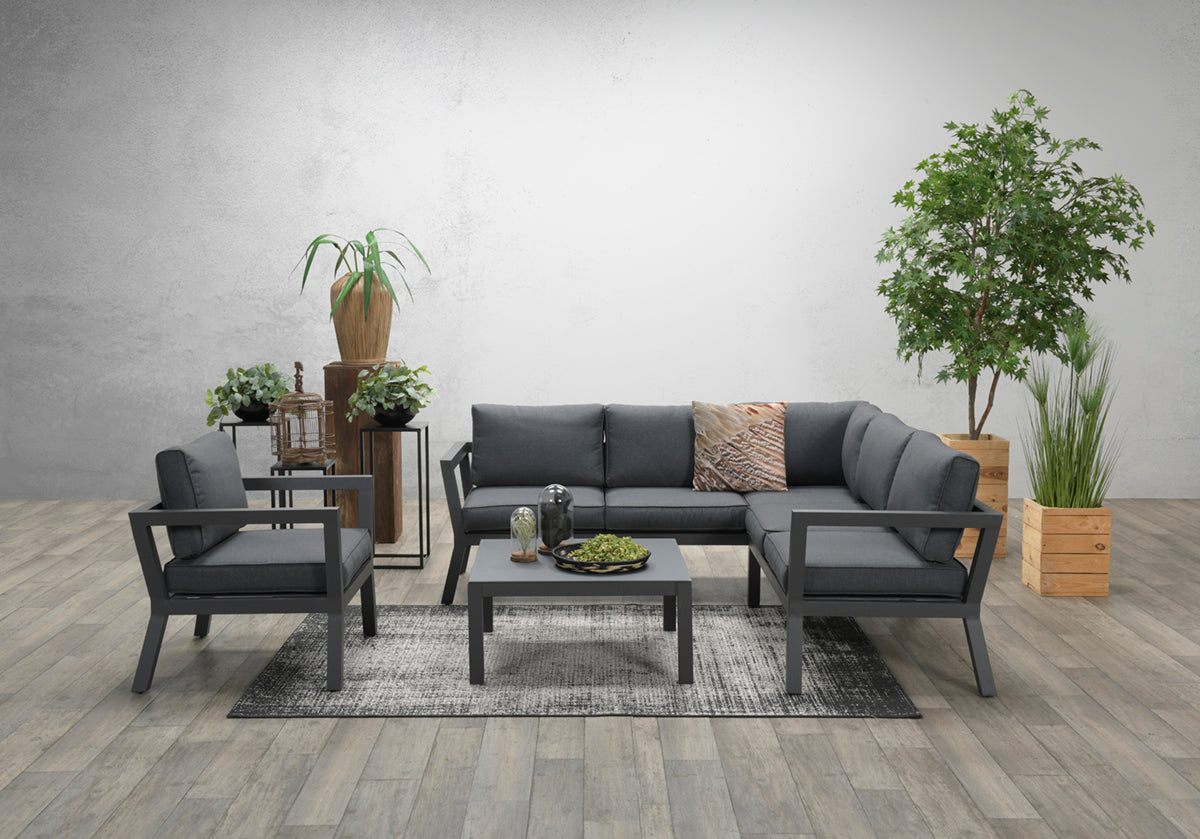 De Calgary loungestoel is de aluminium loungestoel met antraciet frame. De kleur van het frame wordt ook wel Carbon black genoemd. De poten van de loungestoel staan iets naar buiten. Dit geeft de stoel een unieke uitstraling. De kussens van de aluminium loungestoel zijn voorzien van een waterafstotende coating. Dit betekend niet dat de kussens het gehele jaar buiten kunnen blijven maar wel dat ze een keer tegen een buitje regen kunnen. We adviseren, als u de stoel niet gebruikt, de kussens droog op te bergen.