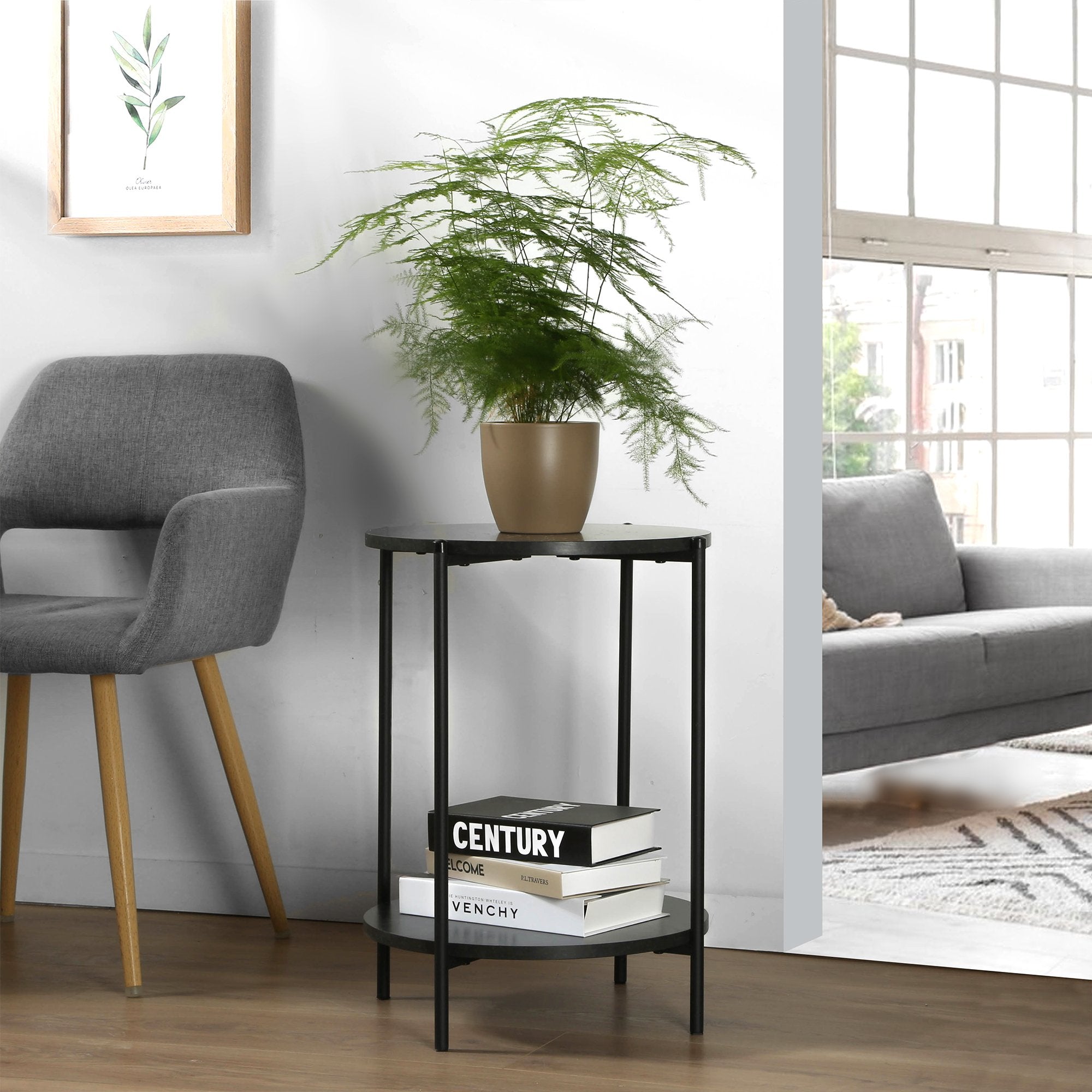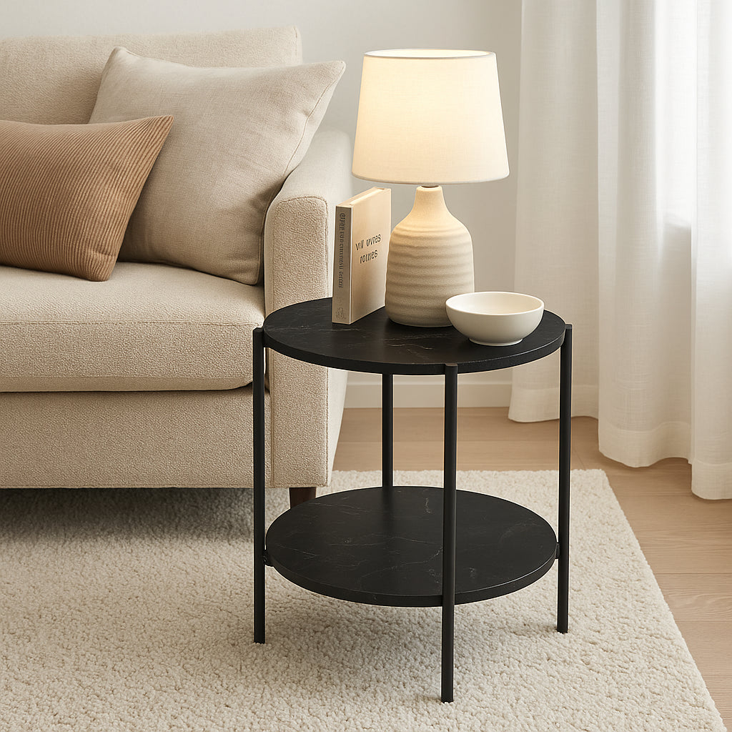 Productkenmerken : Beschikt over 2 bladen die handige opbergruimte bieden voor uw woonkamerbenodigdheden. Bedekt met een decoratie van zwart marmer, waardoor een vleugje verfijning wordt toegevoegd aan elk interieur. Weegt slechts 3,5 kg en is gemakkelijk te verplaatsen naar uw behoeften, of het nu gaat om het serveren van gasten of het herorganiseren van uw ruimte. Met zijn compacte afmetingen past het perfect bij de meeste banken en fauteuils, en biedt het een opslagoplossing zonder stijl te compromitteren. Productafmetingen: Diameter 40 cm x Hoogte 56,8 cm - Nettogewicht: 3,10 kg. Afmetingen van de verpakking: Lengte 59,5 cm x Hoogte 44 cm x Diepte 4 cm - Brutogewicht: 3,50 kg.