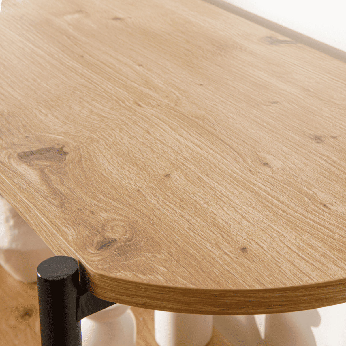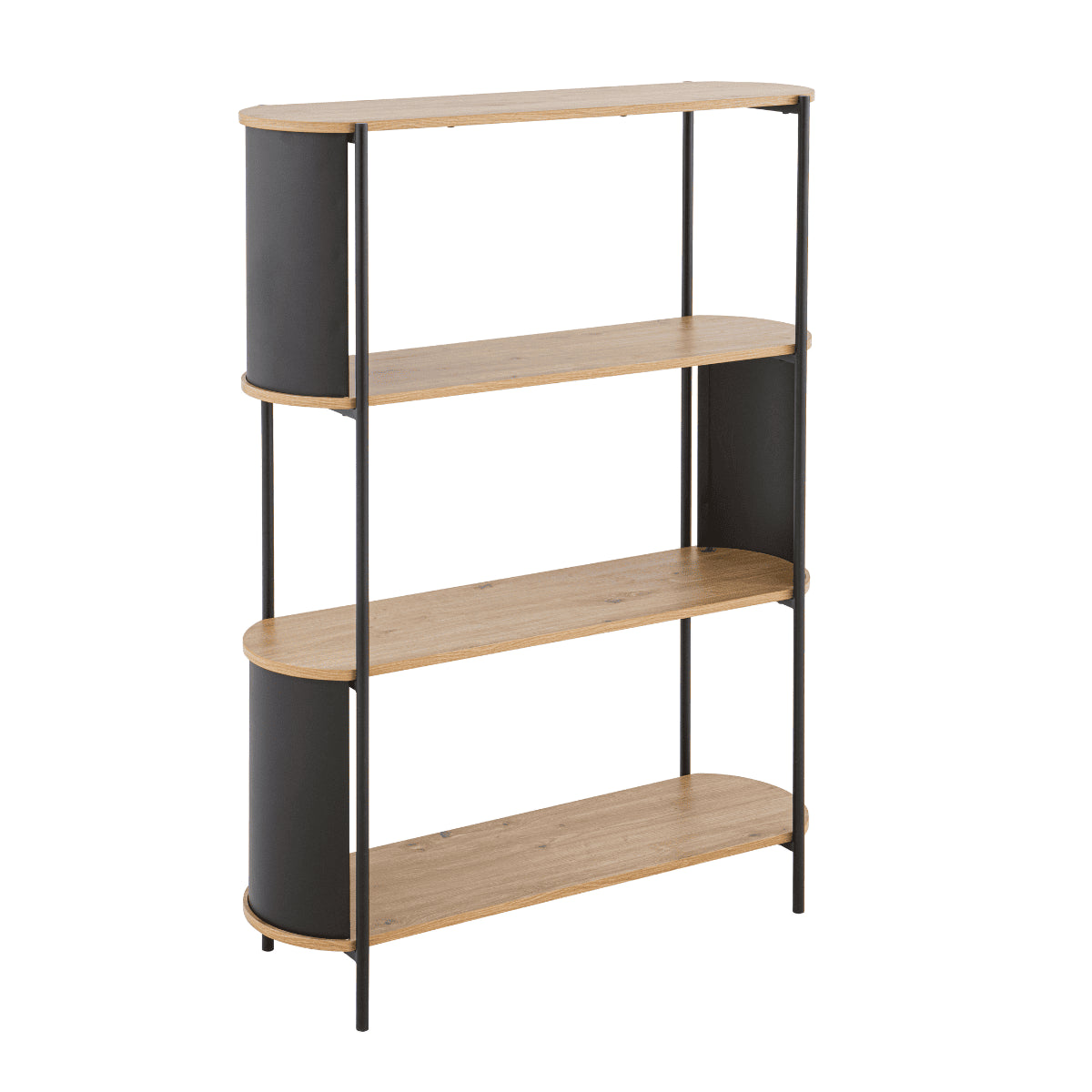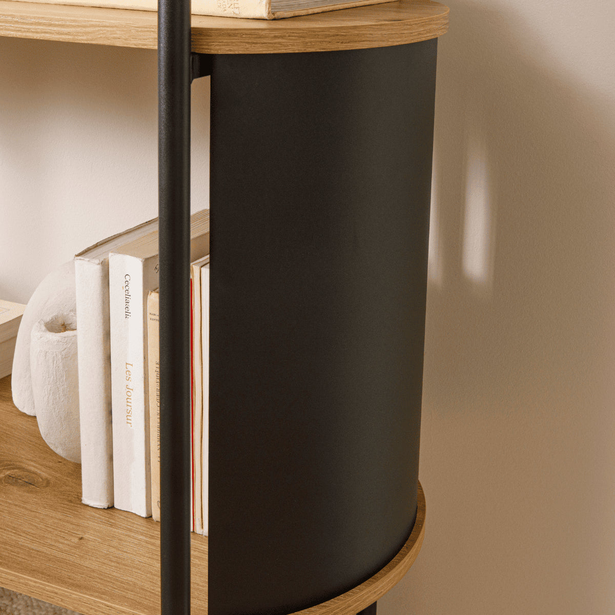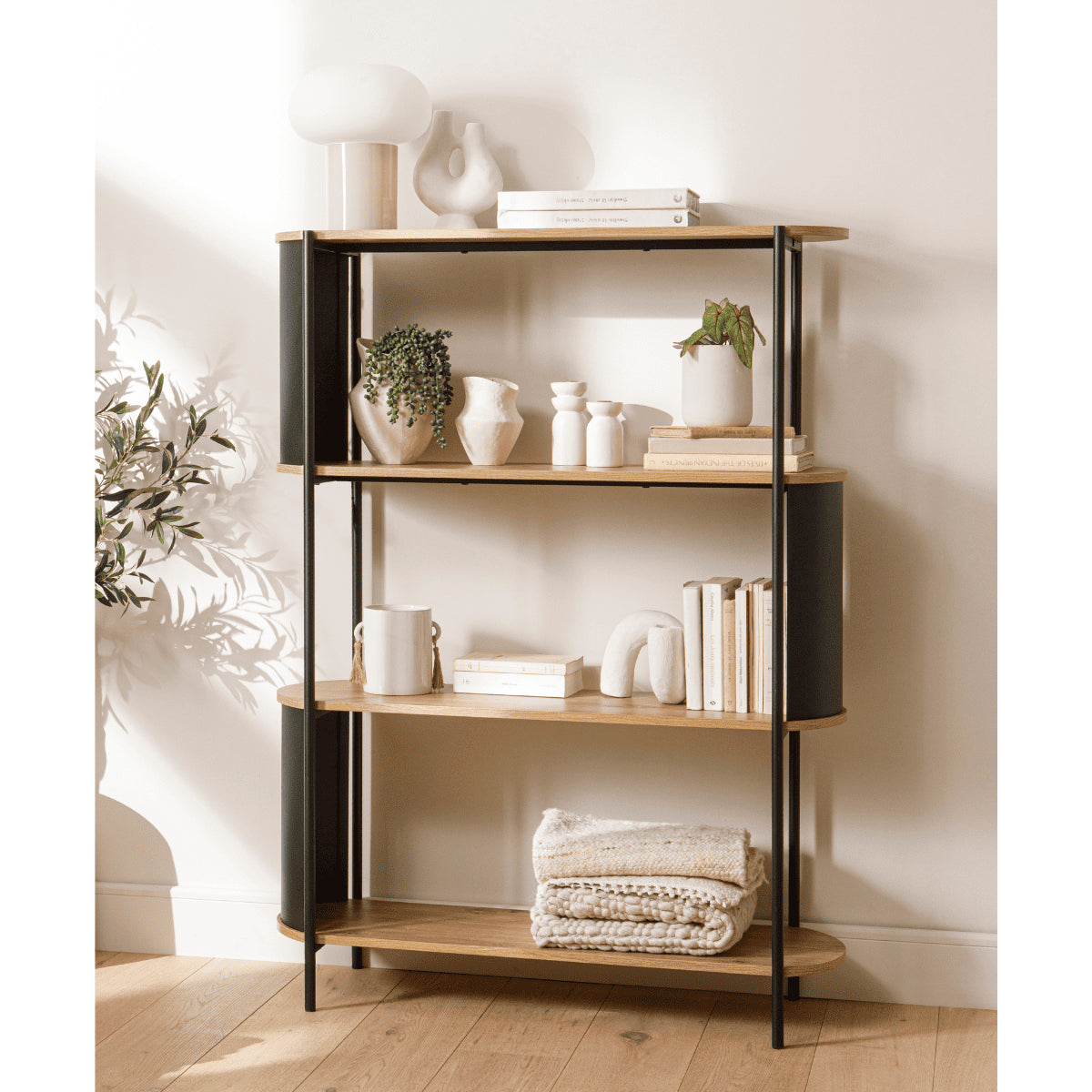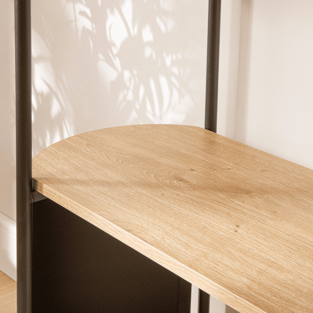 - Wandrek met 4 niveaus, planken met houtdecor afwerking.