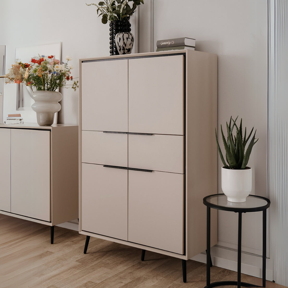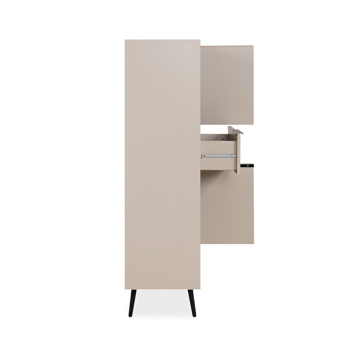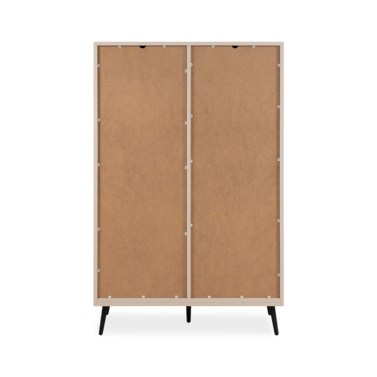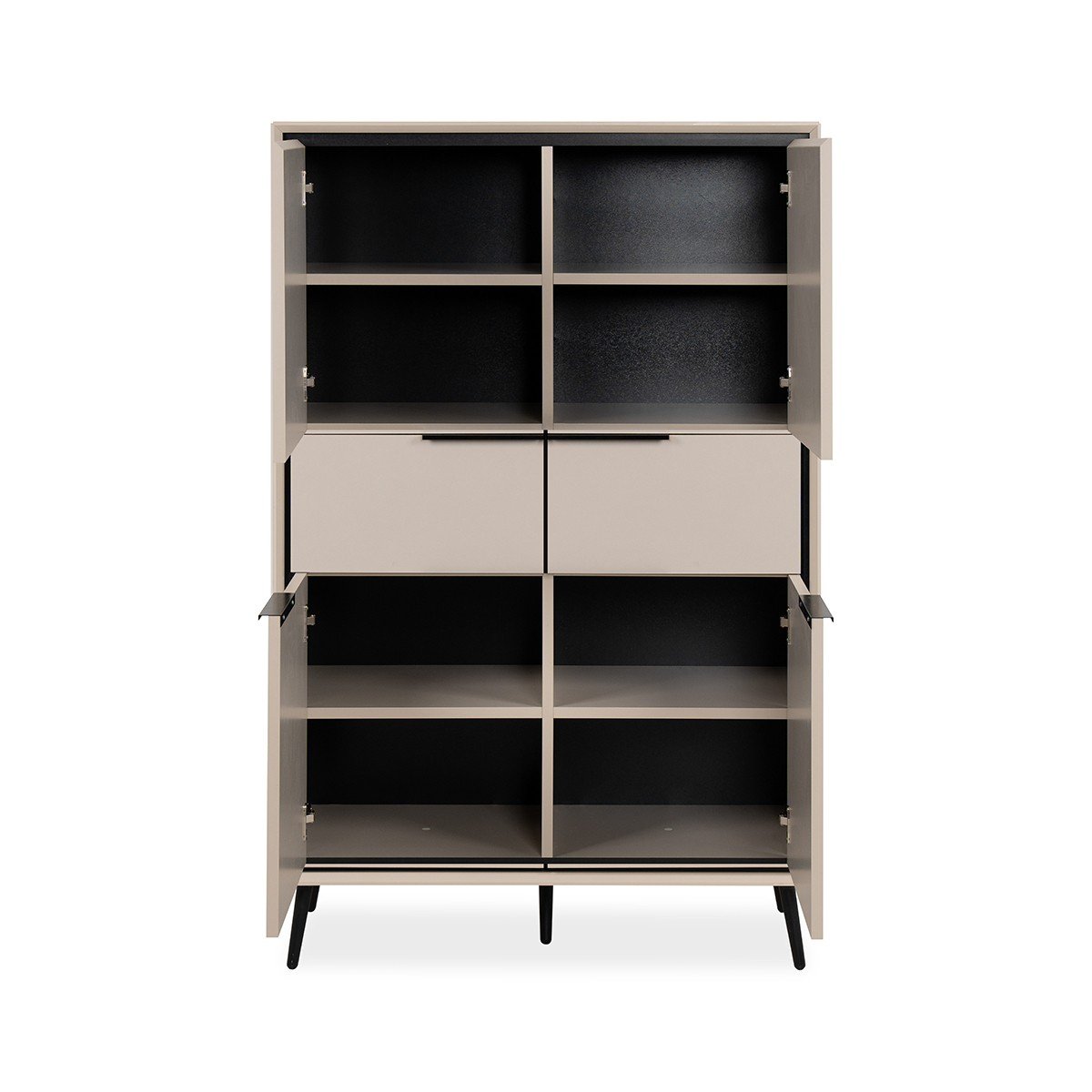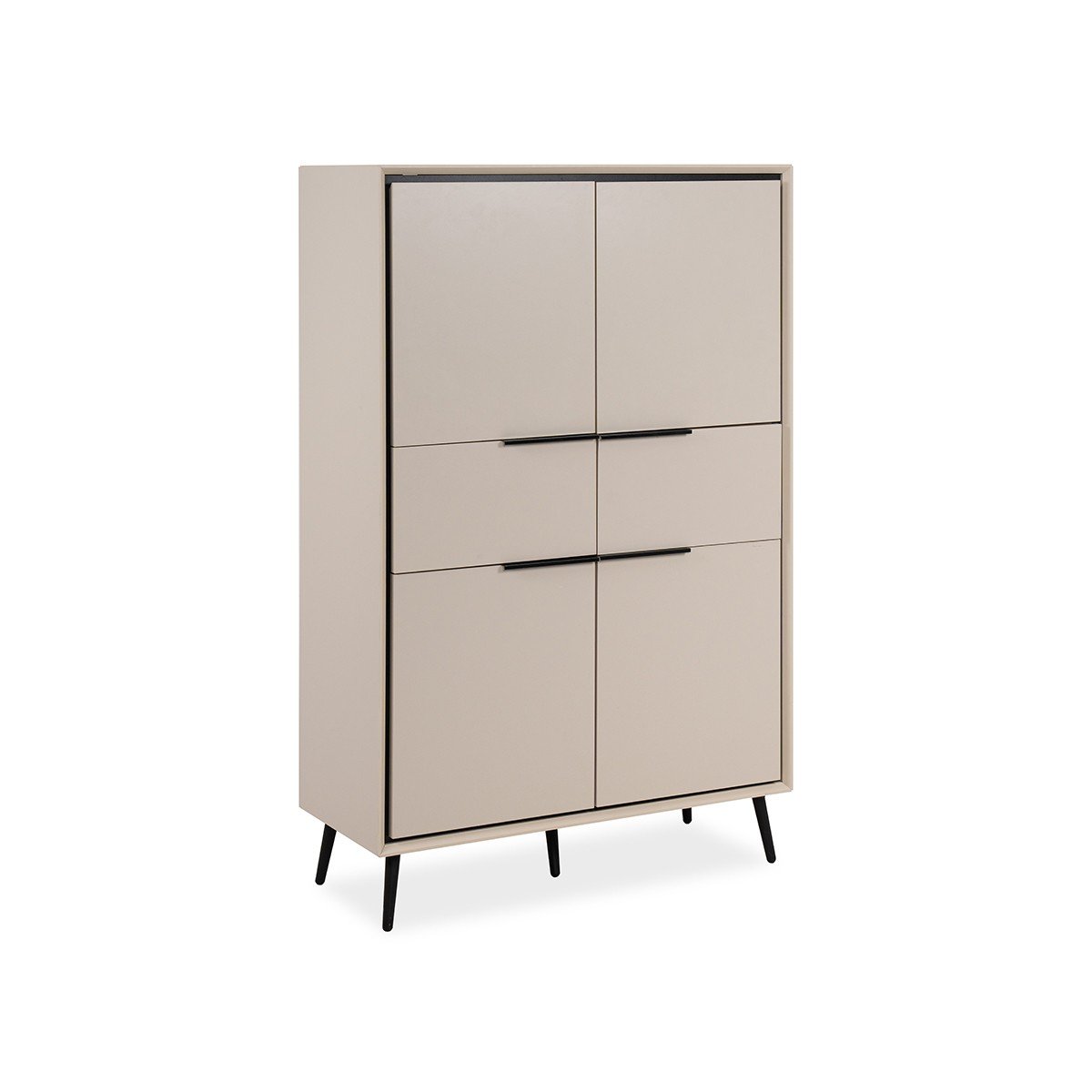 Productkenmerken: Hoge buffetkast, 4 deuren met 1 plank achter elk, 2 laden. Zwarte plastic poten van 16 cm hoog. Melamine panelen van 18 mm dik. Afgeschuinde randen. Deuren sluiten met demper. Metalen handgrepen. Productafmetingen: Lengte 90 cm x B…