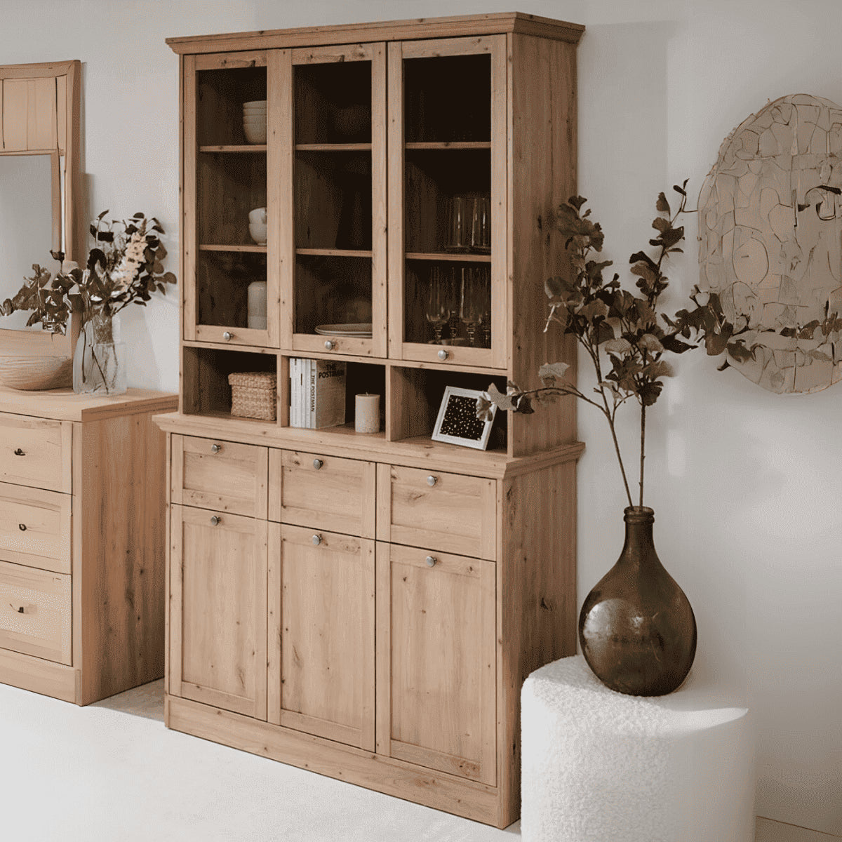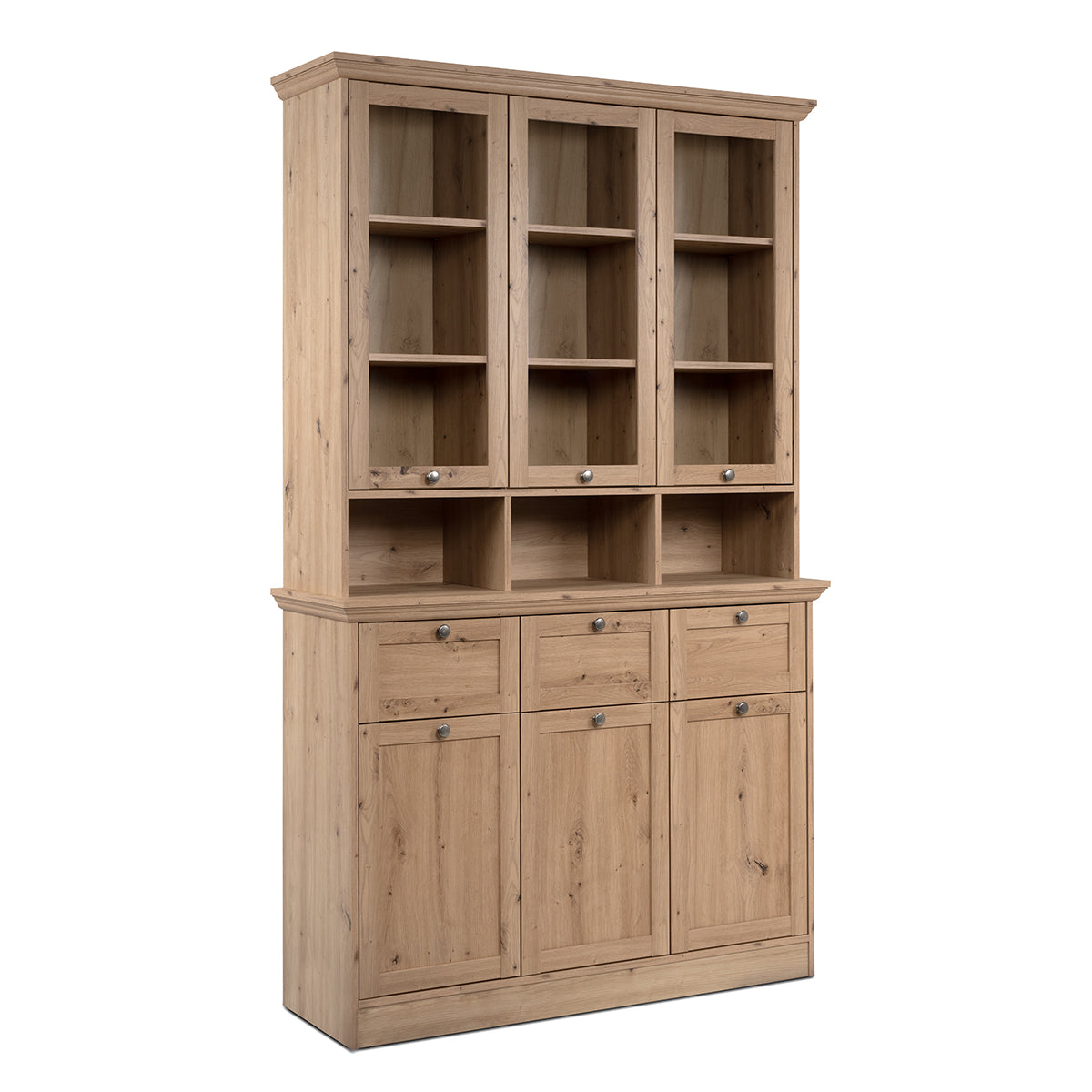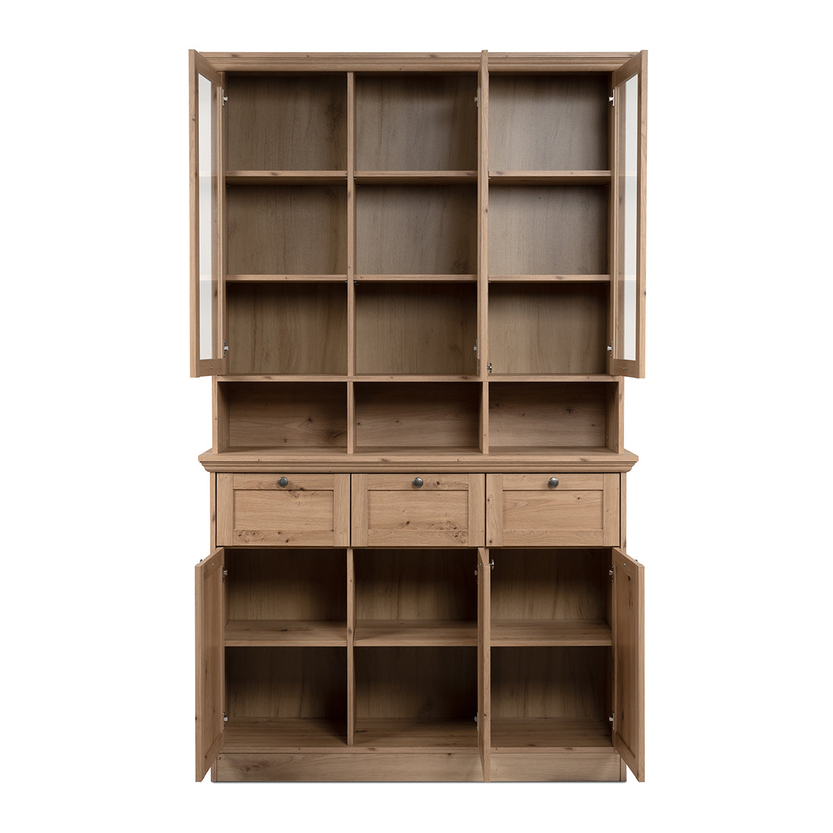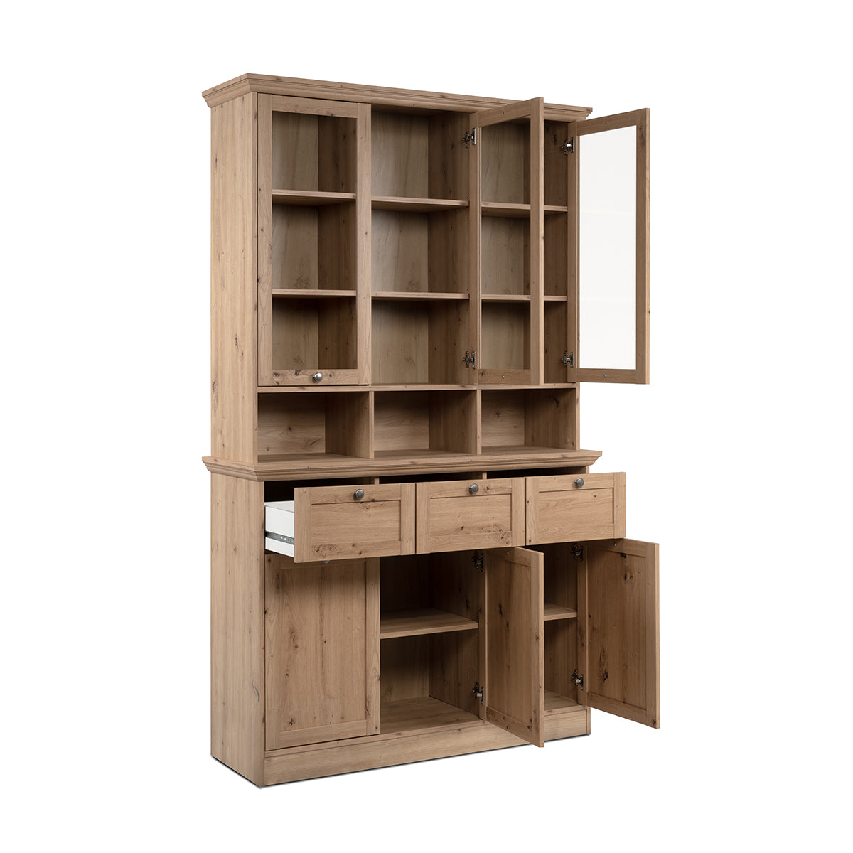 - 3 glazen deuren met 2 planken achter elke deur.