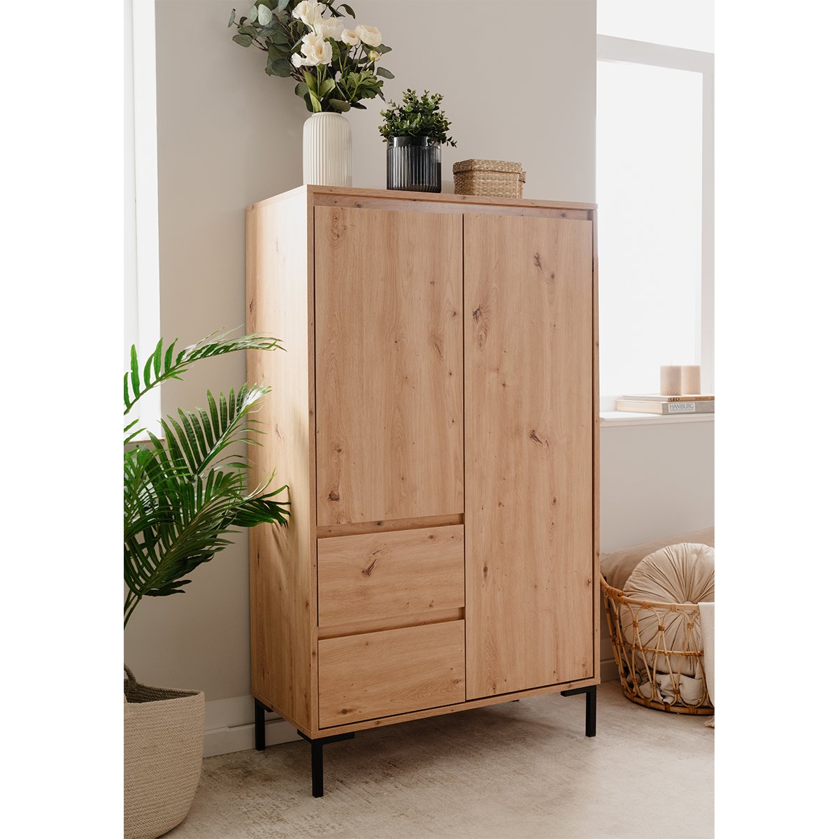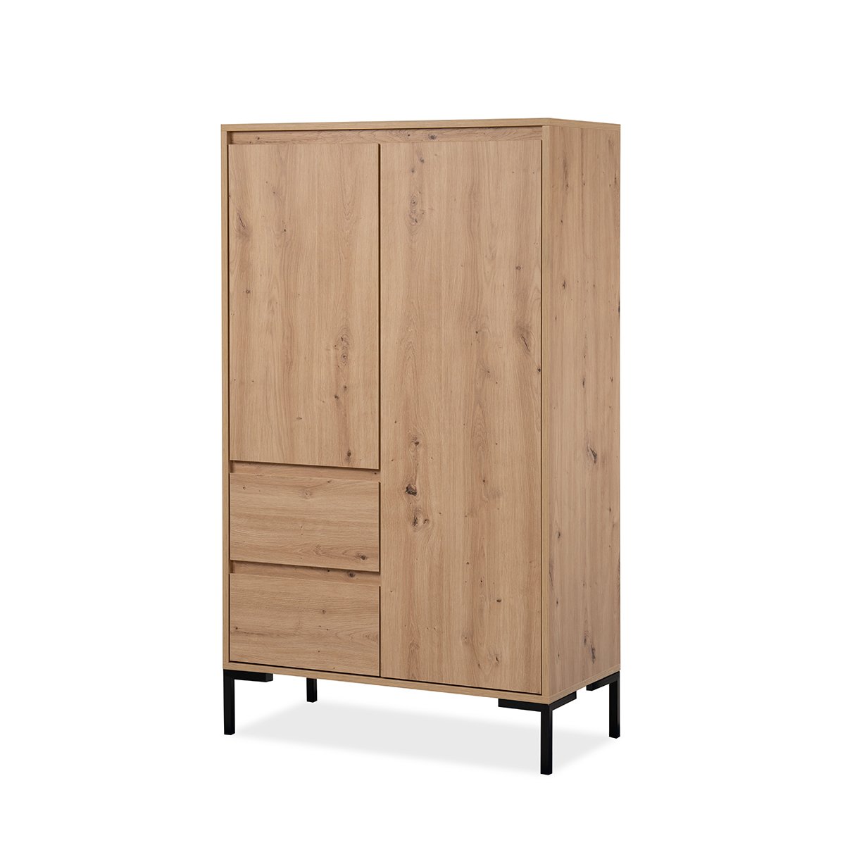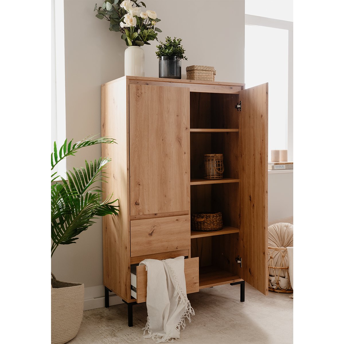 Ontdek onze hoge buffetkast met 2 deuren, 2 laden en 2 planken, H139 cm - Plock. Dankzij de verticale opbergruimte verliest u geen vloerruimte. De vele opbergmogelijkheden stellen u in staat om al uw spullen naar wens te organiseren en op te bergen. Deze buffetkast biedt extra opbergruimte in uw interieur en voegt een warme uitstraling toe dankzij het decor in ambachtelijk eiken. Productkenmerken: Materialen: Spaanplaten / Metalen poten. 2 deuren. 2 laden. 4 planken. Ambachtelijk eiken decor. Productafmetingen: Lengte 81 cm x Breedte 40 cm x Hoogte 139 cm - Nettogewicht: 47,5 kg. Afmetingen van de pakketten: Pakket nr. 1: Lengte 111,5 cm x Hoogte 48,5 cm x Diepte 13,5 cm - Bruto gewicht: 26,7 kg. Pakket nr. 2: Lengte 133,5 cm x Hoogte 48 cm x Diepte 10,5 cm - Bruto gewicht: 25 kg. Totaal bruto gewicht: 51,7 kg.