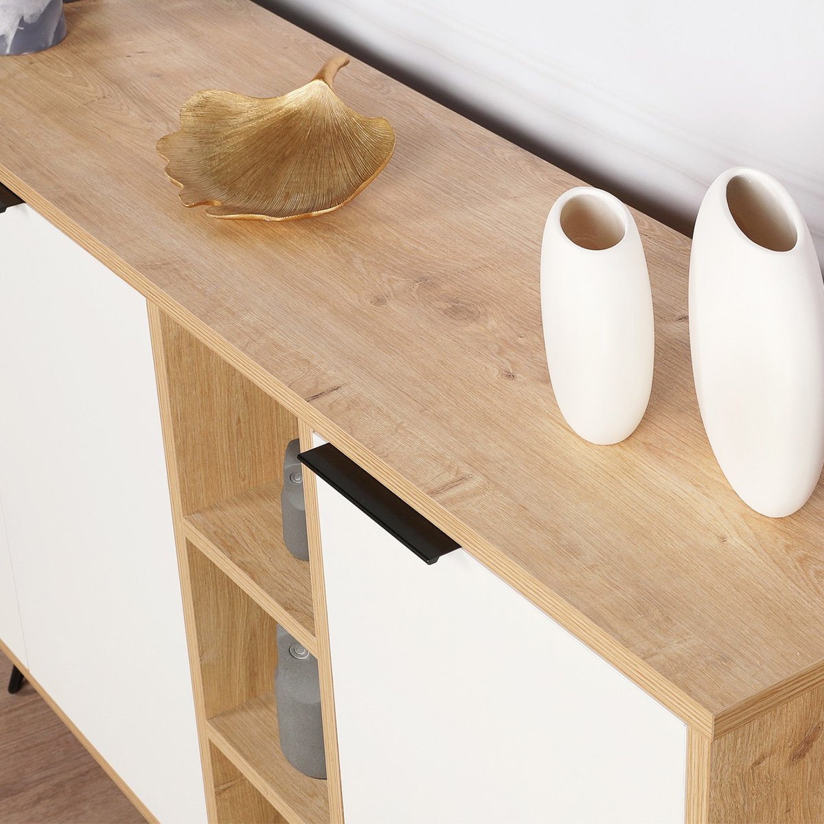Productkenmerken: Gemaakt van 100% melamine spaanplaat. Gecertificeerd met het FSC-label dat aangeeft dat het product voor 100% is gemaakt van gerecycled hout uit duurzaam beheerde bossen. De metalen poten voegen een vleugje verfijning en stabiliteit toe. Het kan aan de muur worden bevestigd, waardoor u ruimte bespaart. Kleuren beschikbaar: antraciet grijs en lichtbruin, eiken decor, eiken decor en antraciet grijs, eiken decor en wit, donker eiken decor en wit met steeneffect. Productafmetingen: breedte 35,6 cm x lengte 142 cm x hoogte 83 cm - Nettogewicht: 43,5 kg. Verpakkingsafmetingen: Verpakking nr. 1: lengte 41,3 cm x hoogte 13,9 cm x diepte 15 cm - Bruttogewicht: 25,95 kg. Verpakking nr. 2: lengte 43,8 cm x hoogte 17,7 cm x diepte 75 cm - Bruttogewicht: 18,9 kg. Totaal bruto gewicht: 44,85 kg.