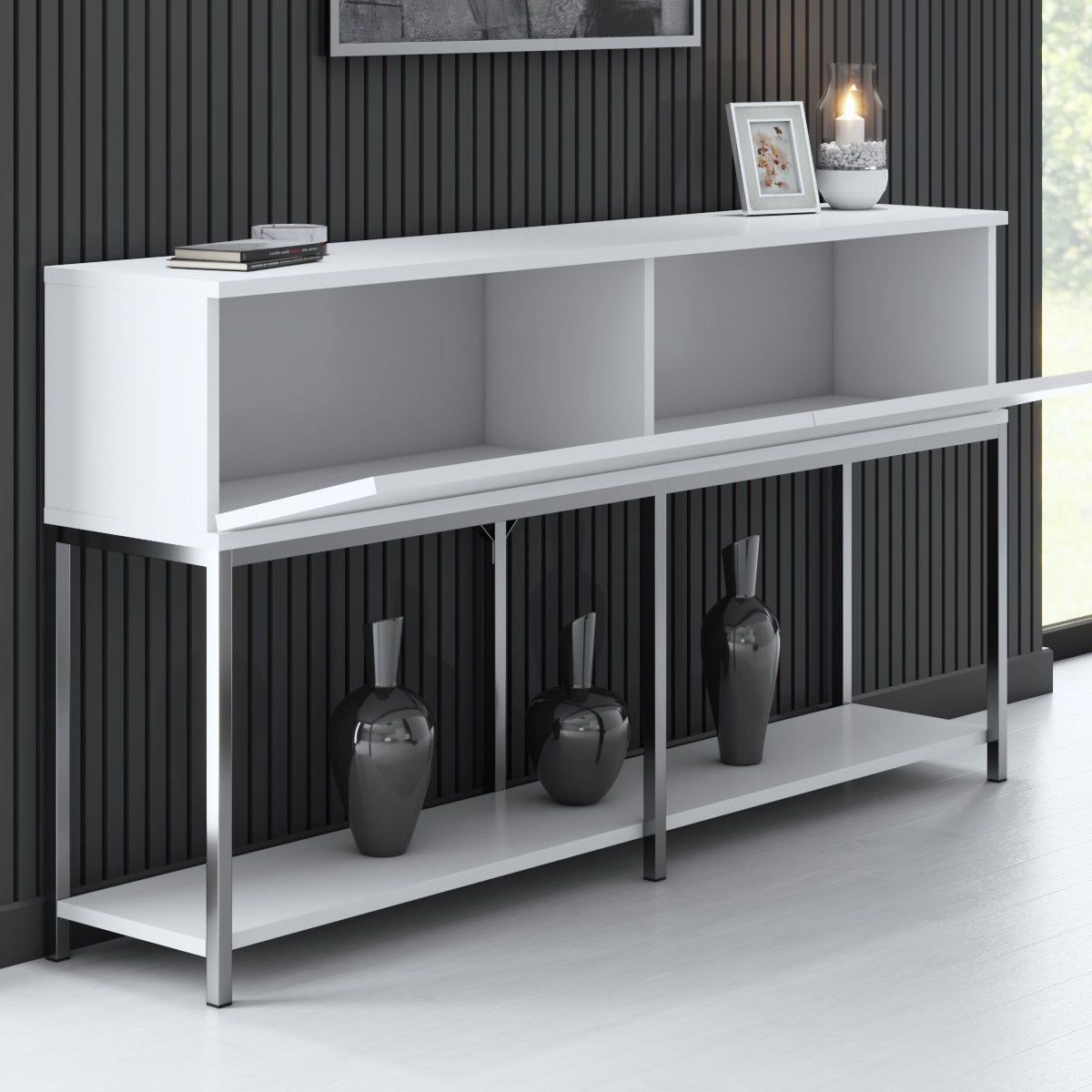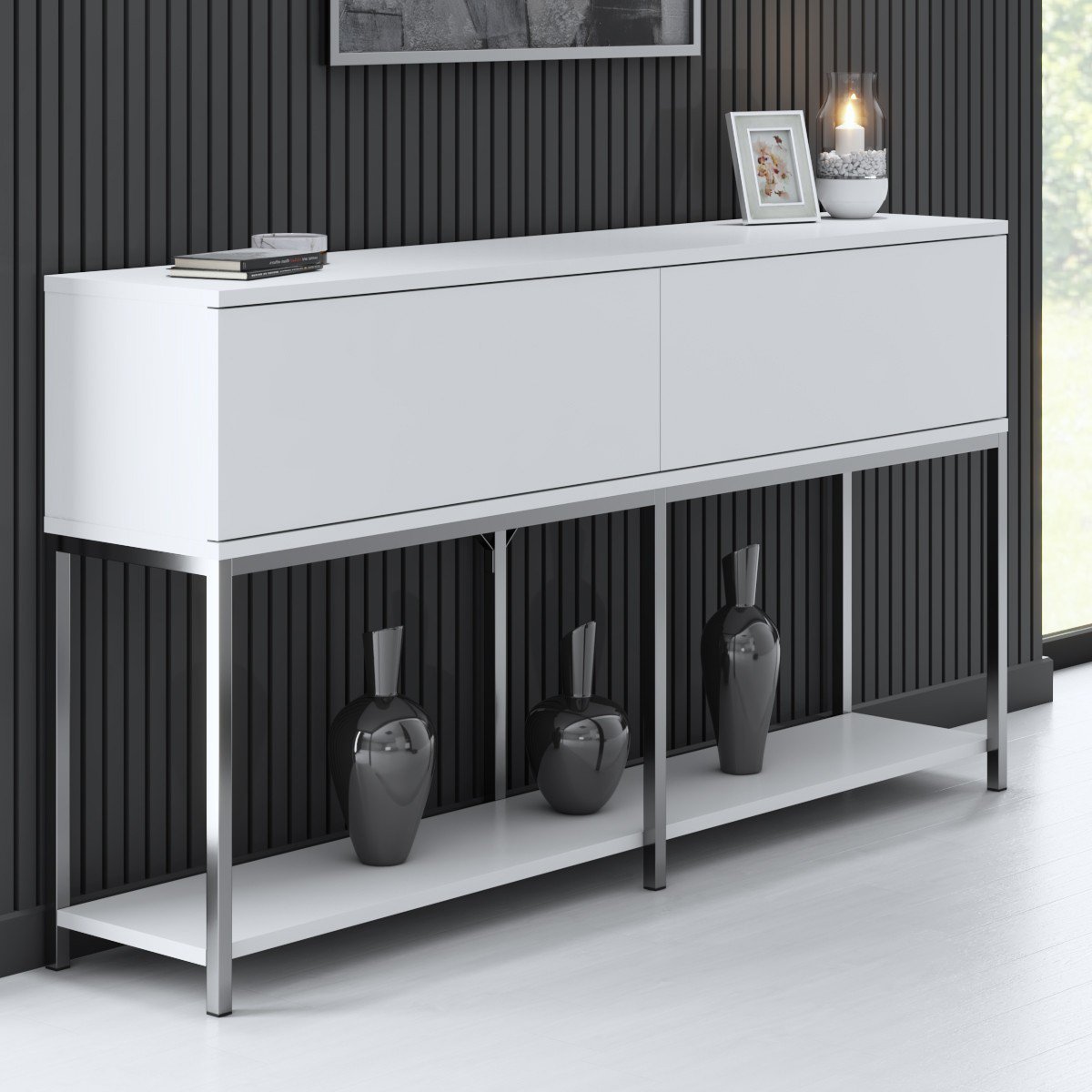 Productkenmerken: Gemaakt van melamine spaanplaten. FSC-gecertificeerd, wat betekent dat het product voor 100% is gemaakt van gerecycled hout uit duurzaam beheerde bossen. Metalen poten. Antraciet en zilverkleurig. Melamine coating voor een gladde en glanzende afwerking. Productafmetingen: Lengte 150 cm x Hoogte 80 cm x Breedte 30 cm - Nettogewicht: 25 kg. Verpakkingsafmetingen: Verpakking nr. 1: Lengte 38 cm x Hoogte 10 cm x Breedte 155 cm - Brutogewicht: 26 kg.