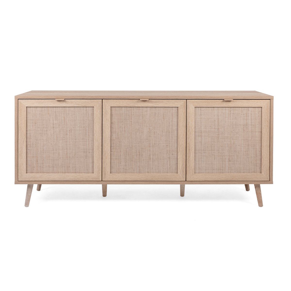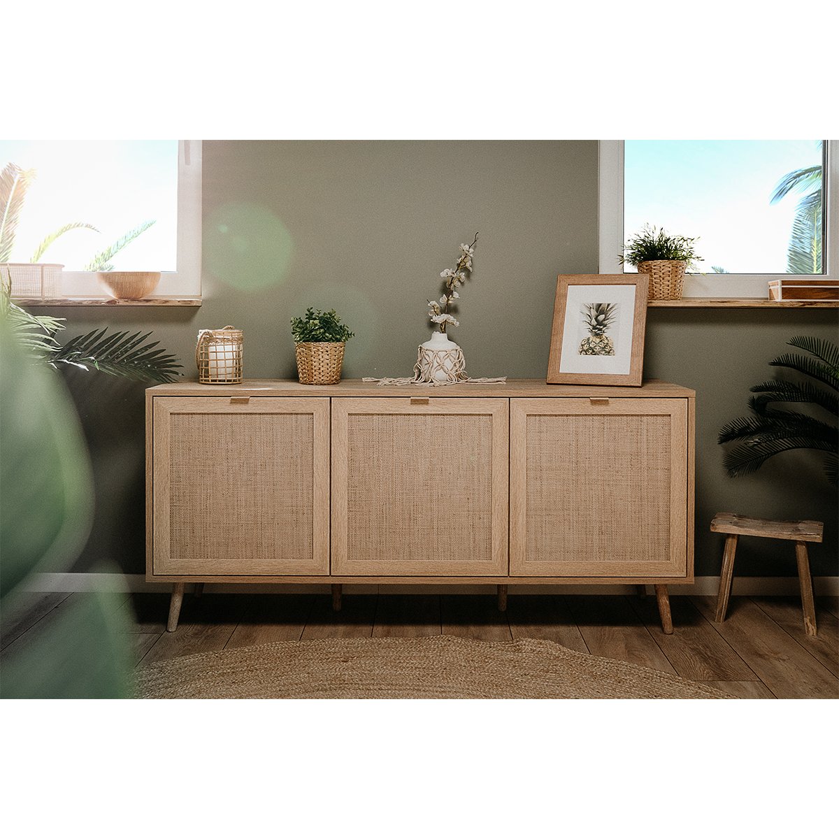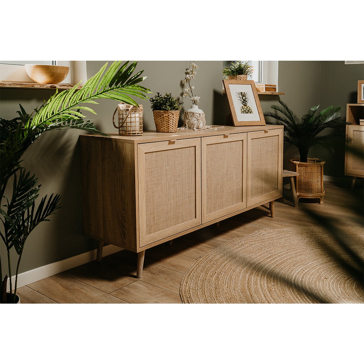 Kies voor deze Functionele en esthetische Dressoir met 3 deuren en een lengte van 150 cm - Rotan afdruk - Bali! Of je het nu in de hal of in de eetkamer plaatst, het past altijd bij de ruimte en biedt ruimte voor je servies, decoraties en andere gewenste objecten. Het natuurlijke ontwerp en de vorm geven het een vintage en sobere uitstraling. Productkenmerken : Buffetkast gemaakt van spaanplaat (15 mm), MDF en 3 deuren. Decoratie: Sonoma eiken, deuren met decoratieve rotan afdruk. (Let op, dit is een afdruk op een paneel, geen gevlochten rotan). Massief houten poten, deuren met een versteksnede van 45°. Gemaakt in Europa. Productafmetingen : Lengte 150 cm x Hoogte 71 cm x Breedte 40 cm. Nettogewicht: 36 kg. Afmetingen van het pakket : Pakket nr. 1: Lengte 160,5 cm x Hoogte 47,5 cm x Breedte 8 cm - Brutogewicht: 21,8 kg. Pakket nr. 2: Lengte 63 cm x Hoogte 56,5 cm x Breedte 15,5 cm - Brutogewicht: 17,7 kg.
