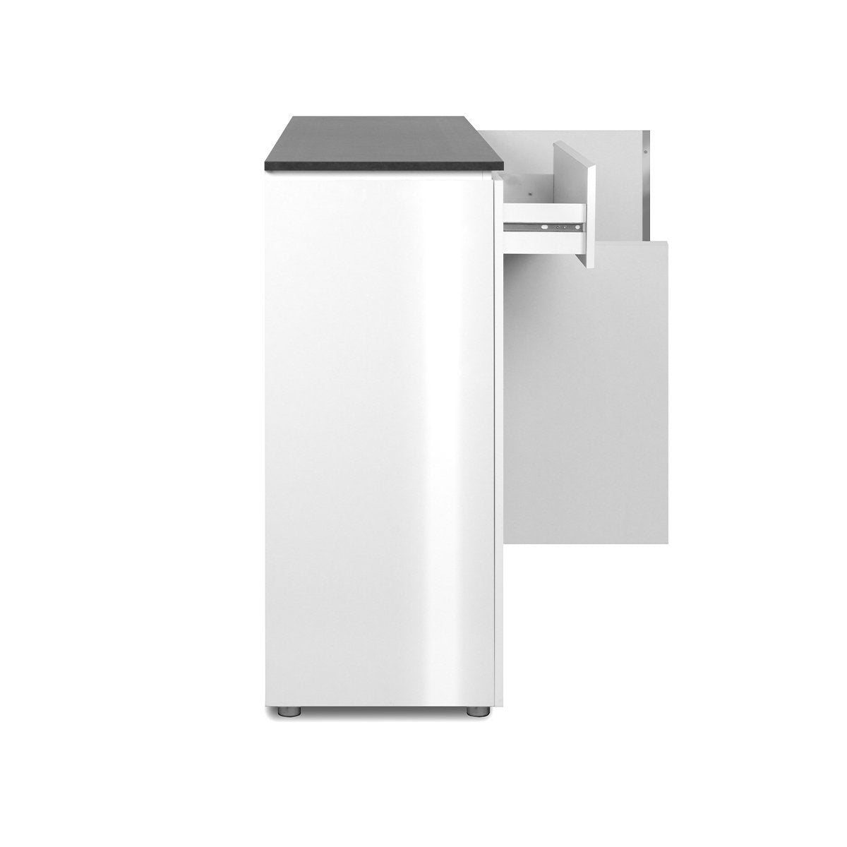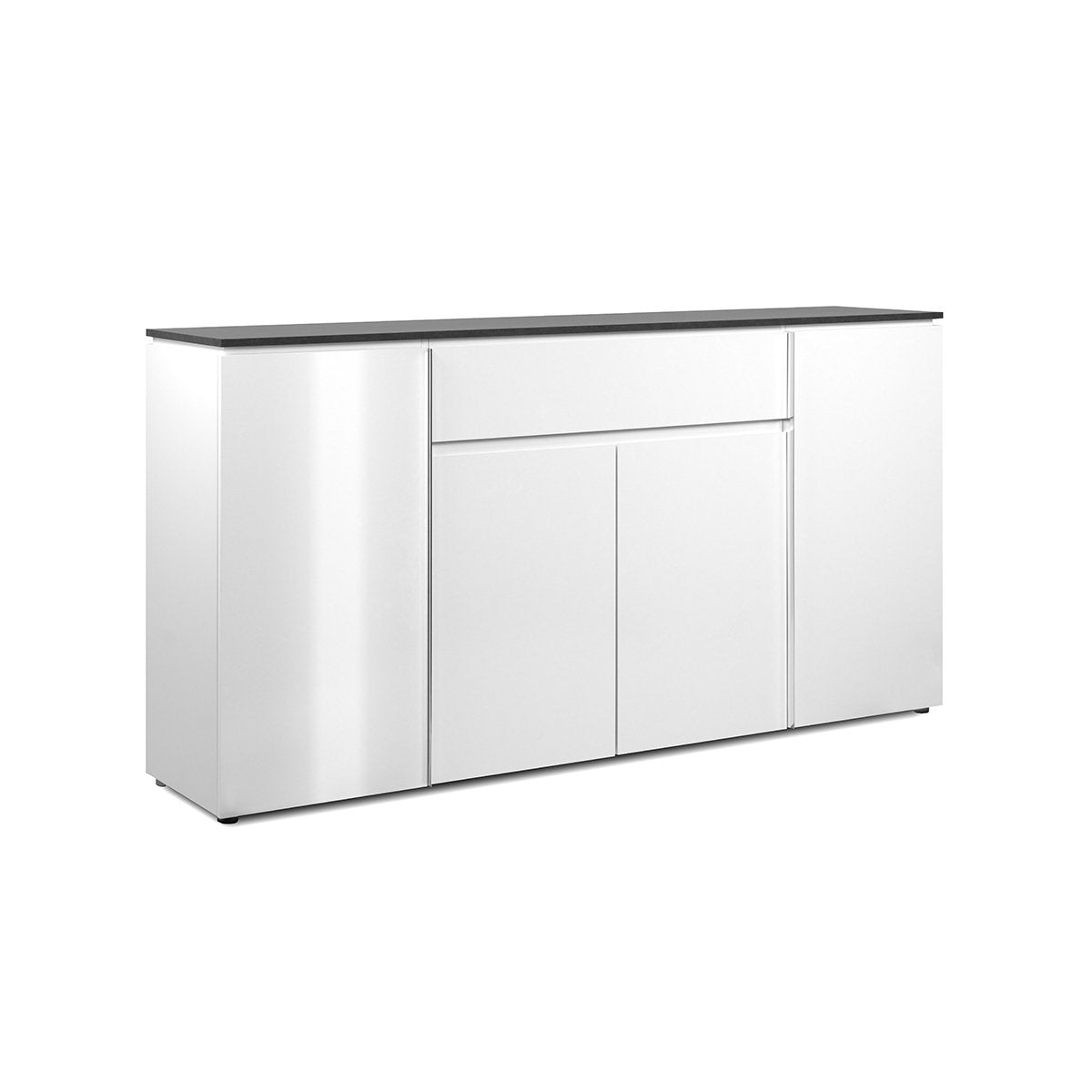 Productkenmerken: Grote plastic handgrepen met een verchroomd effect, een dun blad van 15 mm dikte en zwevend. 2 zijdeuren met elk 1 plank erachter, 2 middelste deuren met 1 grote plank aan de binnenkant, 1 grote lade in het midden. Productafmetingen: Lengte 177,5 cm x breedte 40 cm x hoogte 92 cm - Netto gewicht 59,5 kg. Verpakkingsafmetingen: Verpakking nr. 1: Lengte 186 cm x hoogte 9,5 cm x diepte 46 cm - Brutogewicht: 30,5 kg. Verpakking nr. 2: Lengte 104 cm x hoogte 14,5 cm x diepte 51 cm - Brutogewicht: 30,9 kg. Totale brutogewicht: 61,4 kg.