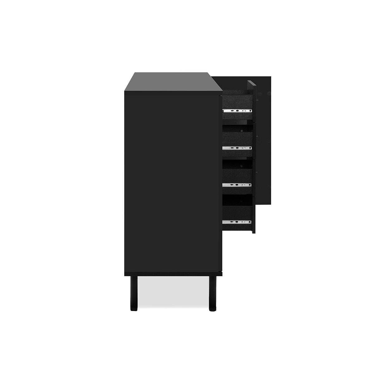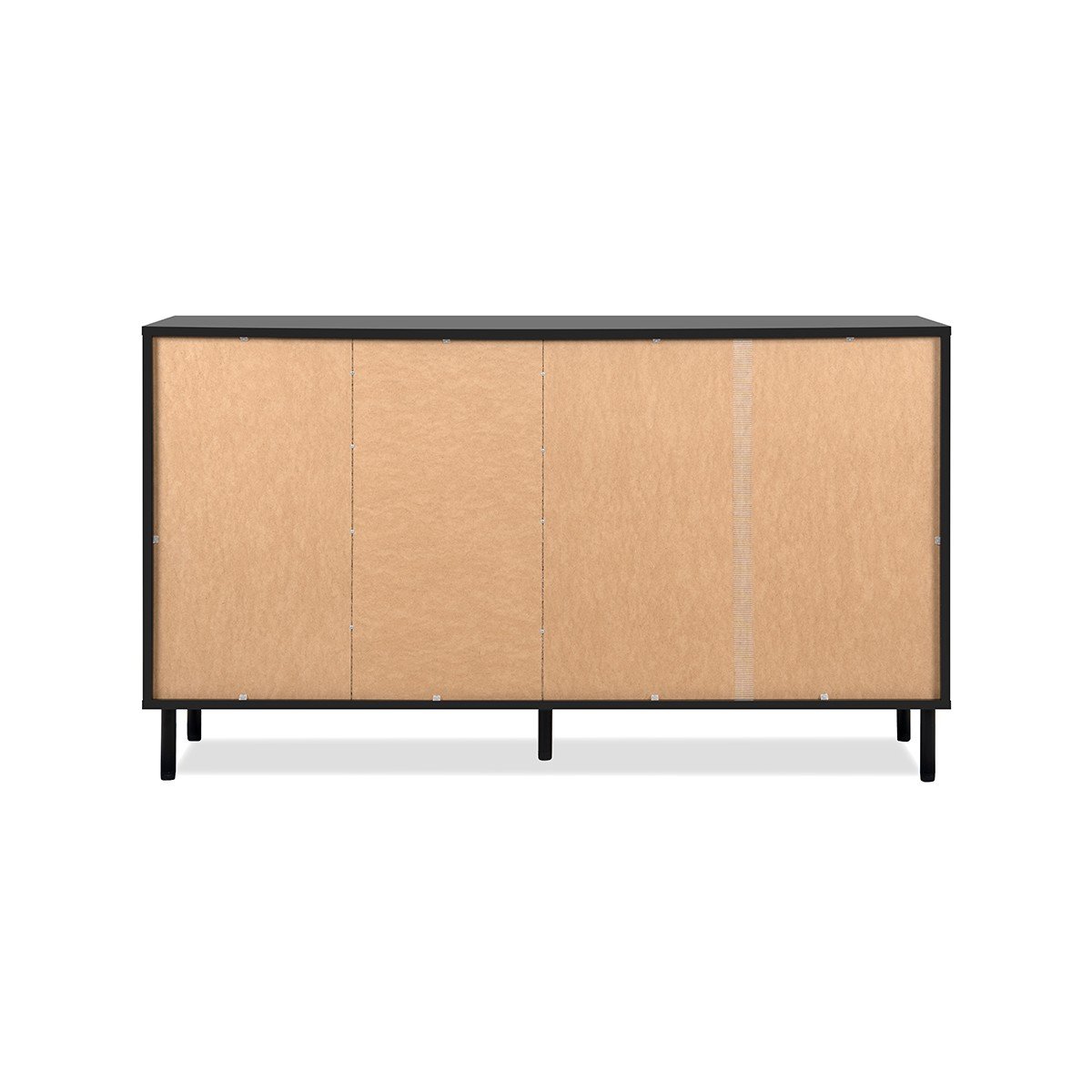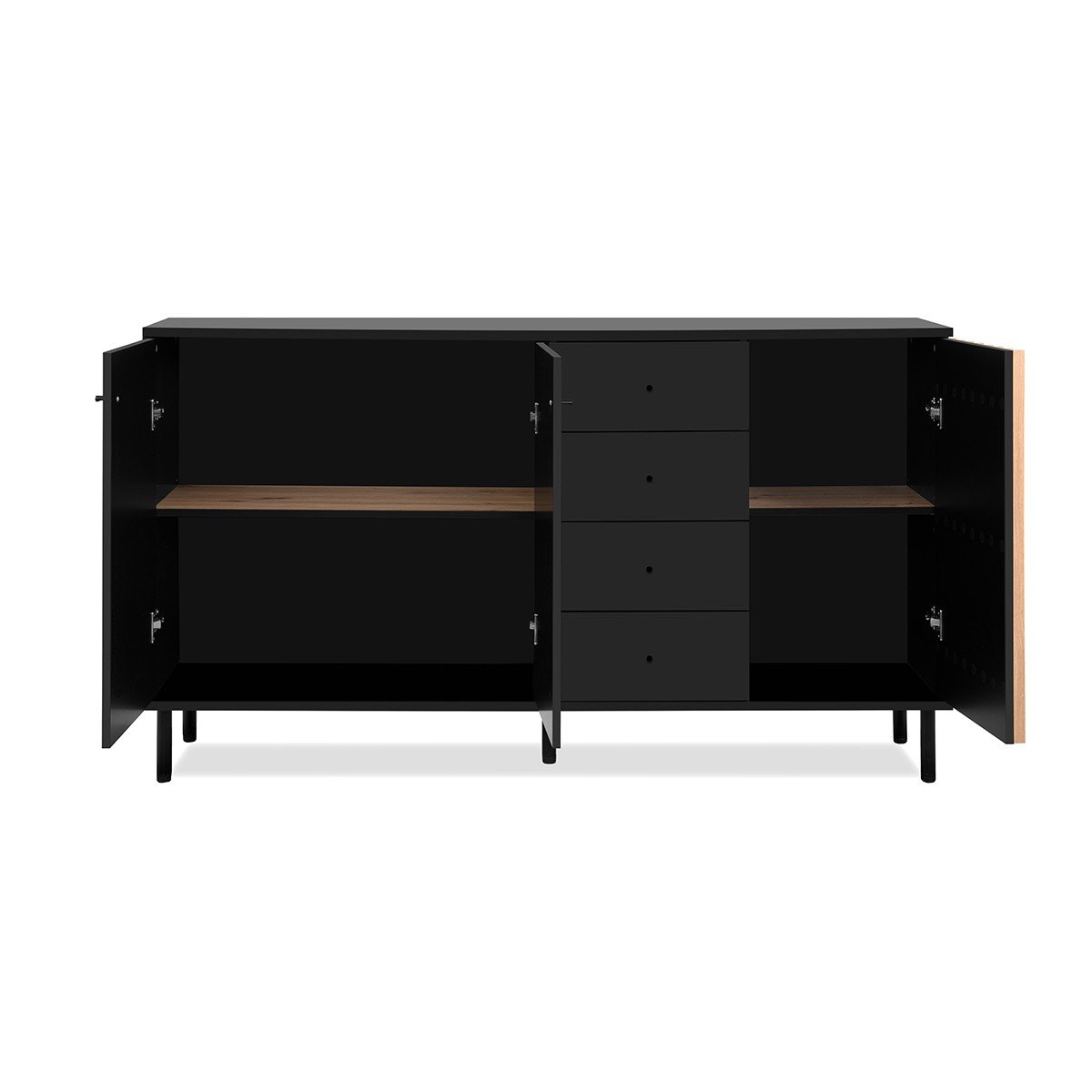 Productkenmerken: Lamellen van MDF in eiken ambachtelijke kleur en achterpaneel in matzwarte kleur. Zwarte metalen handgrepen. Anti-vingerafdruk zwart decor. Ronde metalen poten. ABS-randen. 2 volle deuren en 1 deur met lamellen. 1 plank achter elke deur. 4 laden. Productafmetingen: Lengte 160 cm x Breedte 40 cm x Hoogte 90 cm - Nettogewicht: 56 kg. Afmetingen van de verpakking: Doos nr. 1: Lengte 169 cm x Hoogte 10 cm x Diepte 48 cm - Bruto gewicht: 29 kg. Doos nr. 2: Lengte 97 cm x Hoogte 17,5 cm x Diepte 48 cm - Bruto gewicht: 31 kg.