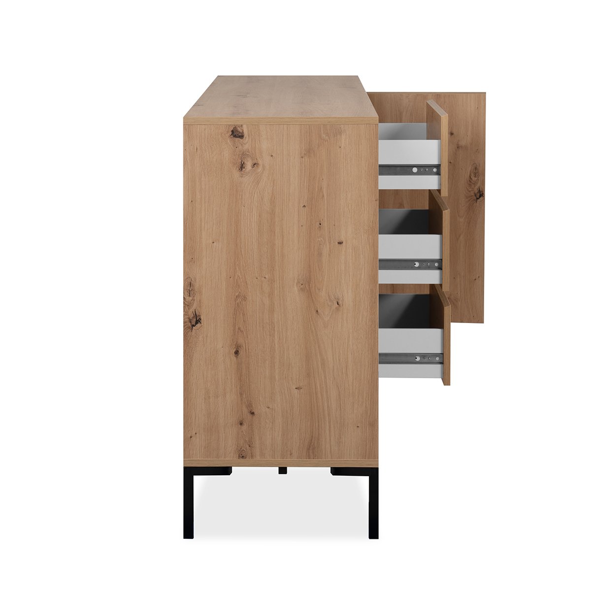 Ontdek onze Buffetkast met 3 deuren, 3 laden en 2 planken L170 cm - Plock. Deze buffetkast biedt opbergruimte voor je interieur. De verschillende opbergmogelijkheden helpen je om je spullen georganiseerd en netjes te houden. Het ambachtelijke eiken decor geeft een warme en eigentijdse uitstraling aan je interieur. Productkenmerken: Materialen: Spaanplaat / Metalen poten. 2 deuren. 3 laden. 1 plank. Ambachtelijk eiken decor. Productafmetingen: Lengte 170 cm x Breedte 40 cm x Hoogte 87 cm - Nettogewicht: 55,9 kg. Verpakkingsafmetingen: Verpakking nr. 1: Lengte 102 cm x Hoogte 48,5 cm x Diepte 18,5 cm - Brutogewicht: 30,9 kg. Verpakking nr. 2: Lengte 180,5 cm x Hoogte 49 cm x Diepte 8,5 cm - Brutogewicht: 29 kg. Totaal brutogewicht: 59,9 kg.