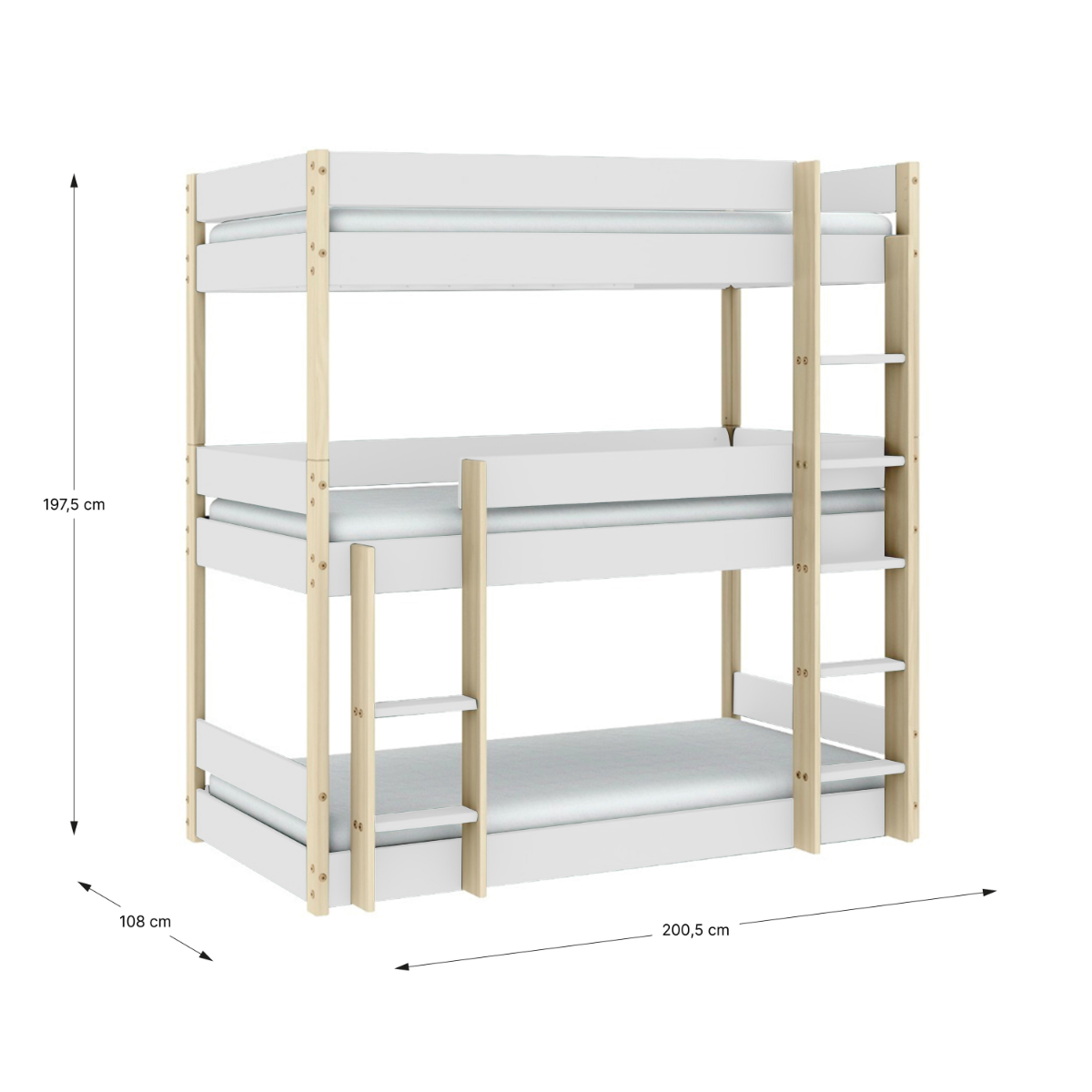 - Stapeldbed met slaapoppervlakken van 90x190 cm, wit gelakt en licht hout decor.