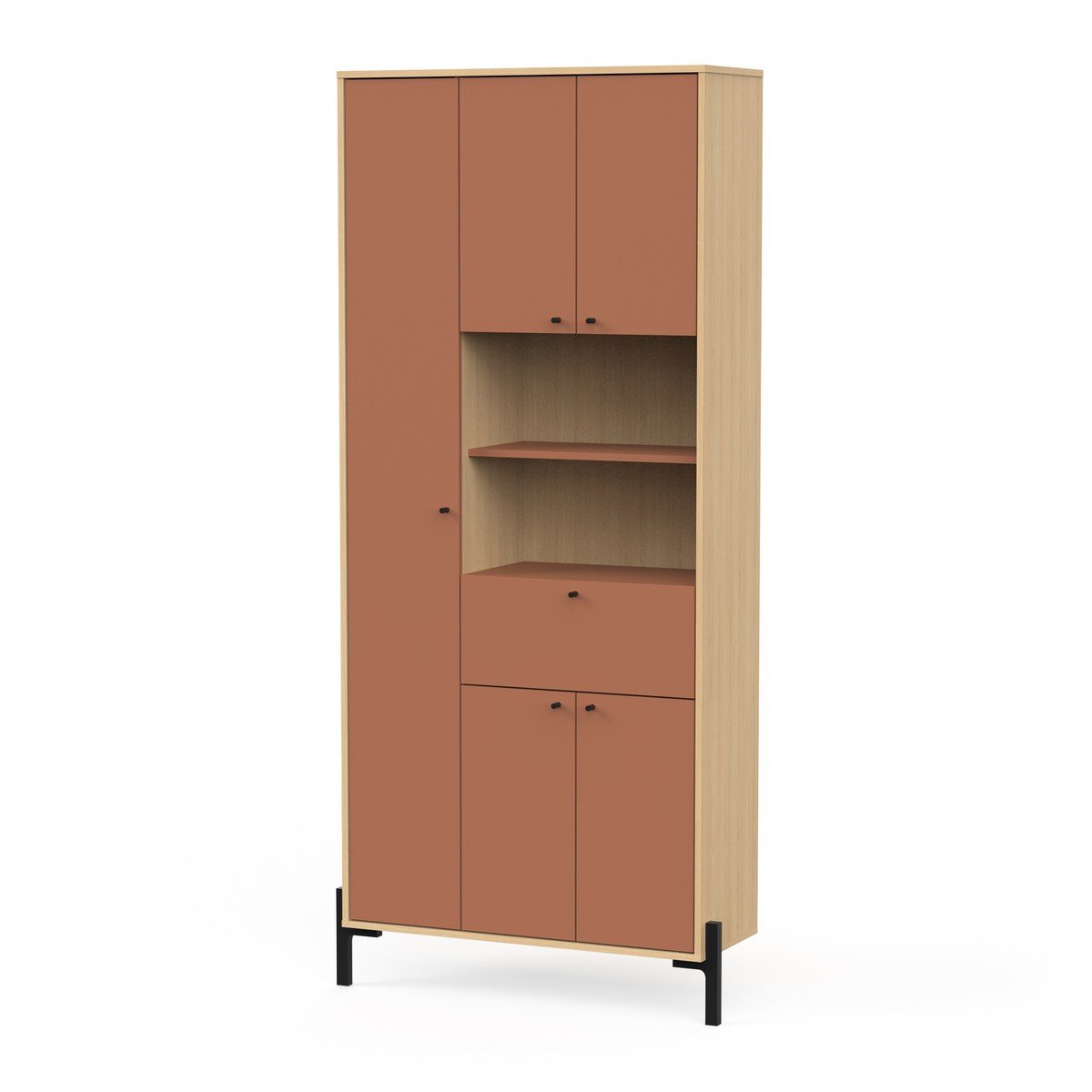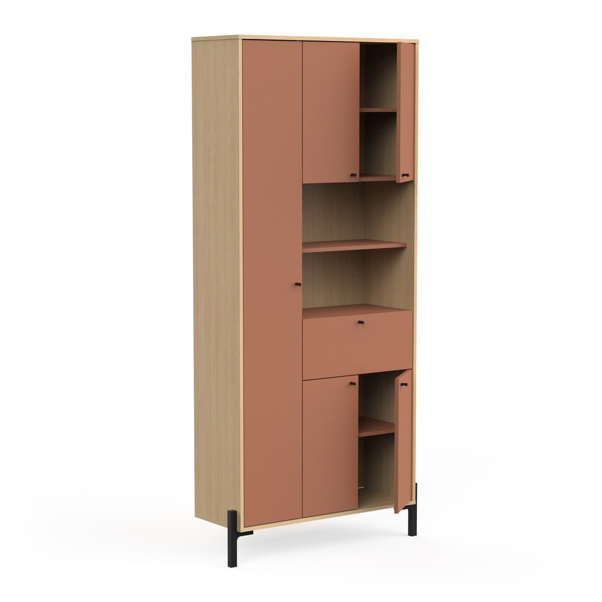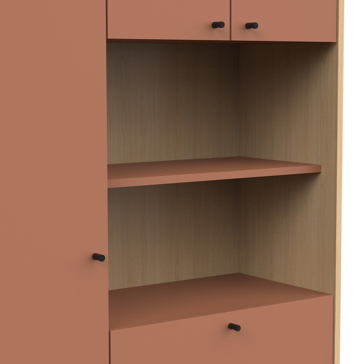 - Kastkolom met 4 deuren, 1 lade en 2 open vakken, gemaakt van 15 mm melaminepanelen in eikenhoutdecor gecombineerd met terracotta of mineraalgroen.
