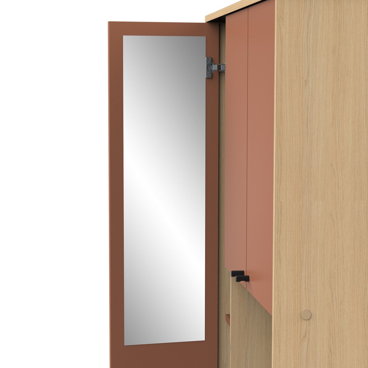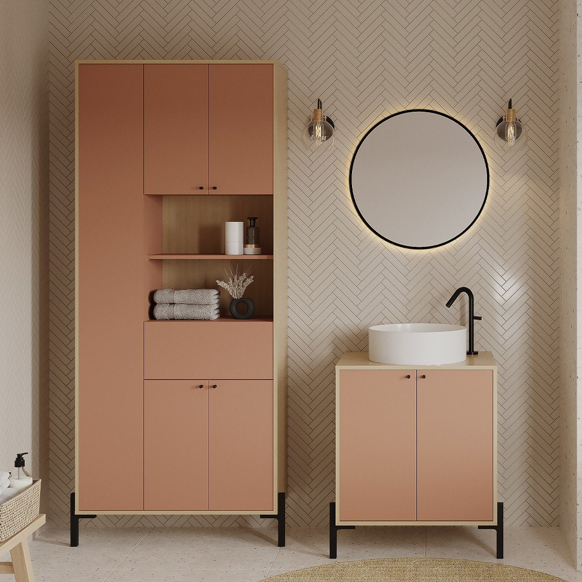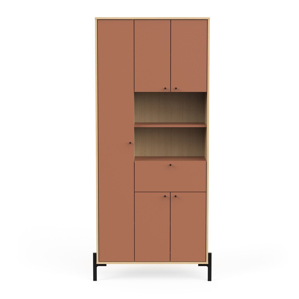 - Kastkolom met 4 deuren, 1 lade en 2 open vakken, gemaakt van 15 mm melaminepanelen in eikenhoutdecor gecombineerd met terracotta of mineraalgroen.