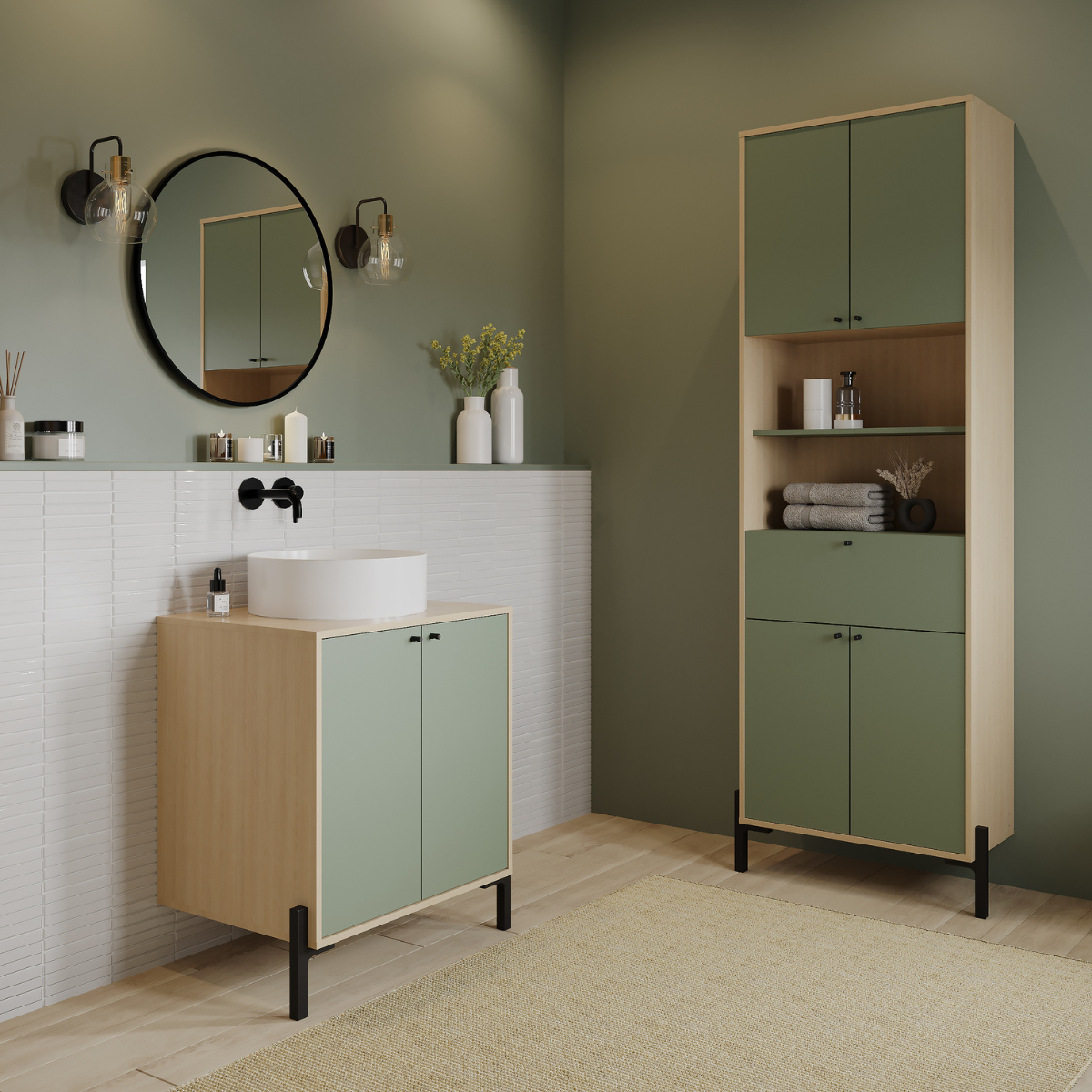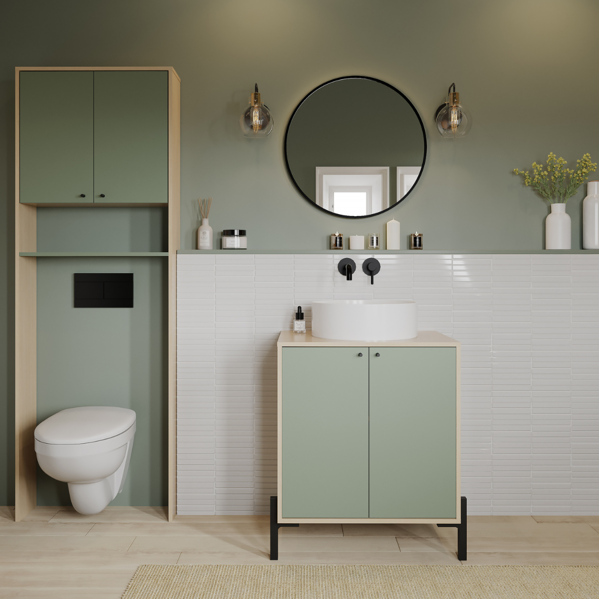 - Wastafelkast met 2 deuren, gemaakt van 15 mm melaminepanelen in eikenhoutdecor gecombineerd met terracotta of mineraalgroen.