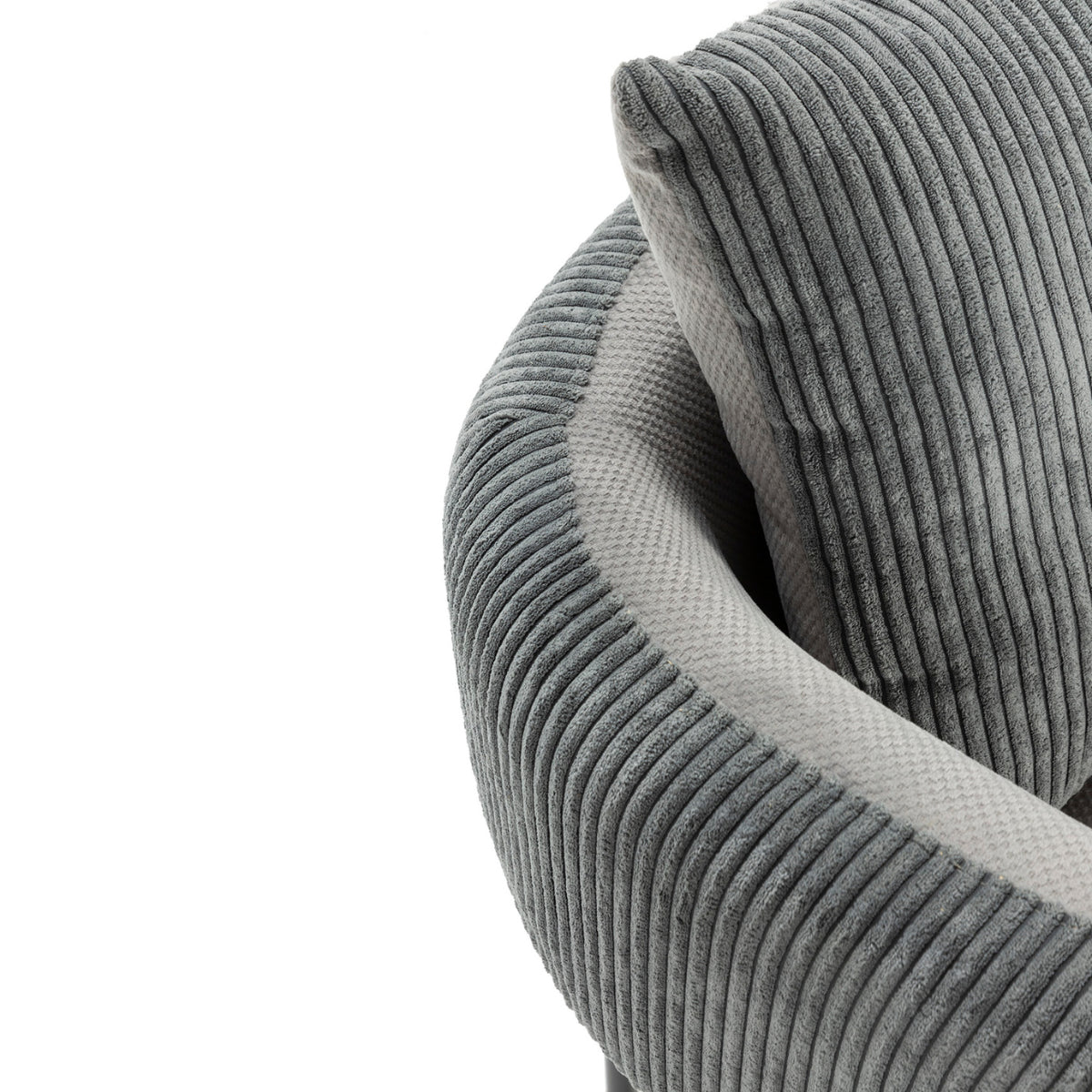 - Zit- en rugleuning: Stof, poten van zwart gelakt metaal.
