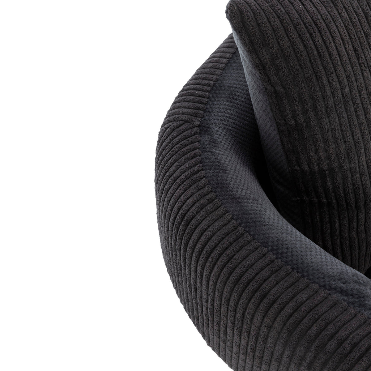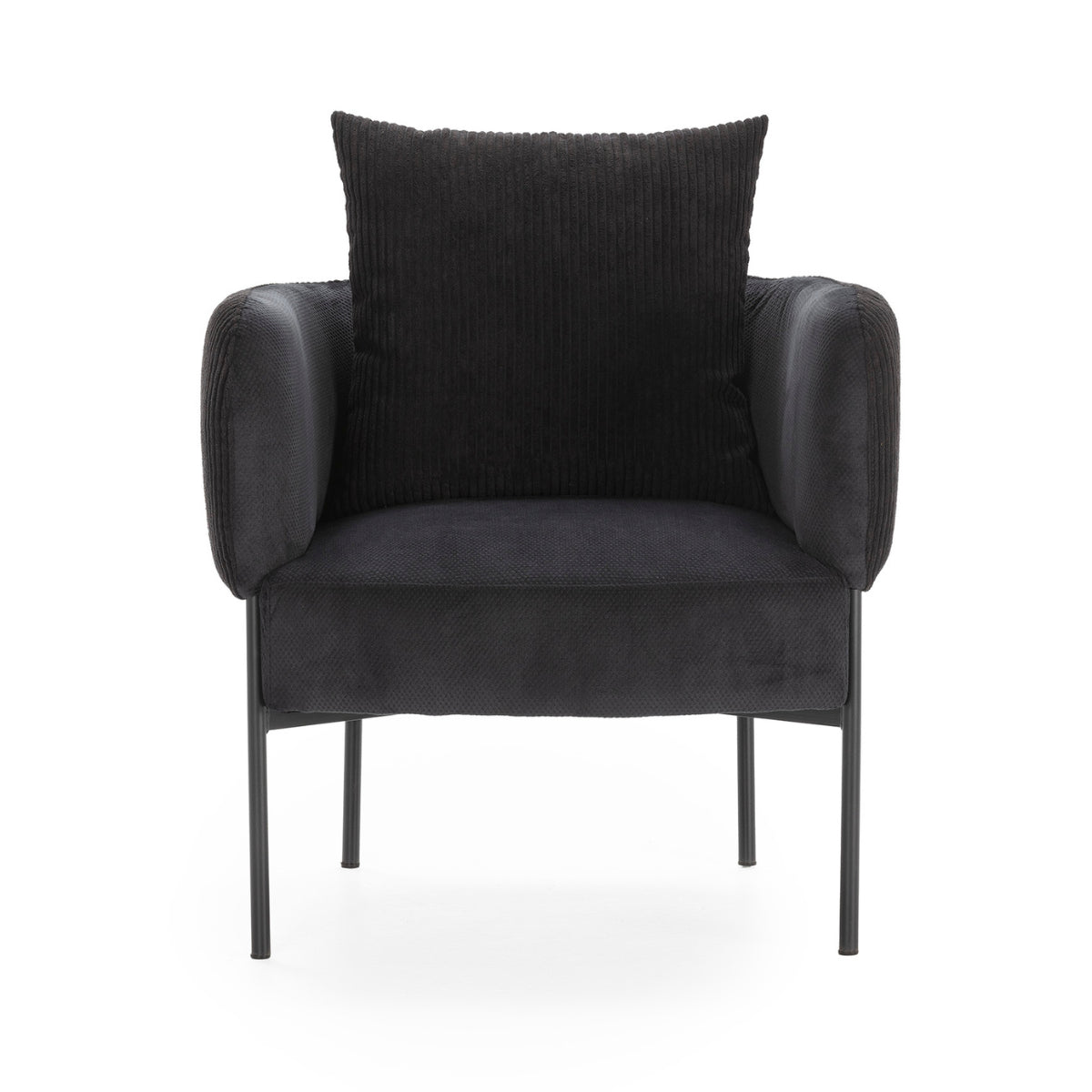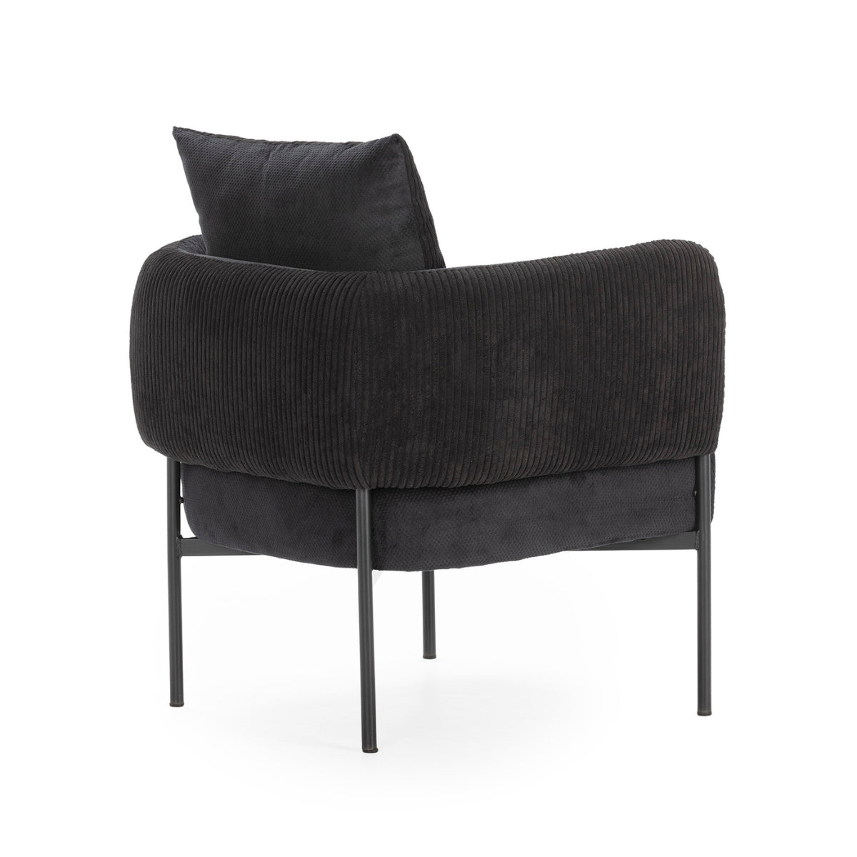 - Zit- en rugleuning: Stof, poten van zwart gelakt metaal.