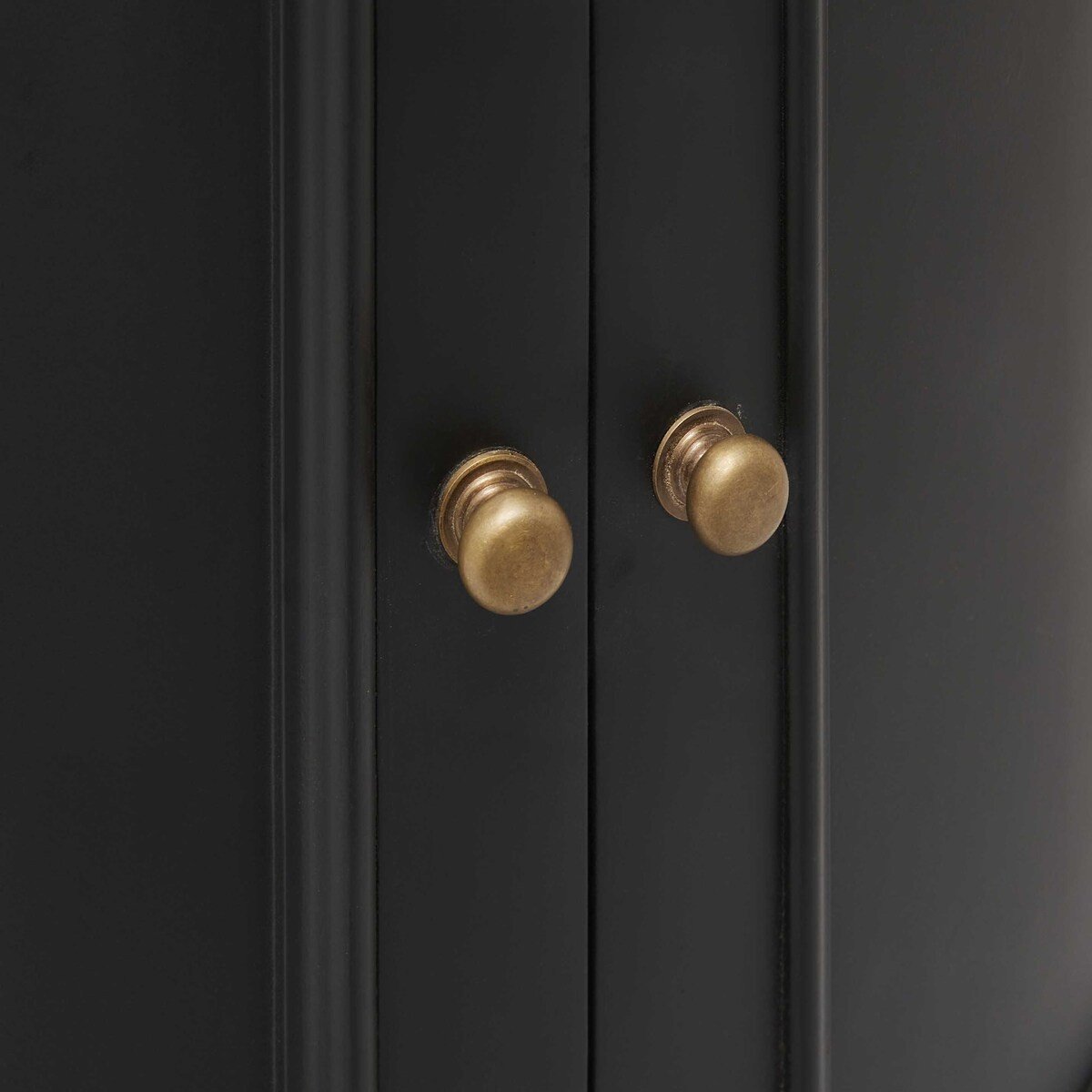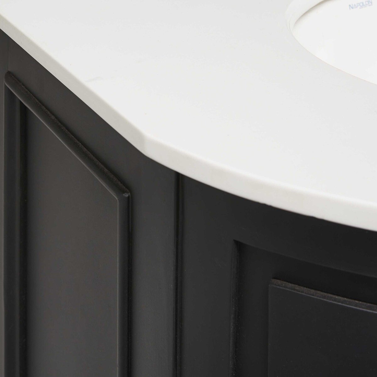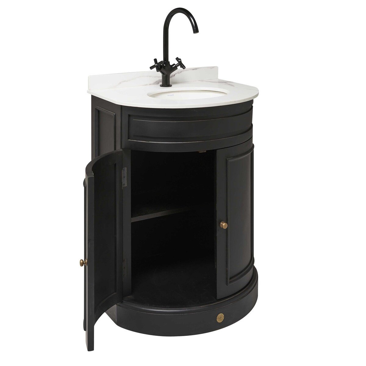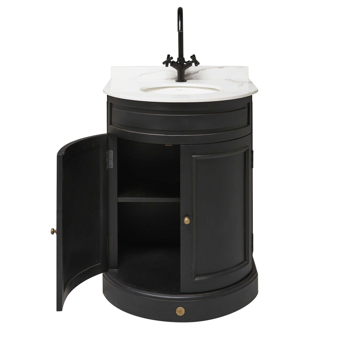 Compact en verfijnd, het wastafelmeubel HAUSMLANN is een elegante oplossing voor kleine ruimtes. De gebogen structuur met een diepzwarte afwerking geeft het een tijdloze uitstraling, versterkt door een wit geaderd marmeren blad van grote verfijning. Achter de gebogen deuren biedt het praktische opbergruimte voor uw badkamerbenodigdheden. Een functioneel en stijlvol meubelstuk, perfect om ruimtebesparing en elegantie te combineren. Materialen: Massief acaciahout en acaciafineer.