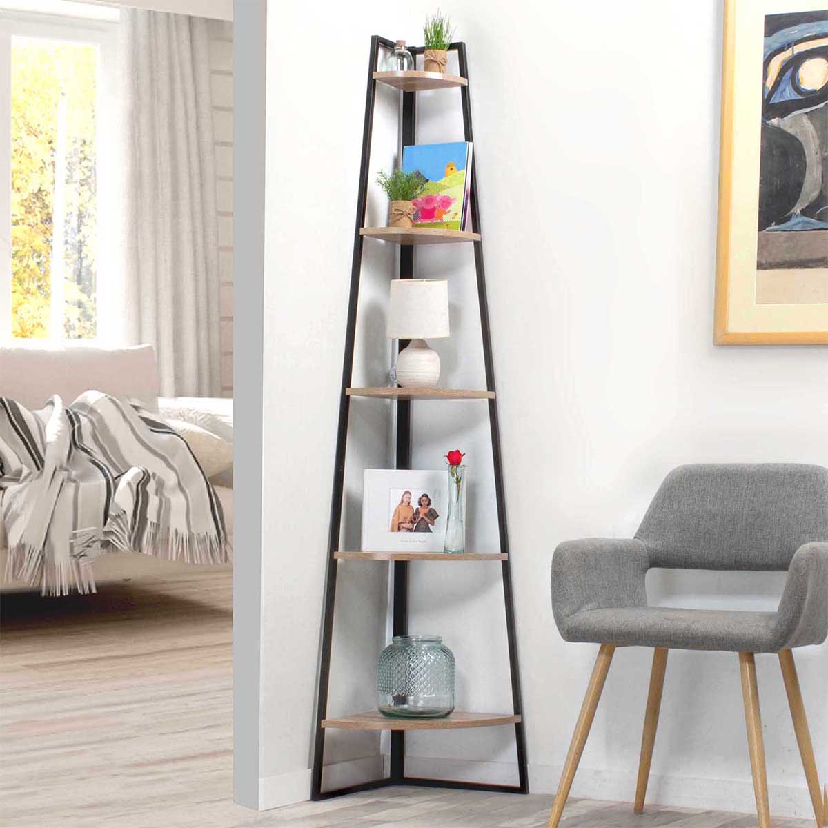 Ontdek onze Hoekplank 5 niveaus Houtdecor H180 cm - Colorado, handig om de ruimte in uw kamer te optimaliseren door een zowel esthetisch als praktisch opbergmeubel te kiezen. Ideaal voor kleine kamers of studentenwoningen!Kenmerken:Hoekplank met 5 opbergniveaus.Maximale belasting per plank: 5 kg.Meubel wordt geleverd in een bouwpakket, eenvoudig te monteren.De plank kan aan de muur worden bevestigd (een metalen beugel en bevestigingsschroeven worden meegeleverd).Structuur van 16 mm spaanplaat, met houtdecorHoogte tussen elke plank: 37 cmAfmetingen: L 36 cm x B 36 cm x H 180 cmGewicht: 5,20 kg