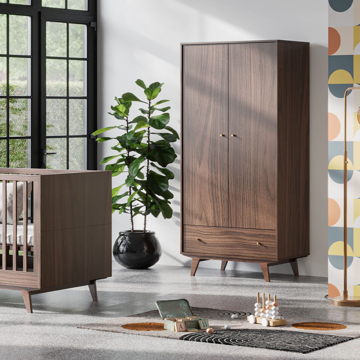 Productkenmerken: Drie kleuren: Houtdecor, walnoot en zwart / Houtdecor, walnoot / Wit, poten in walnootkleur. Aan de linkerkant, 2 in hoogte verstelbare planken, uitgerust met een kledingstang. Aan de rechterkant, 4 in hoogte verstelbare planken. Onderaan, 1 lade uitgerust met metalen rails. Massief houten poten en metalen handgrepen. Productafmetingen: Lengte 90 cm x Breedte 50 cm x Hoogte 185 cm - Nettogewicht: 82 kg. Afmetingen van het pakket: Pakket nr. 1: Hoogte 8 cm x Breedte 56,5 cm x Diepte 121,5 cm - Bruto gewicht: 20 kg. Pakket nr. 2: Hoogte 9 cm x Breedte 52 cm x Diepte 95,5 cm - Bruto gewicht: 22,5 kg. Pakket nr. 3: Hoogte 5 cm x Breedte 56 cm x Diepte 119,5 cm - Bruto gewicht: 22,5 kg. Pakket nr. 4: Hoogte 6 cm x Breedte 52 cm x Diepte 151,5 cm - Bruto gewicht: 22 kg. Totaal bruto gewicht: 87 kg.