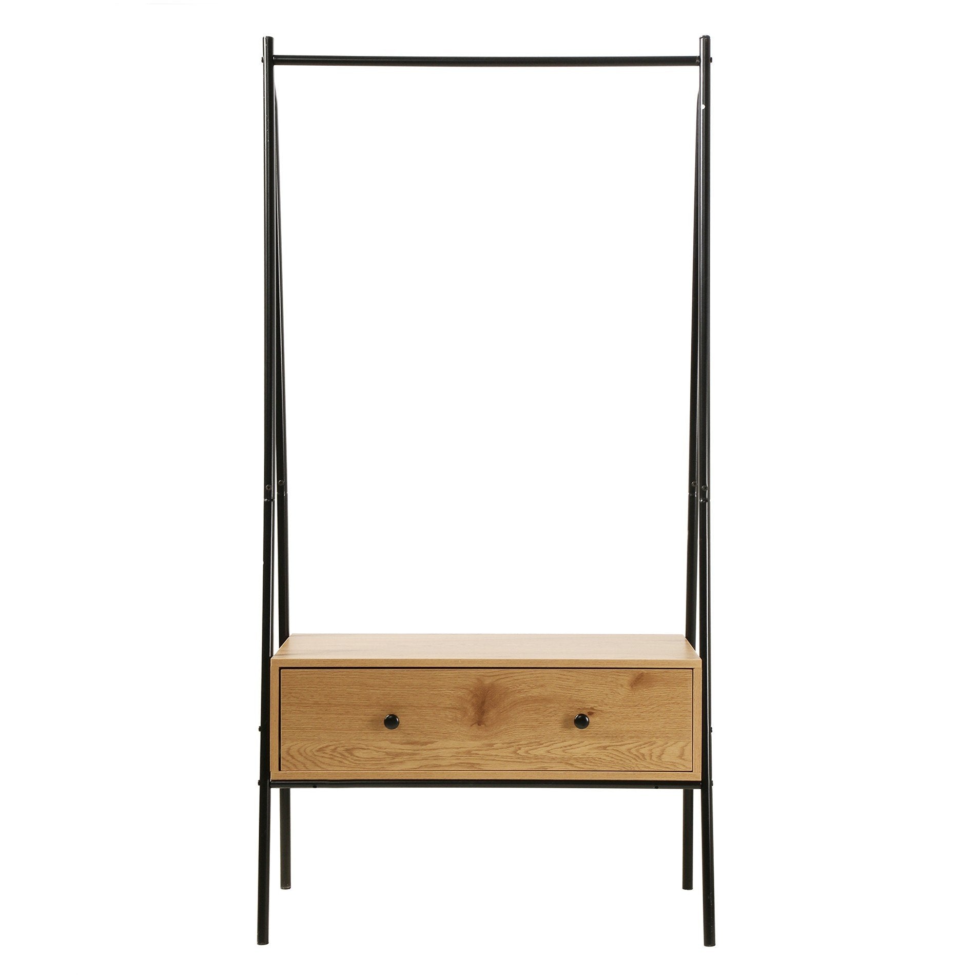 Deze zwarte metalen garderobekast met 1 lade (eiken decor H170 cm) zal u zeker bevallen en zal perfect staan in een inkomhal, een slaapkamer of een dressing! Dankzij zijn tijdloze industriële stijl en zijn eenvoudig design zal deze garderobekast perfect staan in elke kamer van het huis! Dit meubel is gemaakt van resistente houten panelen bedekt met een imitatie eiken afwerking. De structuur is gemaakt van zwart mat metaal. De structuur is gemaakt van matzwart metaal, dus hij zal jaren meegaan. De kleerkast heeft een grote opberglade om kleren, schoenen of andere accessoires in op te bergen. Het zal er geweldig uitzien in uw huis of kantoor! Dit meubelstuk komt bij u thuis in kitvorm met instructies en alle nodige schroeven en bouten, u hebt maar weinig tijd nodig om het op te zetten! Kenmerken van de kleerkast: Materialen: 12/15 mm resistente spaanplaat / Zwart mat stalen structuur. Afmetingen: B 84 x D 39 x H 170 cm . Gewicht : 17.3 Kg