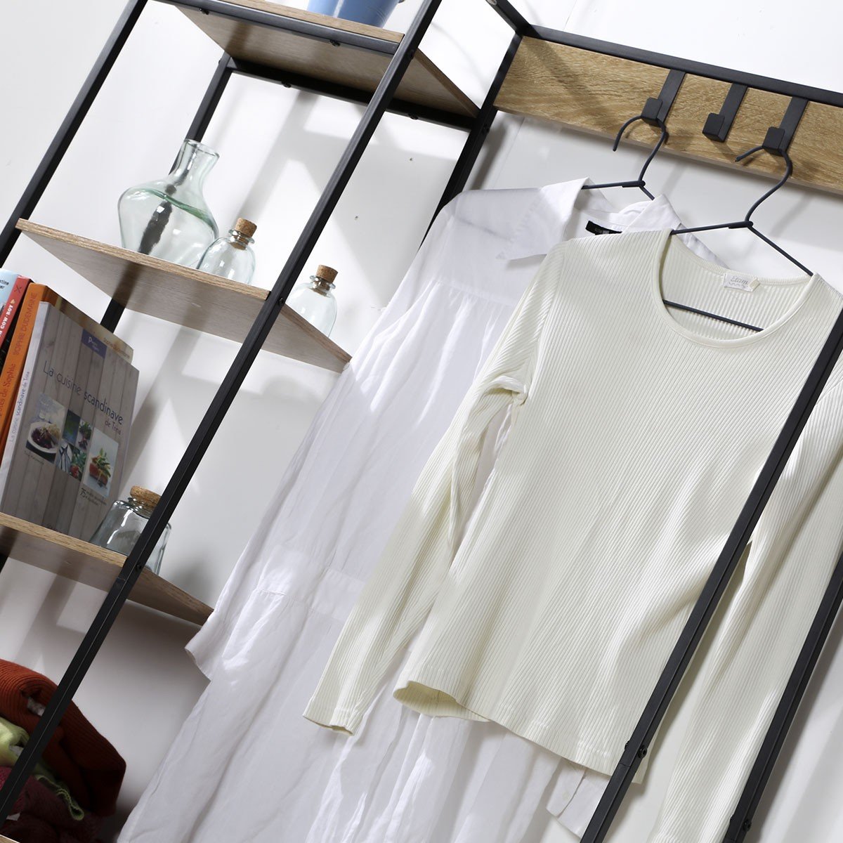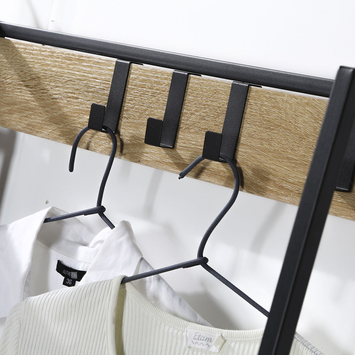 Ontdek onze garderobekast met 4 haken en 5 legplanken met schoenendoos, de ideale opbergcombinatie voor het inrichten van een inkomhal, een gang of een kleedkamer. Dit meubelstuk is gemaakt van hout en is zeer goed bestand tegen slijtage. Het zal in elke kamer van het huis geweldig staan! Dit meubel is gemaakt van resistente houten panelen bedekt met een imitatie eiken afwerking. De structuur is gemaakt van mat zwart metaal. Het zal er geweldig uitzien in elke kamer! Deze meubelset zal er geweldig uitzien in uw huis of kantoor! Hij wordt geleverd in een bouwpakket met een gebruiksaanwijzing en alle benodigde schroeven en bouten, dus u heeft maar een paar minuten nodig om hem in elkaar te zetten! Wandbevestiging is niet nodig, de kast staat op zijn 4 poten. Kenmerken van de kleerkast: Materialen: 12 mm resistente spaanplaat / zwart mat stalen structuur. Afmetingen: B 105 x D 35 x H 160 cm . Gewicht : 21.4 Kg