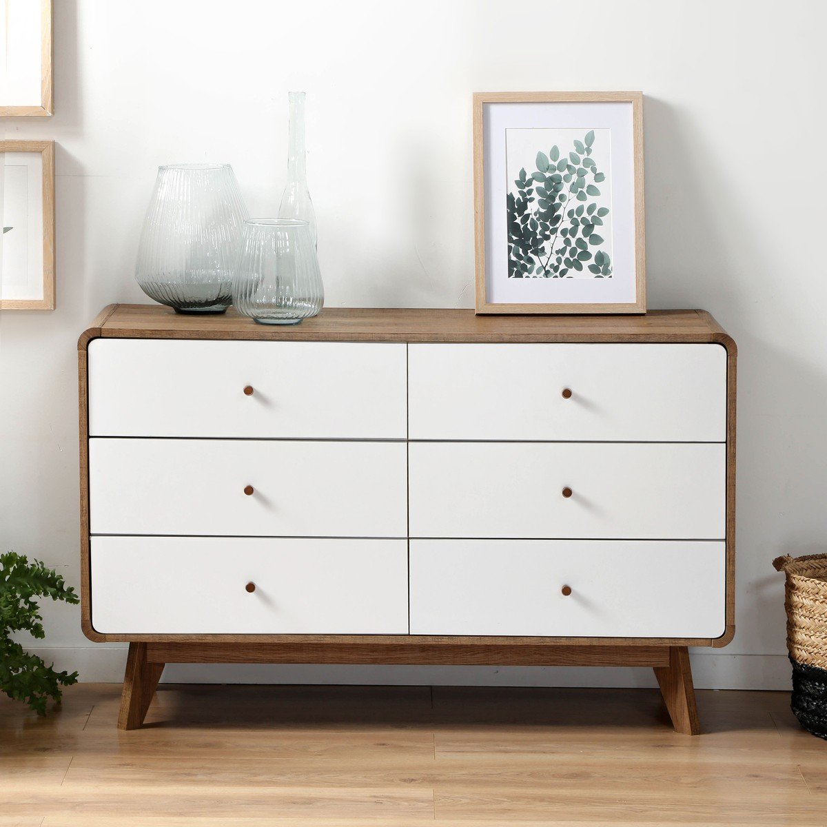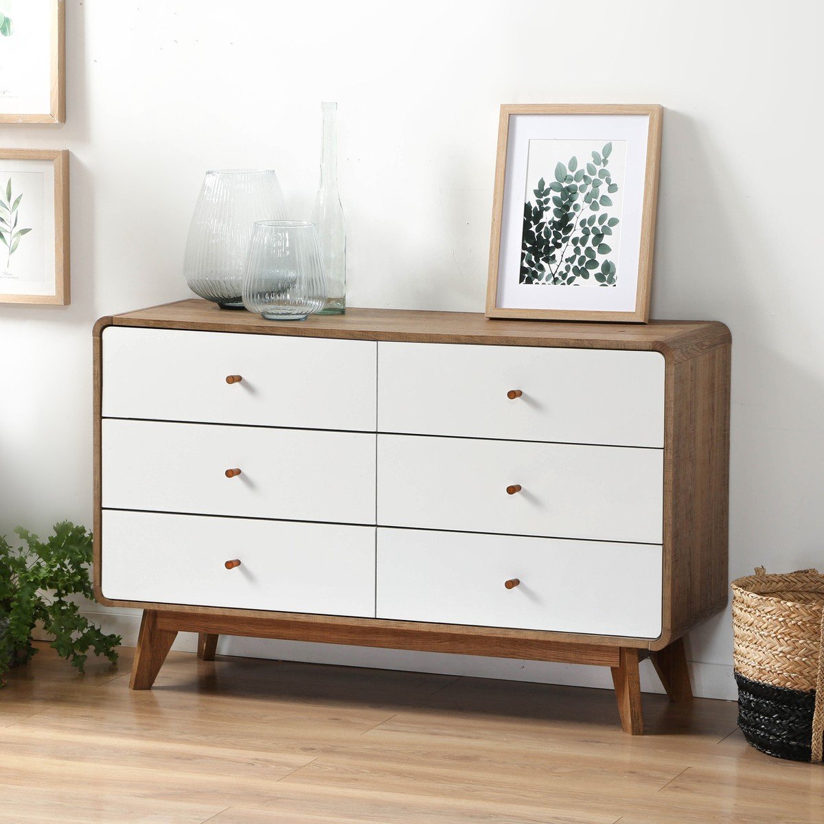 Commode met 6 laden, ontworpen in hoogwaardig melaminepanelen. De structuur en de poten van de commode zijn bedekt met een houtdecor. De ladefronten zijn wit met houten knoppen.