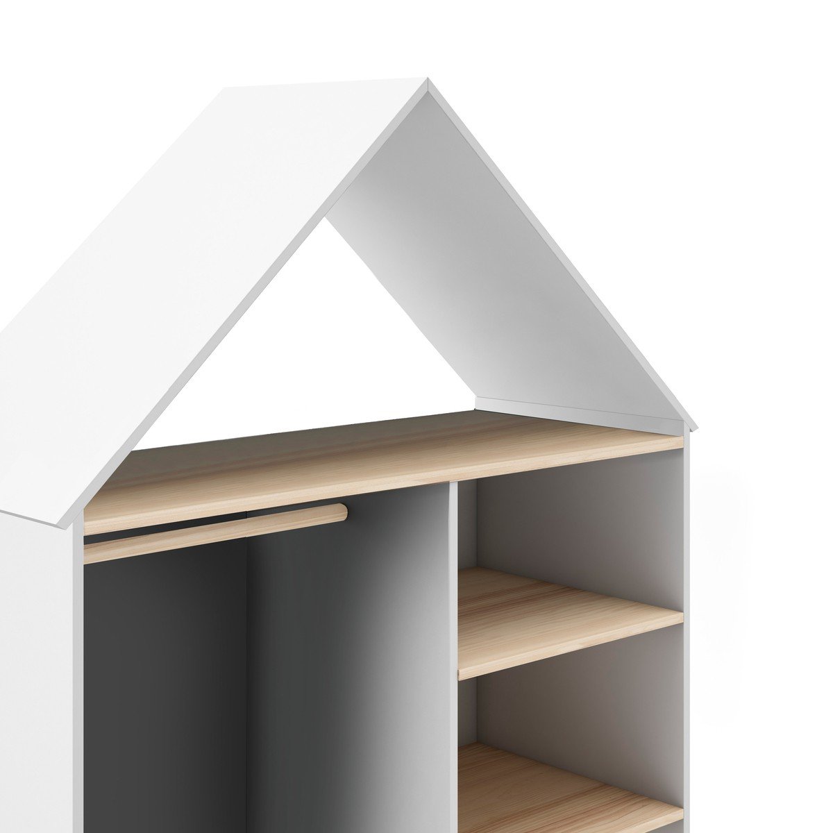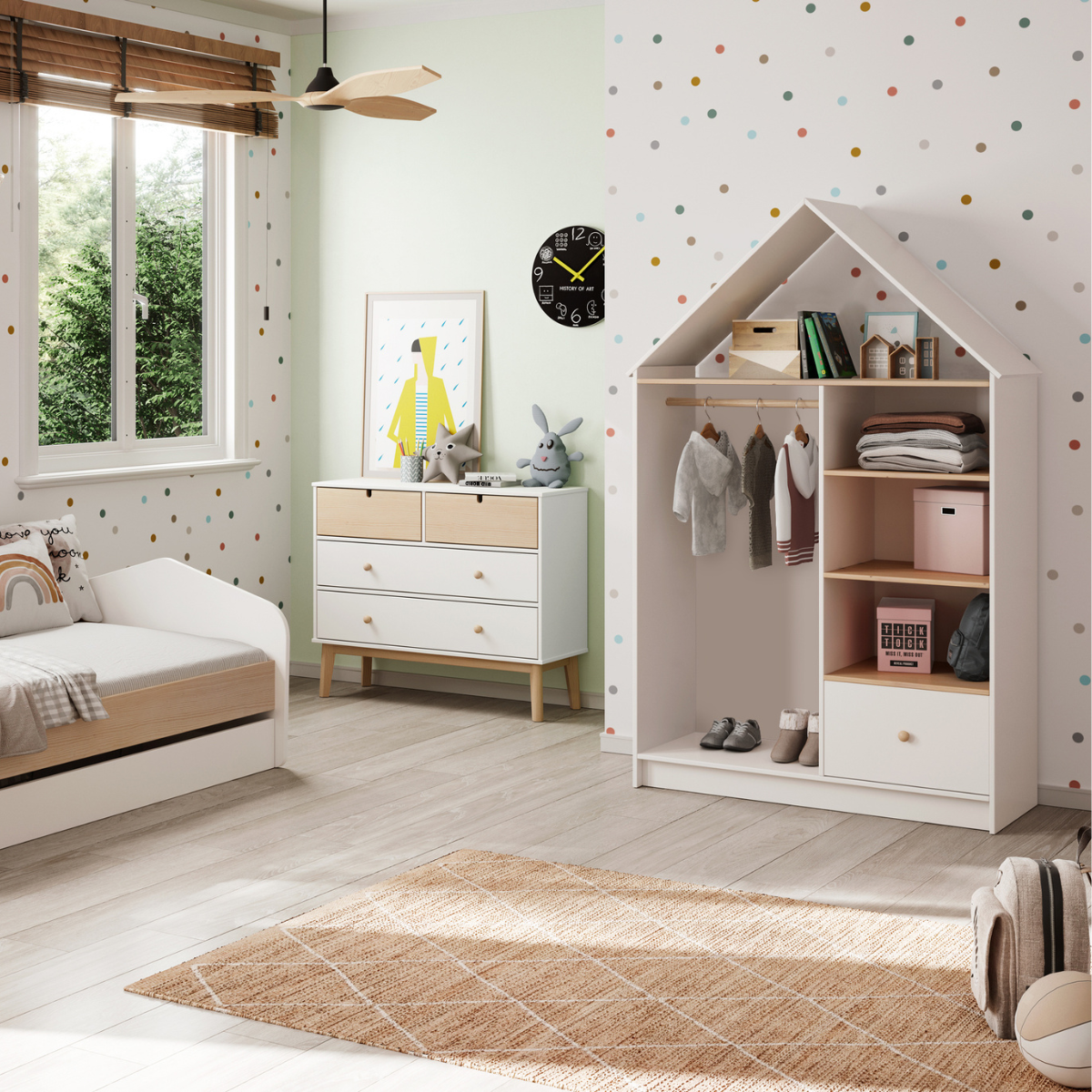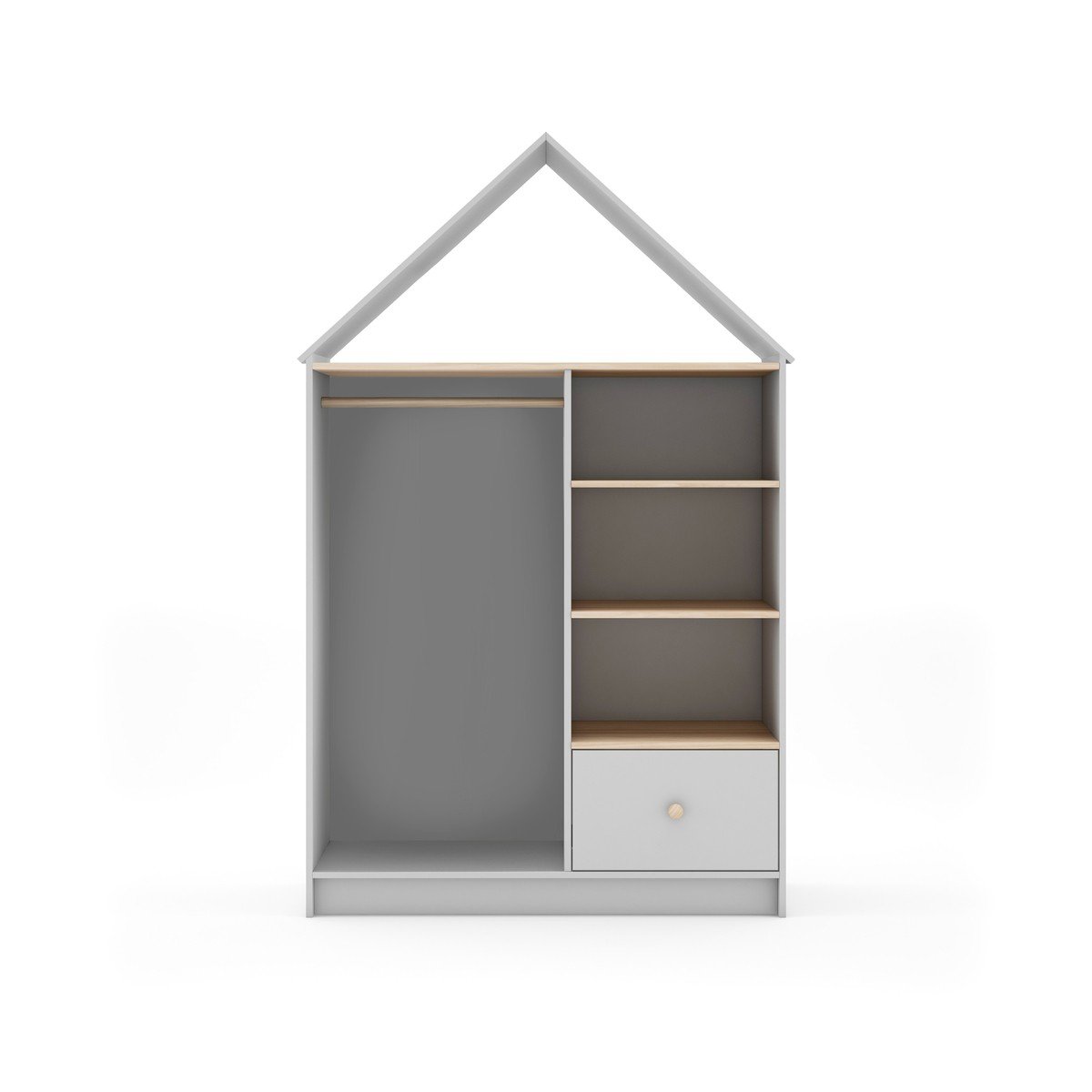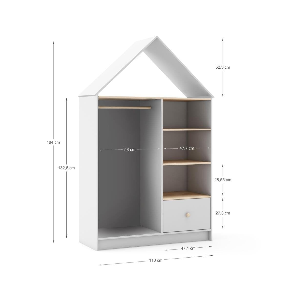 - Originele en speelse huisvorm. 3 open vakken + 1 lade + kledingroede: diverse opbergmogelijkheden.