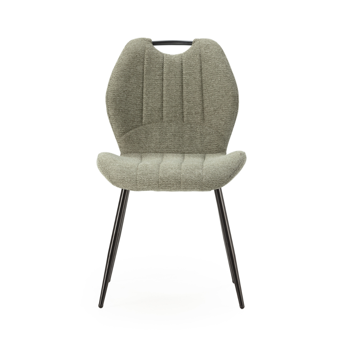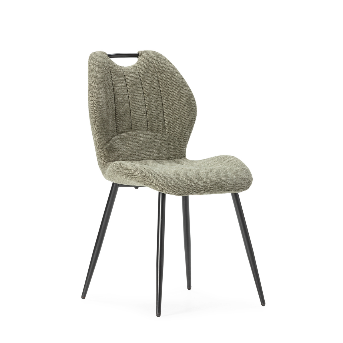 - Zit- en rugleuning: Stof, poten van zwart gelakt metaal.
