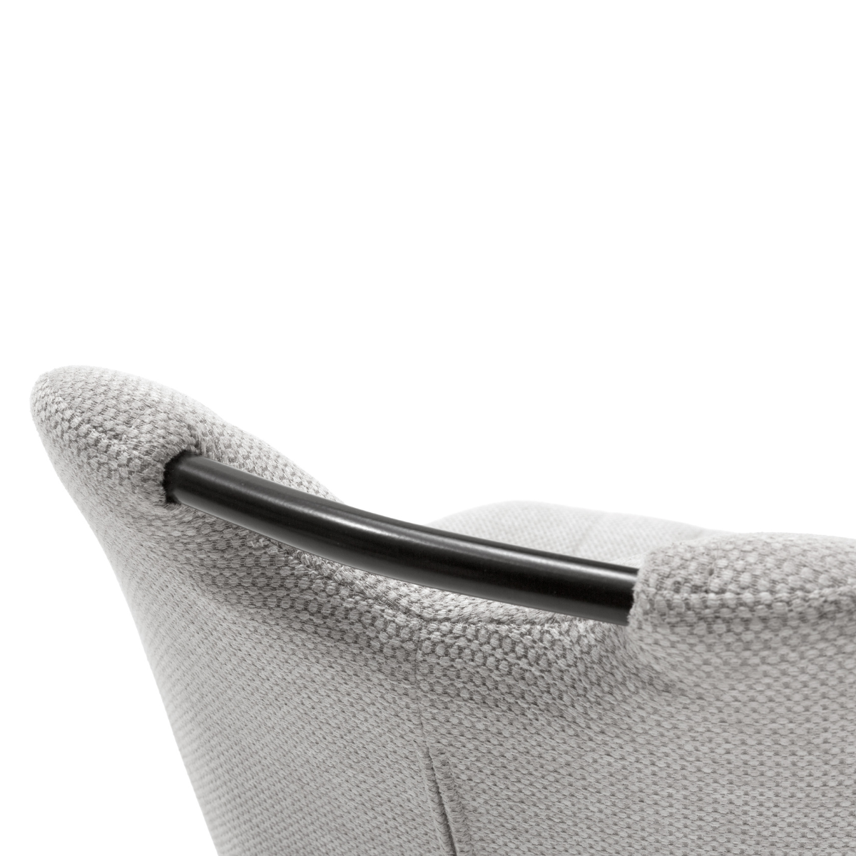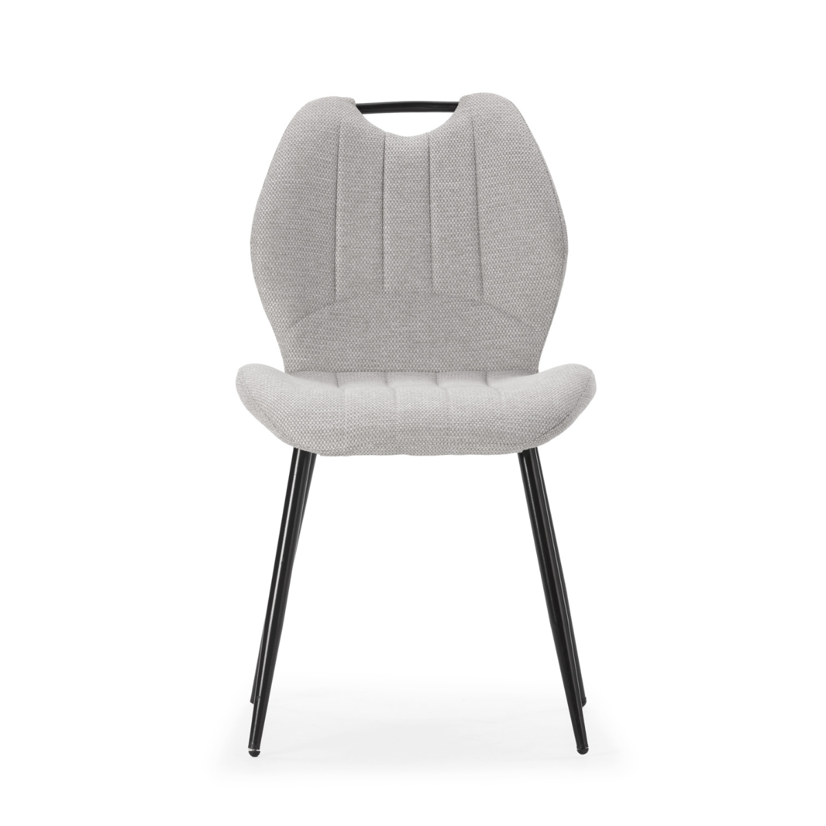 - Zit- en rugleuning: Stof, poten van zwart gelakt metaal.